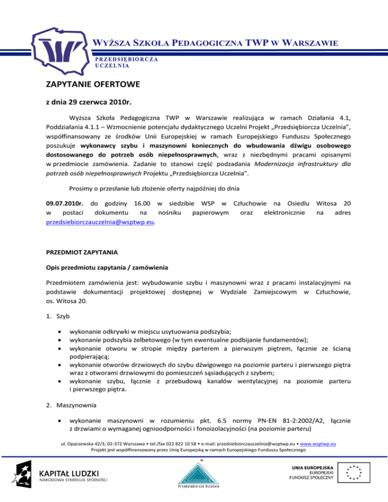WYŻSZA SZKOŁA PEDAGOGICZNA TWP W WARSZAWIE ZAPYTANIE OFERTOWE z dnia 29 czerwca 2010r. Wyższa Szkoła Pedagogiczna TWP w Warszawie realizująca w ramach Działania 4.1, Poddziałania 4.1.1 – Wzmocnienie potencjału dydaktycznego Uczelni Projekt „Przedsiębiorcza Uczelnia”, współfinansowany ze środków Unii Europejskiej w ramach Europejskiego Funduszu Społecznego poszukuje wykonawcy szybu i maszynowni koniecznych do wbudowania dźwigu osobowego dostosowanego do potrzeb osób niepełnosprawnych, wraz z niezbędnymi pracami opisanymi w przedmiocie zamówienia. Zadanie to stanowi częśd podzadania Modernizacja infrastruktury dla potrzeb osób niepełnosprawnych Projektu „Przedsiębiorcza Uczelnia”. Prosimy o przesłanie lub złożenie oferty najpóźniej do dnia 09.07.2010r. do godziny 16.00 w siedzibie WSP w Człuchowie na Osiedlu Witosa 20 w postaci dokumentu na nośniku papierowym oraz elektronicznie na adres [email protected]. PRZEDMIOT ZAPYTANIA Opis przedmiotu zapytania / zamówienia Przedmiotem zamówienia jest: wybudowanie szybu i maszynowni wraz z pracami instalacyjnymi na podstawie dokumentacji projektowej dostępnej w Wydziale Zamiejscowym w Człuchowie, os. Witosa 20. 1. Szyb wykonanie odkrywki w miejscu usytuowania podszybia; wykonanie podszybia żelbetowego (w tym ewentualne podbijanie fundamentów); wykonanie otworu w stropie między parterem a pierwszym piętrem, łącznie ze ścianą podpierającą; wykonanie otworów drzwiowych do szybu dźwigowego na poziomie parteru i pierwszego piętra wraz z otworami drzwiowymi do pomieszczeo sąsiadujących z szybem; wykonanie szybu, łącznie z przebudową kanałów wentylacyjnej na poziomie parteru i pierwszego piętra. 2. Maszynownia wykonanie maszynowni w rozumieniu pkt. 6.5 normy PN-EN 81-2:2002/A2, łącznie z drzwiami o wymaganej ognioodporności i fonoizolacyjności (na poziomie parteru) ul. Opaczewska 42/3, 02-372 Warszawa • tel./fax 022 822 10 58 • e-mail: [email protected] • www.wsptwp.eu Projekt jest współfinansowany przez Unię Europejską w ramach Europejskiego Funduszu Społecznego naprawa posadzki, malowanie lamperii, ścian i sufitu w pomieszczeniach w których został zbudowany szyb oraz od strony korytarzy; obróbka drzwi przystankowych automatycznych po ich montażu; inne prace budowlane w szybie i maszynowni związane z montażem nowego dźwigu zgodnie z projektem. 3. Instalacje elektryczne przeprowadzenie instalacji zasilającej pięcioprzewodowej 400 V i trzyprzewodowej 230 V z istniejącej rozdzielni do maszynowni, łącznie z instalacją zabezpieczeo w rozdzielni; wykonanie instalacji oświetleniowej w maszynowni i w szybie. Uwaga: tablica wstępna (z wyłącznikiem głównym) do maszynowni będzie przedmiotem dostawy z dźwigiem. przebudowa i maszynownią istniejących instalacji elektrycznych kolidujących z szybem wentylacyjnych kolidujących z szybem 4. Instalacje wentylacyjne wykonanie wentylacji szybu i maszynowni, przebudowa istniejących instalacji i maszynownią 5. Wymagania dodatkowe Wykonanie prac elektrycznych powinno byd potwierdzone protokółem z pomiarów elektrycznych podpisanym przez osobę z odpowiednimi uprawnieniami. Wykonanie prac budowlanych powinno byd potwierdzone protokółem budowlanym podpisanym przez osobę z uprawnieniami budowlanymi. Wszystkie prace powinny byd prowadzone w sposób jak najmniej uciążliwy dla użytkowników budynku. Przebudowywane drzwi na parterze i na pierwszym piętrze powinny byd osłonięte sztywną i szczelną obudową od strony korytarza na pełną jego wysokośd. 6. Wymagana dokumentacja budowlana - Projekt budowlany (wykonawczy) niezbędny do uzyskania pozwolenia na budowę, w tym dokumentacja konstrukcyjna i elektryczna (dot. zasilania dźwigu): - 4 egz. dla Urzędu Miasta, - 1 egz. dla Zamawiającego. - Projekt budowlany (powykonawczy) – liczba egz. zgodnie z przepisami. Uwaga: dostawa i montaż dźwigu, jego uruchomienie i doprowadzenie do dopuszczenia do eksploatacji przez Urząd Dozoru Technicznego jest przedmiotem odrębnego zapytania ofertowego. Wybrany wytwórca dźwigu zostanie zobowiązany do przygotowania wytycznych do zaprojektowania szybu dźwigowego wraz z maszynownią oraz do przygotowania schematu instalacji zasilającej łącznie z doborem przewodów i zabezpieczeo. WYMAGANIA TECHNICZNE DOT. DŹWIGU w tym SZYBU I MASZYNOWNI) NORMY I PRZEPISY Dźwig powinien spełniad wymagania: a) PN-EN 81-2: 2002 oraz PN-EN 81-2:2002/A2 Przepisy bezpieczeostwa dotyczące budowy i instalowania dźwigów. Częśd 2: Dźwigi hydrauliczne. b) PN-EN 81-28: 2004 Przepisy bezpieczeostwa dotyczące budowy i instalowania dźwigów. Dźwigi osobowe i towarowe. Częśd 28: Zdalne alarmowanie w dźwigach osobowych i towarowych. c) PN-EN 81-73: 2006 Przepisy bezpieczeostwa dotyczące budowy i instalowania dźwigów. Szczególne zastosowania dźwigów osobowych i towarowych. Częśd 73: Funkcjonowanie dźwigów w przypadku pożaru. d) Rozporządzeniu Ministra Infrastruktury z dnia 15.06.2002 r. w sprawie warunków technicznych, jakim powinny odpowiadad budynki i ich usytuowanie, Dz. U. Nr 75, poz. 690 z późniejszymi zmianami). CHARAKTERYSTYKA DŹWIGU 2.1 Typ dźwigu: hydrauliczny, pośredni (2:1), z siłownikiem i prowadnicami usytuowanymi z boku szybu 2.2 Rodzaj dźwigu: osobowy, przystosowany do przewozu osób niepełnosprawnych* 2.3 Udźwig: 630 kg 2.4 Prędkośd dźwigu: min. 0,4 m/s 2.5 Wysokośd podnoszenia: ok. 3,5 m 2.6 Liczba przystanków/ drzwi szybowych: 2/2 2.7 Wymiary szybu (S x G): 1550 mm x ok. 1800 mm 2.8 Wysokośd nadszybia ok. 3145 mm 2.9 Głębokośd podszybia: do uzgodnienia, po wykonaniu odkrywki: optimum 1,1 – 1,2 m, min. 0,8 m 2.10 Kasety wezwao z wyświetlaczami osadzane w murze 2.11 Kabina nieprzelotowa wymiary kabiny (S x G x H) – min.1100x1400x2120 mm 2.12 Moc silnika w zespole zasilającym – 7,7 kW * W zakresie określonym w Rozporządzeniu Ministra Infrastruktury z dnia 15.06.2002 r. w sprawie warunków