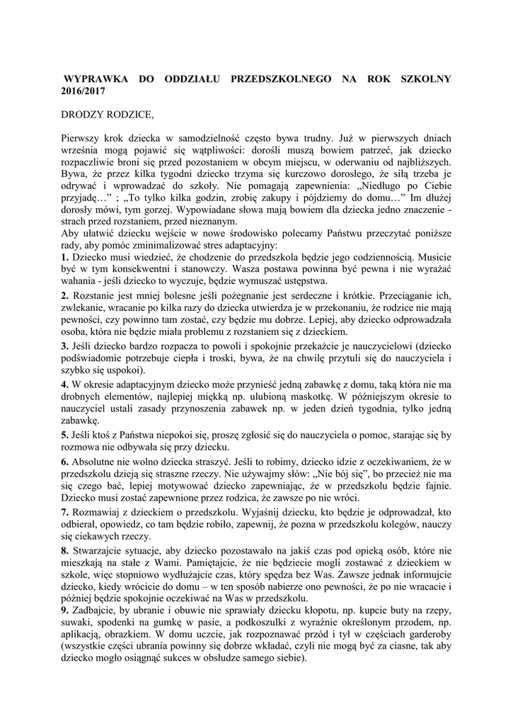 WYPRAWKA DO 2016/2017 ODDZIAŁU PRZEDSZKOLNEGO NA ROK SZKOLNY DRODZY RODZICE, Pierwszy krok dziecka w samodzielność często bywa trudny. Już w pierwszych dniach września mogą pojawić się wątpliwości: dorośli muszą bowiem patrzeć, jak dziecko rozpaczliwie broni się przed pozostaniem w obcym miejscu, w oderwaniu od najbliższych. Bywa, że przez kilka tygodni dziecko trzyma się kurczowo dorosłego, że siłą trzeba je odrywać i wprowadzać do szkoły. Nie pomagają zapewnienia: „Niedługo po Ciebie przyjadę…” ; „To tylko kilka godzin, zrobię zakupy i pójdziemy do domu…” Im dłużej dorosły mówi, tym gorzej. Wypowiadane słowa mają bowiem dla dziecka jedno znaczenie strach przed rozstaniem, przed nieznanym. Aby ułatwić dziecku wejście w nowe środowisko polecamy Państwu przeczytać poniższe rady, aby pomóc zminimalizować stres adaptacyjny: 1. Dziecko musi wiedzieć, że chodzenie do przedszkola będzie jego codziennością. Musicie być w tym konsekwentni i stanowczy. Wasza postawa powinna być pewna i nie wyrażać wahania - jeśli dziecko to wyczuje, będzie wymuszać ustępstwa. 2. Rozstanie jest mniej bolesne jeśli pożegnanie jest serdeczne i krótkie. Przeciąganie ich, zwlekanie, wracanie po kilka razy do dziecka utwierdza je w przekonaniu, że rodzice nie mają pewności, czy powinno tam zostać, czy będzie mu dobrze. Lepiej, aby dziecko odprowadzała osoba, która nie będzie miała problemu z rozstaniem się z dzieckiem. 3. Jeśli dziecko bardzo rozpacza to powoli i spokojnie przekażcie je nauczycielowi (dziecko podświadomie potrzebuje ciepła i troski, bywa, że na chwilę przytuli się do nauczyciela i szybko się uspokoi). 4. W okresie adaptacyjnym dziecko może przynieść jedną zabawkę z domu, taką która nie ma drobnych elementów, najlepiej miękką np. ulubioną maskotkę. W późniejszym okresie to nauczyciel ustali zasady przynoszenia zabawek np. w jeden dzień tygodnia, tylko jedną zabawkę. 5. Jeśli ktoś z Państwa niepokoi się, proszę zgłosić się do nauczyciela o pomoc, starając się by rozmowa nie odbywała się przy dziecku. 6. Absolutne nie wolno dziecka straszyć. Jeśli to robimy, dziecko idzie z oczekiwaniem, że w przedszkolu dzieją się straszne rzeczy. Nie używajmy słów: „Nie bój się”, bo przecież nie ma się czego bać, lepiej motywować dziecko zapewniając, że w przedszkolu będzie fajnie. Dziecko musi zostać zapewnione przez rodzica, że zawsze po nie wróci. 7. Rozmawiaj z dzieckiem o przedszkolu. Wyjaśnij dziecku, kto będzie je odprowadzał, kto odbierał, opowiedz, co tam będzie robiło, zapewnij, że pozna w przedszkolu kolegów, nauczy się ciekawych rzeczy. 8. Stwarzajcie sytuacje, aby dziecko pozostawało na jakiś czas pod opieką osób, które nie mieszkają na stałe z Wami. Pamiętajcie, że nie będziecie mogli zostawać z dzieckiem w szkole, więc stopniowo wydłużajcie czas, który spędza bez Was. Zawsze jednak informujcie dziecko, kiedy wrócicie do domu – w ten sposób nabierze ono pewności, że po nie wracacie i później będzie spokojnie oczekiwać na Was w przedszkolu. 9. Zadbajcie, by ubranie i obuwie nie sprawiały dziecku kłopotu, np. kupcie buty na rzepy, suwaki, spodenki na gumkę w pasie, a podkoszulki z wyraźnie określonym przodem, np. aplikacją, obrazkiem. W domu uczcie, jak rozpoznawać przód i tył w częściach garderoby (wszystkie części ubrania powinny się dobrze wkładać, czyli nie mogą być za ciasne, tak aby dziecko mogło osiągnąć sukces w obsłudze samego siebie). 10. Dbajcie, aby dziecko było nauczone sprzątania po sobie: zabawek, ubrań, dzielenia się zabawkami. Przestrzegało zawartych z Wami umów w powyższych sprawach oraz zasad postępowania wobec Was i innych, np. mówiło dziękuję, nie oddalało się poza wyznaczone miejsce itp. 11. Uczciwe udzielajcie informacji na temat swojego dziecka (nawyki, choroby itp.), służą one temu, aby wspomagać dziecko i pozostaną wyłącznie do mojej wiedzy. Poniżej informacje dotyczące wyprawki do oddziału przedszkolnego: 1. Książki do oddziału przedszkolnego będą zamawiane we wrześniu. „Kolorowy start. Pięciolatek i sześciolatek” autorstwa Wiesławy Żaby – Żabińskiej (Wydawnictwo Mac Edukacja). Książki do religii i języka angielskiego będą również zamawiane we wrześniu. 2. Strój gimnastyczny w worku: biała bawełniana bluzka z krótkim rękawkiem, krótkie spodenki granatowe lub czarne, długie spodnie dresowe. Worek oraz wszystkie elementy stroju należy podpisać. 3. Dodatkowo: kapcie najlepiej na białej gumowej podeszwie; podpisana szczoteczka, kubek oraz pasta do zębów; mały plecak, śniadaniówka; podpisana podkładka na śniadanie; ubranie zapasowe w dodatkowym woreczku; chusteczki higieniczne (100 sztuk) wyciągane z pudełka; opakowanie chusteczek nawilżających; ręczniki papierowe (2 rolki); mydło w płynie ryza białego papieru do ksero jednorazowe, plastikowe kubeczki do picia wody Na pozostałe rzeczy z wyprawki będziemy składać się na początku roku szkolnego, którą zakupi nauczyciel w jednakowych egzemplarzach. Strona internetowa szkoły www.spswiatniki.sobotka.pl W szkole obowiązuje jednolity strój galowy: dziewczynki – biała bluzka, granatowa lub czarna spódniczka; chłopcy – biała bluzka, granatowe lub czarne spodnie.