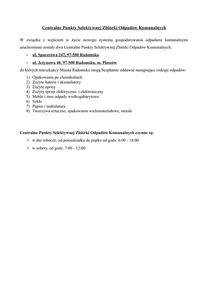 Centralne Punkty Selektywnej Zbiórki Odpadów Komunalnych W związku z wejściem w życie nowego systemu gospodarowania odpadami komunalnymi uruchomione zostały dwa Centralne Punkty Selektywnej Zbiórki Odpadów Komunalnych: – ul. Spacerowa 247, 97-500 Radomsko – ul. Jeżynowa 40, 97-500 Radomsko, m. Płoszów do których mieszkańcy Miasta Radomsko mogą bezpłatnie oddawać następujące rodzaje odpadów: 1) 2) 3) 4) 5) 6) 7) 8) Opakowania po chemikaliach Zużyte baterie i akumulatory Zużyte opony Zużyty sprzęt elektryczno- i elektroniczny Meble i inne odpady wielkogabarytowe Szkło Papier i makulatura Tworzywa sztuczne, opakowania wielomateriałowe, metale Centralne Punkty Selektywnej Zbiórki Odpadów Komunalnych czynne są: • w dni robocze, od poniedziałku do piątku od godz. 6:00 - 18:00 • w soboty, od godz. 7:00 - 12:00