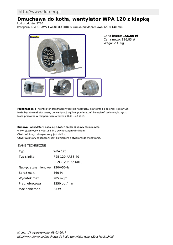 Dmuchawa do kotła, wentylator WPA 120 z klapką