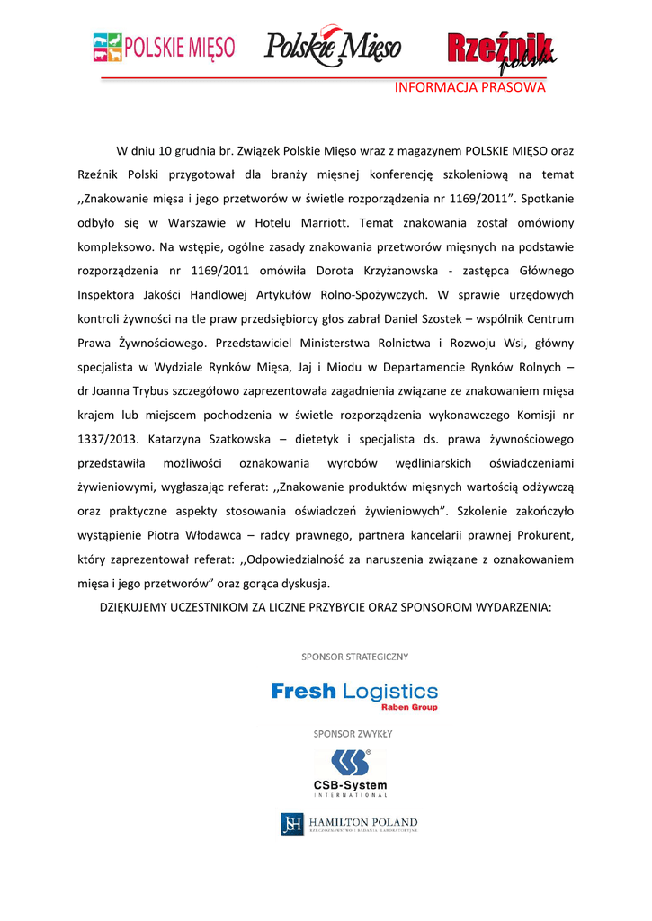 INFORMACJA PRASOWA W dniu 10 grudnia br. Związek Polskie Mięso wraz z magazynem POLSKIE MIĘSO oraz Rzeźnik Polski przygotował dla branży mięsnej konferencję szkoleniową na temat ,,Znakowanie mięsa i jego przetworów w świetle rozporządzenia nr 1169/2011”. Spotkanie odbyło się w Warszawie w Hotelu Marriott. Temat znakowania został omówiony kompleksowo. Na wstępie, ogólne zasady znakowania przetworów mięsnych na podstawie rozporządzenia nr 1169/2011 omówiła Dorota Krzyżanowska - zastępca Głównego Inspektora Jakości Handlowej Artykułów Rolno-Spożywczych. W sprawie urzędowych kontroli żywności na tle praw przedsiębiorcy głos zabrał Daniel Szostek – wspólnik Centrum Prawa Żywnościowego. Przedstawiciel Ministerstwa Rolnictwa i Rozwoju Wsi, główny specjalista w Wydziale Rynków Mięsa, Jaj i Miodu w Departamencie Rynków Rolnych – dr Joanna Trybus szczegółowo zaprezentowała zagadnienia związane ze znakowaniem mięsa krajem lub miejscem pochodzenia w świetle rozporządzenia wykonawczego Komisji nr 1337/2013. Katarzyna Szatkowska – dietetyk i specjalista ds. prawa żywnościowego przedstawiła możliwości oznakowania wyrobów wędliniarskich oświadczeniami żywieniowymi, wygłaszając referat: ,,Znakowanie produktów mięsnych wartością odżywczą oraz praktyczne aspekty stosowania oświadczeń żywieniowych”. Szkolenie zakończyło wystąpienie Piotra Włodawca – radcy prawnego, partnera kancelarii prawnej Prokurent, który zaprezentował referat: ,,Odpowiedzialność za naruszenia związane z oznakowaniem mięsa i jego przetworów” oraz gorąca dyskusja. DZIĘKUJEMY UCZESTNIKOM ZA LICZNE PRZYBYCIE ORAZ SPONSOROM WYDARZENIA: