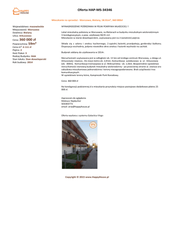 Oferta HAP-MS-34346 Mieszkanie na sprzedaż - Warszawa, Bielany, 58.91m², 360 000zł Województwo: mazowieckie Miejscowość: Warszawa Dzielnica: Bielany Ulica: Arkuszowa Cena: 360 000 zł Powierzchnia: 59m² Cena m²: 6 111 zł Piętro: 2 Ilość Pokoi: 3 Rodzaj Budynku: blok Stan lokalu: Stan deweloperski Rok budowy: 2014 WYNAGRODZENIE POŚREDNIKA W PEŁNI POKRYWA WŁAŚCICIEL! ! Lokal mieszkalny położony w Warszawie, na Bielanach w budynku mieszkalnym wielorodzinnym 3-kondygnacyjnym, o pow. użytkowej 58,91 m2. Mieszkanie w stanie deweloperskim, usytuowany jest na 2 (ostatnim) piętrze. Składa się z salonu i aneksu kuchennego, 2 sypialni, łazienki, przedpokoju, garderoby i balkonu. Ekspozycja wschodnia, jedynie niewielkie okno aneksu i łazienki wychodzi na zachód. Budynek oddany do użytkowania w 2014r. Nieruchomość usytuowana jest w odległości ok. 12 km od ścisłego centrum Warszawy, u zbiegu ul. Arkuszowej i Jowisza.. Do stacji metra ok. 2,8 km. Komunikacja autobusowa w ul. Arkuszowej (ok. 300m). Komunikacja tramwajowa w ul. Wólczyńskiej - ok. 1,5km. Bezpośrednie sąsiedztwo nieruchomości stanowią budynek mieszkalny wielorodzinny - po przeciwnej stronie ul. Jowisza ora zabudowa mieszkaniowa jednorodzinna i tereny niezagospodarowane. Brak uciążliwości tras komunikacyjnych. W sąsiedztwie tereny leśne, Kampinoski Park Narodowy. Cena: 360 000 zł Na kondygnacji podziemnej d o mieszkania przynależy miejsce postojowe dodatkowo płatne 25 000 zł. Zapraszam do oglądania Mateusz Najdychor 503303773 email: [email protected] Oferta wysłana z systemu Galactica Virgo Copyright © 2015 www.HappyHouse.pl