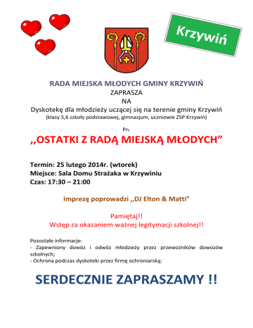 RADA MIEJSKA MŁODYCH GMINY KRZYWIŃ ZAPRASZA NA Dyskotekę dla młodzieży uczącej się na terenie gminy Krzywiń (klasy 5,6 szkoły podstawowej, gimnazjum, uczniowie ZSP Krzywiń) Pn. ,,OSTATKI Z RADĄ MIEJSKĄ MŁODYCH” Termin: 25 lutego 2014r. (wtorek) Miejsce: Sala Domu Strażaka w Krzywiniu Czas: 17:30 – 21:00 Imprezę poprowadzi ,,DJ Elton & Matti” Pamiętaj!! Wstęp za okazaniem ważnej legitymacji szkolnej!! Pozostałe informacje: - Zapewniony dowóz i odwóz młodzieży przez przewoźników dowozów szkolnych; - Ochrona podczas dyskoteki przez firmę ochroniarską; SERDECZNIE ZAPRASZAMY !!