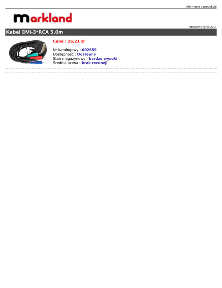 Informacje o produkcie Utworzono 08-03-2017 Kabel DVI-3*RCA 5,0m Cena : 26,21 zł Nr katalogowy : 002659 Dostępność : Dostępny Stan magazynowy : bardzo wysoki Średnia ocena : brak recenzji
