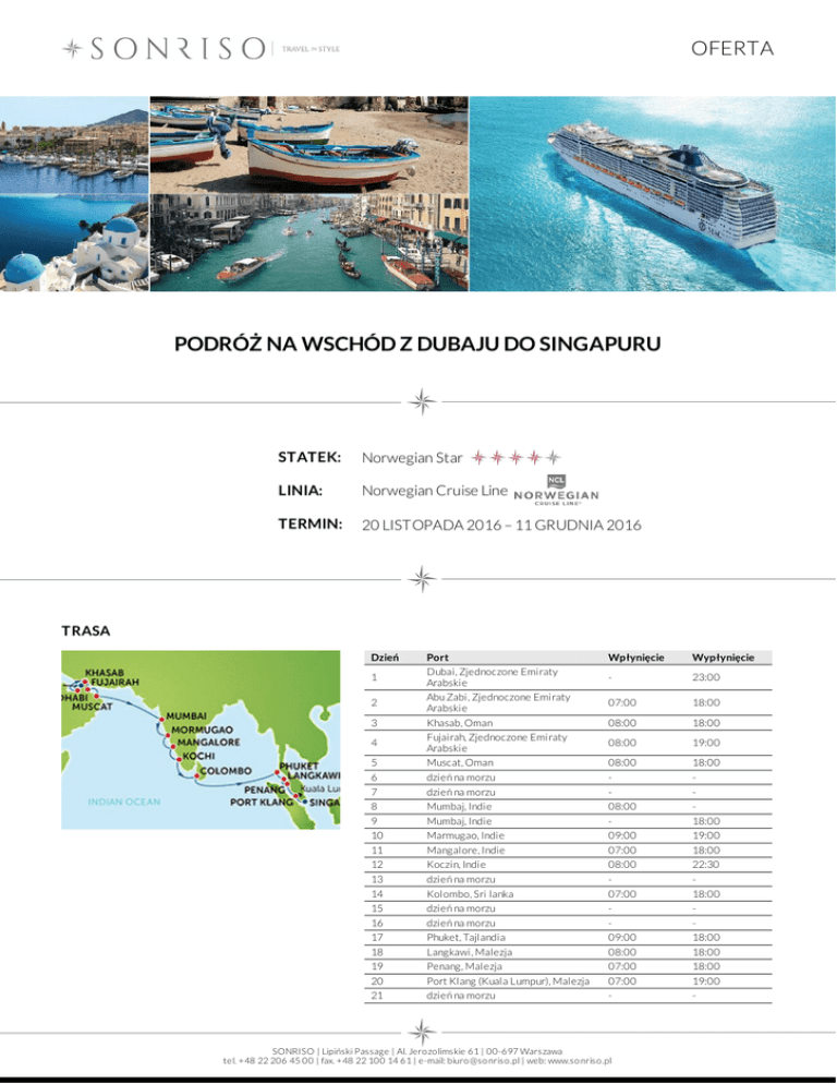 OFERTA PODRÓŻ NA WSCHÓD Z DUBAJU DO SINGAPURU STATEK: Norwegian Star LINIA: Norwegian Cruise Line TERMIN: 20 LISTOPADA 2016 – 11 GRUDNIA 2016 TRASA Dzień 1 2 3 4 5 6 7 8 9 10 11 12 13 14 15 16 17 18 19 20 21 Port Dubai, Zjednoczone Emiraty Arabskie Abu Zabi, Zjednoczone Emiraty Arabskie Khasab, Oman Fujairah, Zjednoczone Emiraty Arabskie Muscat, Oman dzień na morzu dzień na morzu Mumbaj, Indie Mumbaj, Indie Marmugao, Indie Mangalore, Indie Koczin, Indie dzień na morzu Kolombo, Sri lanka dzień na morzu dzień na morzu Phuket, Tajlandia Langkawi, Malezja Penang, Malezja Port Klang (Kuala Lumpur), Malezja dzień na morzu Wpłynięcie Wypłynięcie - 23:00 07:00 18:00 08:00 18:00 08:00 19:00 08:00 08:00 09:00 07:00 08:00 07:00 09:00 08:00 07:00 07:00 - 18:00 18:00 19:00 18:00 22:30 18:00 18:00 18:00 18:00 19:00 - SONRISO | Lipiński Passage | Al. Jero zo limskie 61 | 00-697 Warszawa tel. +48 22 206 45 00 | fax. +48 22 100 14 61 | e-mail: biuro @so nriso .pl | web: www.so nriso .pl OFERTA Dzień Port Wpłynięcie Wypłynięcie 22 Singapur 06:00 - CENA Typ kabiny Cena z osobę Kabina wewnętrzna od 2 039 EUR Kabina z oknem od 2 249 EUR Kabina z balkonem od 2 759 EUR Family Suite od 5 099 EUR CENA ZAWIERA DOTATKOWE OPŁATY zakwaterowanie w 2 - os. kabinie wybranej kategorii pełne wyżywienie: 3 posiłki, przekąski między posiłakmi, bufet o północy napoje do posiłków: woda stołowa, kawa, herbata oraz sok do śniadania serwis bagażowy podczas wejścia i zejścia ze statku 24 godzinny serwis kabinowy korzystanie z urządzeń sportowo - rekreacyjnych dostępnych na pokładzie (baseny, jacuzzi, boiska sportowe, kluby dla dzieci i młodzieży itp.) udział we wszystkich imprezach organizowanych na pokładzie (przedstawienia, pokazy, aukcje, animacje i inne) obowiązkowe opłaty portowe dojazd/przelot do portu rozpoczęcia i zakończenia rejsu transfery (lotnisko - port - lotnisko) ewentualne noclegi przed lub po rejsie wycieczki fakultatywne napoje: bezalkoholowe, alkoholowe, woda mineralna dostępne w restauracjach i barach (istnieje możliwość wykupienia pakietów napojów, o szczegóły zapytaj w biurze) korzystanie z mini baru w kabinie korzystanie z usług typu: SPA, salon piękności, pralnia itp. wydatki osobiste tj. zakupy w butikach, internet, kasyno itp. obowiązkowa opłata serwisowa (napiwki dla obsługi statku ok. 12 USD/os. dorosła/dzień, dzieci poniżej 3 lat nie płacą) obowiązkowe ubezpieczenie turystyczne koszt wymaganych wiz ewentualna opłata paliwowa (linia w momencie wzrotu cen ropy zastrzega sobie prawo do dodania oplaty paliwowej do każdej rezerwacji) Na życzenie świadczymy dodatkowo usługi: rezerwacje hotelowe na całym świecie rezerwacje biletów lotniczych, trasferów oraz parkingu w porcie rezerwacje wycieczek fakultatywnych i innych atrakcji SONRISO | Lipiński Passage | Al. Jero zo limskie 61 | 00-697 Warszawa tel. +48 22 206 45 00 | fax. +48 22 100 14 61 | e-mail: biuro @so nriso .pl | web: www.so nriso .pl