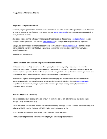 Regulamin Sarenza Flash Regulamin usługi Sarenza Flash Sarenza proponuje klientom abonament Sarenza Flash za 40 zł rocznie. Usługa ekspresowej dostawy w 24h na wszystkie zamówienia złożone na stronie www.sarenza.pl z zastrzeżeniem postanowień, o których mowa poniżej. Zapisanie sie na płatną usługę wymaga uprzedniej akceptacji Regulaminu (dostępny tutaj), naszej Polityki Ochrony Danych Osobowych (dostępna tutaj), z którymi klient uprzednio się zapoznał. Usługa jest aktywna od momentu zapisania się na nią na stronie www.sarenza.pl z zastrzeżeniem potwierdzenia zapłaty. Przy każdym logowaniu na stronie, klient zostaje zidentyfikowany jako beneficjent usługi. Abonament jest imienny. Termin ważności oraz warunki wypowiedzenia abonamentu. Niniejsza umowa zostaje zawarta na okres początkowy trwający rok począwszy od momentu kliknięcia na przycisk “Zapisuję się na Sarenza Flash za 40 zł rocznie”. Przycisk ten dostępny jest na stronie wyboru sposobu dostawy. Do aktywowania usługi niezbędne jest zatwierdzenie płatności oraz zaznaczenie opcji „Zapoznałem się z Regulaminem usługi Sarenza Flash”. Abonemant będzie automatycznie przedłużony na kolejny rok licząc od daty zakończenia okresu początkowego. Aby rozwiązać umowę należy wysłać e-mail do Obsługi Klienta (dostępna tutaj) respektując okres miesięcznego wypowiedzenia (co najmniej miesiąc przed upływem roku od zapisania się na usługę). Prawo odstąpienia od umowy Klient posiada prawo odstąpienia od umowy w terminie do 14 dni od momentu zapisania się na usługę, bez podania przyczyny. Klient powinien zawiadomić pisemne o zerwaniu umowy Obsługę Klienta Sarenza, zlokalizowaną pod adresem 27/29, rue de Choiseul – 75002 Paris, przed upływem 14 dni. W przypadku odstąpienia od umowy Klient otrzyma zwrot pieniędzy. Formularz odstąpienia od umowy jest dostępny na końcu tego dokumentu. Warunki płatności Klient musi uiścić opłatę w momencie zapisywania się na usługę. Dodatkowa linia pojawia się w podsumowaniu zamówienia jak również w fakturze za zamówienie. Sarenza zastrzega sobie prawo do zmiany warunków oferty i stawek. Klient zostanie poinformowany o każdej zmianie przed odnowieniem abonamentu. W przypadku przedłużenia subskrypcji na kolejny rok odpowiednia kwota zostanie automatycznie pobrana z konta bankowego Klienta dokładnie rok po tym jak umowa została zawarta. Klauzula siły wyższej Firma Sarenza nie może być pociągnieta do odpowiedzialności za naruszenie warunków umowy z powodu działania siły wyższej. Ograniczenia Dostawa w ciągu 24 godzin z usługą Sarenza Flash nie jest zagwarantowana dla zamówień złożonych podczas Świąt oraz dni wolnych od pracy lub w dniu poprzedzającym Święta i dni wolne od pracy oraz w piątek – w tym przypadku zamówienie będzie wysłane w poniedziałek. Zamówienie złożone po 12 od poniedziałku do czwartku będzie wysłane następnego dnia roboczego. Ograniczenia dotyczące adresów doręczenia : podczas składania zamówienia w momencie wprowadzenia adresu pojawi się informacja mówiąca o tym czy przy danym kodzie pocztowym usługa dostawy w ciągu 24 godzin jest dostępna, zostanie określony również planowany termin doręczenia. Ograniczenia dotyczące produktów : nie wszystkie dostępne na stronie www.sarenza.pl artykuły można zamówić z usługą Sarenza Flash. Lista produtów wykluczonych znajduje się pod linkiem [#LIENVERSPDTSEXCLUS]. W przypadku zamówienia produktu z powyższej listy usługa Sarenza Flash nie będzie mogła być zrealizowana. Klient powinien wtedy wybrać opcję dostawy standardowej. Zamówienie będzie wysłane przez GLS Standard. Opcja płatności za pobraniem oraz przez przelew tradycyjny nie jest dostępna przy usłudze Sarenza Flash. Przy zamówieniach składanych za pomocą aplikacji mobilnej usługa Sarenza Flash nie będzie aktywna. Dostawa w ciągu 24 godzin nie będzie zapewniona w okresie od 29 czerwca do 7 września. Podczas tego okresu doręczenie może się wydłużyć do 48 godzin. Klient będzie poinformowany o ewentualnych opóźnieniach drogą mailową. Podczas tego okresu (od 29 czerwca do 7 września) opcja zapisania się do usługi Sarenza Flash nie będzie dostępna. Wymiana i zwroty produktów Warunki wymian/zwrotów są wyszczególnione w regulaminie (dostępnym pod linkiem). FORMULARZ WYPOWIEDZENIA Wypełnij i wyślij powyższy formularz tylko i wyłącznie jeśli chcesz odstąpić od umowy przed upływem okresu wypowiedzenia. SARENZA Service Clients 27-29, rue de Choiseul 75002 Paris NAZWISKO: ______________________________________________ IMIĘ: _________________________________________ Niniejszym zawiadamiam o wycofaniu się z umowy sprzedaży uslugi: • Zamówionej ___/___/______ [data] i otrzymanej ___/___/______ [data] • Dostarczonej pod następującym adresem : ______________________________________________________ Podpis klienta: Data : ___/___/______ Wypełnienie poniższych infromacji jest obowiązkowe: imię oraz nazwisko, data zamówienia oraz otrzymania produktu, adres dostawy oraz termin wypowiedzenia umowy.