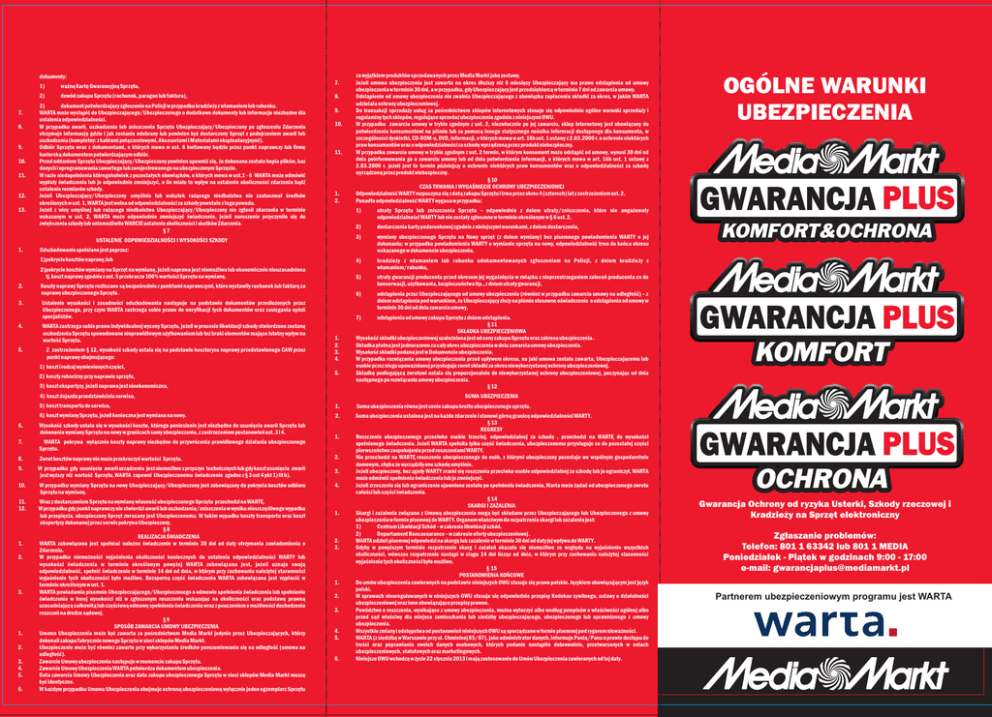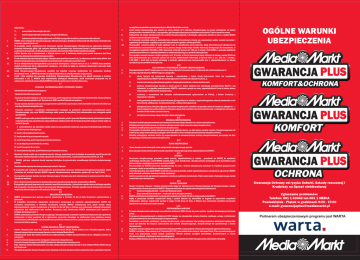 dokumenty: 7. 8. 9. 10. 11. 12. 13. 1) wa¿n¹ Kartê Gwarancyjn¹ Sprzêtu, 2) dowód zakupu Sprzêtu (rachunek, paragon lub faktura), 3) dokument potwierdzaj¹cy zg³oszenie na Policji w przypadku kradzie¿y z w³amaniem lub rabunku. WARTA mo¿e wyst¹piæ do Ubezpieczaj¹cego/Ubezpieczonego o dodatkowe dokumenty lub informacje niezbêdne dla ustalenia odpowiedzialnoœci. W przypadku awarii, uszkodzenia lub zniszczenia Sprzêtu Ubezpieczaj¹cy/Ubezpieczony po zg³oszeniu Zdarzenia otrzymuje informacjê gdzie i jak zostanie odebrany lub powinien byæ dostarczony Sprzêt z podejrzeniem awarii lub uszkodzenia (kompletny: z kablami po³¹czeniowymi, Akcesoriami i Materia³ami eksploatacyjnymi). Odbiór Sprzêtu wraz z dokumentami, o których mowa w ust. 6 kwitowany bêdzie przez punkt naprawczy lub firmê kuriersk¹ dokumentem potwierdzaj¹cym odbiór. Przed oddaniem Sprzêtu Ubezpieczaj¹cy/Ubezpieczony powinien upewniæ siê, ¿e dokonana zosta³a kopia plików, baz danych i oprogramowania zawartego lub zarejestrowanego na ubezpieczonym Sprzêcie. W razie niedope³nienia któregokolwiek z pozosta³ych obowi¹zków, o których mowa w ust.1 - 6 WARTA mo¿e odmówiæ wyp³aty œwiadczenia lub je odpowiednio zmniejszyæ, o ile mia³o to wp³yw na ustalenie okolicznoœci zdarzenia b¹dŸ ustalenie rozmiarów szkody. Je¿eli Ubezpieczaj¹cy/Ubezpieczony umyœlnie lub wskutek ra¿¹cego niedbalstwa nie zastosowa³ œrodków okreœlonych w ust. 1, WARTA jest wolna od odpowiedzialnoœci za szkody powsta³e z tego powodu. Je¿eli z winy umyœlnej lub ra¿¹cego niedbalstwa Ubezpieczaj¹cy/Ubezpieczony nie zg³osi³ zdarzenia w terminie wskazanym w ust. 2, WARTA mo¿e odpowiednio zmniejszyæ œwiadczenie, je¿eli naruszenie przyczyni³o siê do zwiêkszenia szkody lub uniemo¿liwi³o WARCIE ustalenie okolicznoœci i skutków Zdarzenia. §7 7. 8. 9. 10. 11. 1. 2. USTALENIE ODPOWIEDZIALNOŒCI I WYSOKOŒCI SZKODY 1. za wyj¹tkiem produktów sprzedawanych przez Media Markt jako zestawy. Je¿eli umowa ubezpieczenia jest zawarta na okres d³u¿szy ni¿ 6 miesiêcy Ubezpieczaj¹cy ma prawo odst¹pienia od umowy ubezpieczenia w terminie 30 dni, a w przypadku, gdy Ubezpieczaj¹cy jest przedsiêbiorc¹ w terminie 7 dni od zawarcia umowy. Odst¹pienie od umowy ubezpieczenia nie zwalnia Ubezpieczaj¹cego z obowi¹zku zap³acenia sk³adki za okres, w jakim WARTA udziela³a ochrony ubezpieczeniowej. Do transakcji sprzeda¿y us³ug za poœrednictwem sklepów internetowych stosuje siê odpowiednio ogólne warunki sprzeda¿y i regulaminy tych sklepów, reguluj¹ce sprzeda¿ ubezpieczenia zgodnie z niniejszymi OWU. W przypadku zawarcia umowy w trybie zgodnym z ust. 2, niezw³ocznie po jej zawarciu, sklep internetowy jest obowi¹zany do potwierdzenia konsumentowi na piœmie lub za pomoc¹ innego statycznego noœnika informacji dostêpnego dla konsumenta, w szczególnoœci dyskietki, CD-ROM-u, DVD, informacji, o których mowa w art. 16b ust. 1 ustawy z 2.03.2000 r. o ochronie niektórych praw konsumentów oraz o odpowiedzialnoœci za szkodê wyrz¹dzon¹ przez produkt niebezpieczny. W przypadku zawarcia umowy w trybie zgodnym z ust. 2 termin, w którym konsument mo¿e odst¹piæ od umowy, wynosi 30 dni od dnia poinformowania go o zawarciu umowy lub od dnia potwierdzenia informacji, o których mowa w art. 16b ust. 1 ustawy z 2.03.2000 r. je¿eli jest to termin póŸniejszy o ochronie niektórych praw konsumentów oraz o odpowiedzialnoœci za szkodê wyrz¹dzon¹ przez produkt niebezpieczny. § 10 CZAS TRWANIA I WYGAŒNIÊCIE OCHRONY UBEZPIECZENIOWEJ Odpowiedzialnoœæ WARTY rozpoczyna siê z dat¹ zakupu Sprzêtu i trwa przez okres 4 (czterech) lat z zastrze¿eniem ust. 2. Ponadto odpowiedzialnoœæ WARTY wygasa w przypadku: 1) utraty Sprzêtu lub zniszczenia Sprzêtu – odpowiednio z dniem utraty/zniszczenia, które nie anga¿owa³y odpowiedzialnoœci WARTY lub nie zosta³y zg³oszone w terminie okreœlonym w § 6 ust. 2, 2) dostarczenia karty podarunkowej zgodnie z niniejszymi warunkami, z dniem dostarczenia, 3) wymiany ubezpieczonego Sprzêtu na Nowy sprzêt (z dniem wymiany) bez pisemnego powiadomienia WARTY o jej dokonaniu; w przypadku powiadomienia WARTY o wymianie sprzêtu na nowy, odpowiedzialnoœæ trwa do koñca okresu wskazanego w dokumencie ubezpieczenia, 4) kradzie¿y z w³amaniem lub rabunku udokumentowanych zg³oszeniem na Policji, z dniem kradzie¿y z w³amaniem/rabunku, Odszkodowanie spe³niane jest poprzez: 1)pokrycie kosztów naprawy,lub 2)pokrycie kosztów wymiany na Sprzêt na wymianê, je¿eli naprawa jest niemo¿liwa lub ekonomicznie nieuzasadniona tj. koszt naprawy zgodnie z ust. 5 przekracza 100% wartoœci Sprzêtu na wymianê. 5) Koszty naprawy Sprzêtu rozliczane s¹ bezpoœrednio z punktami naprawczymi, które wystawi³y rachunek lub fakturê za naprawê ubezpieczonego Sprzêtu . utraty gwarancji producenta przed okresem jej wygaœniêcia w zwi¹zku z nieprzestrzeganiem zaleceñ producenta co do konserwacji, u¿ytkowania, bezpieczeñstwa itp., z dniem utraty gwarancji, 6) 3. Ustalenie wysokoœci i zasadnoœci odszkodowania nastêpuje na podstawie dokumentów przed³o¿onych przez Ubezpieczonego, przy czym WARTA zastrzega sobie prawo do weryfikacji tych dokumentów oraz zasiêgania opinii specjalistów. odst¹pienia przez Ubezpieczaj¹cego od umowy ubezpieczenia (równie¿ w przypadku zawarcia umowy na odleg³oœæ) – z dniem odst¹pienia pod warunkiem, ¿e Ubezpieczaj¹cy z³o¿y na piœmie stosowne oœwiadczenie o odst¹pieniu od umowy w terminie 30 dni od dnia zawarcia umowy, 7) 4. WARTA zastrzega sobie prawo indywidualnej wyceny Sprzêtu, je¿eli w procesie likwidacji szkody stwierdzone zostan¹ uszkodzenia Sprzêtu spowodowane nieprawid³owym u¿ytkowaniem lub te¿ braki elementów maj¹ce istotny wp³yw na wartoœæ Sprzêtu. 5. Z zastrze¿eniem § 12, wysokoœæ szkody ustala siê na podstawie kosztorysu naprawy przedstawionego CAW przez punkt naprawy obejmuj¹cego: 2. 1. 2. 3. 4. 1