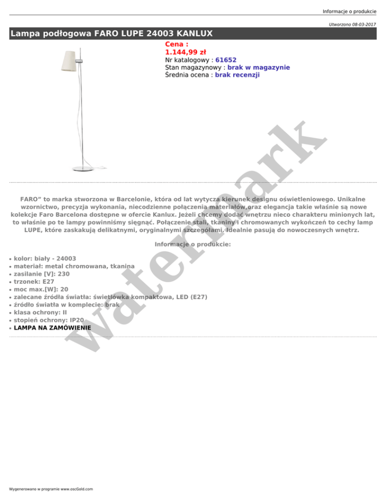 Informacje o produkcie Utworzono 08-03-2017 Lampa podłogowa FARO LUPE 24003 KANLUX Cena : 1.144,99 zł er m ar k Nr katalogowy : 61652 Stan magazynowy : brak w magazynie Średnia ocena : brak recenzji FARO” to marka stworzona w Barcelonie, która od lat wytycza kierunek designu oświetleniowego. Unikalne wzornictwo, precyzja wykonania, niecodzienne połączenia materiałów,oraz elegancja takie właśnie są nowe kolekcje Faro Barcelona dostępne w ofercie Kanlux. Jeżeli chcemy dodać wnętrzu nieco charakteru minionych lat, to właśnie po te lampy powinniśmy sięgnąć. Połączenie stali, tkaniny i chromowanych wykończeń to cechy lamp LUPE, które zaskakują delikatnymi, oryginalnymi szczegółami. Idealnie pasują do nowoczesnych wnętrz. Informacje o produkcie: ● ● ● ● ● ● ● ● kolor: biały - 24003 materiał: metal chromowana, tkanina zasilanie [V]: 230 trzonek: E27 moc max.[W]: 20 zalecane źródła światła: świetlówka kompaktowa, LED (E27) źródło światła w komplecie: brak klasa ochrony: II stopień ochrony: IP20 LAMPA NA ZAMÓWIENIE at ● w ● Wygenerowano w programie www.oscGold.com