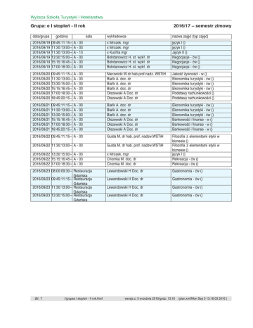 Wyższa Szkoła Turystyki i Hotelarstwa Grupa: e I stopień - II rok data/grupa godzina 2016/09/19 2016/09/19 2016/09/19 2016/09/19 2016/09/19 2016/09/19 09:45:11:15– 11:30:13:00– 11:30:13:00– 13:30:15:00– 15:15:16:45– 17:00:18:30– 2016/09/20 2016/09/20 2016/09/20 2016/09/20 2016/09/20 2016/09/20 2016/09/21 2016/09/21 2016/09/21 2016/09/21 2016/09/21 2016/09/21 2016/17 – semestr zimowy wykładowca nazwa zajęć (typ zajęć) A - 03 A - 03 A - 13 A - 03 A - 03 A - 03 x Mrozek. mgr x Mrozek. mgr x Kuchta mgr Bohdanowicz H. st. wykł. dr Bohdanowicz H. st. wykł. dr Bohdanowicz H. st. wykł. dr język I () język I () Język II () Negocjacje - ćw () Negocjacje - ćw () Negocjacje - ćw () 09:45:11:15– 11:30:13:00– 13:30:15:00– 15:15:16:45– 17:00:18:30– 18:45:20:15– A - 03 A - 03 A - 03 A - 03 A - 03 A - 03 Nierzwicki W dr hab.prof.nadz. WSTiH Białk A. doc. dr Białk A. doc. dr Białk A. doc. dr Olszewski A Doc. dr Olszewski A Doc. dr Jakość żywności - w () Ekonomika turystyki - ćw () Ekonomika turystyki - ćw () Ekonomika turystyki - ćw () Podstawy rachunkowości () Podstawy rachunkowości () 09:45:11:15– 11:30:13:00– 13:30:15:00– 15:15:16:45– 17:00:18:30– 18:45:20:15– A - 03 A - 03 A - 03 A - 03 A - 03 A - 03 Białk A. doc. dr Białk A. doc. dr Białk A. doc. dr Olszewski A Doc. dr Olszewski A Doc. dr Olszewski A Doc. dr Ekonomika turystyki - ćw () Ekonomika turystyki - ćw () Ekonomika turystyki - ćw () Bankowość i finanse - w () Bankowość i finanse - w () Bankowość i finanse - w () 2016/09/22 09:45:11:15– A - 03 Gulda M. dr hab. prof. nadzw.WSTiH 2016/09/22 11:30:13:00– A - 03 Gulda M. dr hab. prof. nadzw.WSTiH 2016/09/22 13:30:15:00– A - 03 2016/09/22 15:15:16:45– A - 03 2016/09/22 17:00:18:30– A - 03 x Mrozek. mgr Chomka M. doc. dr Chomka M. doc. dr Filozofia z elementami etyki w biznesie () Filozofia z elementami etyki w biznesie () język I () Rekreacja - ćw () Rekreacja - ćw () 2016/09/23 08:00:09:30– Restauracja Gdańska 2016/09/23 09:45:11:15– Restauracja Gdańska 2016/09/23 11:30:13:00– Restauracja Gdańska 2016/09/23 13:30:15:00– Restauracja Gdańska Lewandowski H Doc. dr Gastronomia - ćw () Lewandowski H Doc. dr Gastronomia - ćw () Lewandowski H Doc. dr Gastronomia - ćw () Lewandowski H Doc. dr Gastronomia - ćw () str. 1 sala //grupae I stopień - II rok.html wersja z: 5 września 2016/godz: 13:16 (plan.xml/Mon Sep 5 13:16:03 2016 ) Wyższa Szkoła Turystyki i Hotelarstwa Grupa: e I stopień -III rok data/grupa godzina 2016/09/19 2016/09/19 2016/09/19 2016/09/19 09:45:11:15– 11:30:13:00– 13:30:15:00– 15:15:16:45– 2016/17 – semestr zimowy sala A - 02 A - 02 A - 02 A - 27 lab. wykładowca nazwa zajęć (typ zajęć) Matowski E St. wykł. mgr Matowski E St. wykł. mgr Matowski E St. wykł. mgr Winiarski J doc. dr Obsługa ruchu turystycznego - ćw () Obsługa ruchu turystycznego - ćw () Obsługa ruchu turystycznego - ćw () Technologie informacyjne Grupa Aćw () Technologie informacyjne Grupa Aćw () Technologie informacyjne Grupa Aćw () 2016/09/19 17:00:18:30– A - 27 lab. Winiarski J doc. dr 2016/09/19 18:45:20:15– A - 27 lab. Winiarski J doc. dr 2016/09/20 09:45:11:15– A - 02 2016/09/20 11:30:13:00– A - 02 2016/09/20 13:30:15:00– A - 02 Wierzbicka B dr Wierzbicka B dr Dąbrowska B. J. prof. nadzw. WSTiH w Gd Dąbrowska B. J. prof. nadzw. WSTiH w Gd Badania rynku - ćw () Badania rynku - ćw () Komunikacja, autoprezentacja i wystąpienia publiczne () Komunikacja, autoprezentacja i wystąpienia publiczne () 2016/09/21 11:30:13:00– A - 02 2016/09/21 13:30:15:00– A - 02 2016/09/21 15:15:16:45– A - 02 Łuczak M Doc. dr Wierzbicka B dr Wierzbicka B dr Proseminarium III rok () Badania rynku - ćw () Badania rynku - ćw () 2016/09/22 2016/09/22 2016/09/22 2016/09/22 Matowski E St. wykł. mgr Matowski E St. wykł. mgr Matowski E St. wykł. mgr Winiarski J doc. dr Obsługa ruchu turystycznego - ćw () Obsługa ruchu turystycznego - ćw () Obsługa ruchu turystycznego - ćw () Technologie informacyjne Grupa Aćw () Technologie informacyjne Grupa Aćw () Technologie informacyjne Grupa Aćw () Projektowanie zakładów gastr - w () 2016/09/20 15:15:16:45– A - 02 08:00:09:30– 09:45:11:15– 11:30:13:00– 13:30:15:00– A - 02 A - 02 A - 02 A - 27 lab. 2016/09/22 15:15:16:45– A - 27 lab. Winiarski J doc. dr 2016/09/22 17:00:18:30– A - 27 lab. Winiarski J doc. dr 2016/09/22 18:45:20:15– A - 02 Wilgocki S st. wykł. 2016/09/23 08:00:09:30– Hotel Posejdon Wilgocki S st. wykł. 2016/09/23 09:45:11:15– Hotel Posejdon Wilgocki S st. wykł. 2016/09/23 11:30:13:00– Hotel Posejdon Wilgocki S st. wykł. 2016/09/23 13:30:15:00– Hotel Posejdon Wilgocki S st. wykł. str. 1 //grupae I stopień -III rok.html Prjektowanie zakładów gastronomicznych - ćw () Prjektowanie zakładów gastronomicznych - ćw () Prjektowanie zakładów gastronomicznych - ćw () Prjektowanie zakładów gastronomicznych - ćw () wersja z: 5 września 2016/godz: 13:16 (plan.xml/Mon Sep 5 13:16:03 2016 ) Wyższa Szkoła Turystyki i Hotelarstwa Grupa: e-II stopień - II rok data/grupa godzina sala 2016/17 – semestr zimowy wykładowca nazwa zajęć (typ zajęć) Chomka M. doc. dr Chomka M. doc. dr Boruszczak M. dr prof. nadzw. WSTiH w Gd Boruszczak M. dr prof. nadzw. WSTiH w Gd Boruszczak M. dr prof. nadzw. WSTiH w Gd Transport w turystyce-w () Transport w turystyce-ćw () Organizacja imprez turystycznych i rekreacyjnych () Zarządzanie personelem w gospodarce turystycznej () Zarządzanie personelem w gospodarce turystycznej () A - 12 A - 12 A - 12 A - 12 A - 12 x Kornas mgr Gut Winiarska M. adj. dr Gut Winiarska M. adj. dr Chomka M. doc. dr Chomka M. doc. dr język I () Ekoturystyka-ćw () Ekoturystyka-ćw () Transport w turystyce-ćw () Transport w turystyce-ćw () 2016/09/21 09:45:11:15– A - 12 2016/09/21 11:30:13:00– A - 12 2016/09/21 13:30:15:00– A - 12 Łuczak M Doc. dr Gut Winiarska M. adj. dr Gut Wi