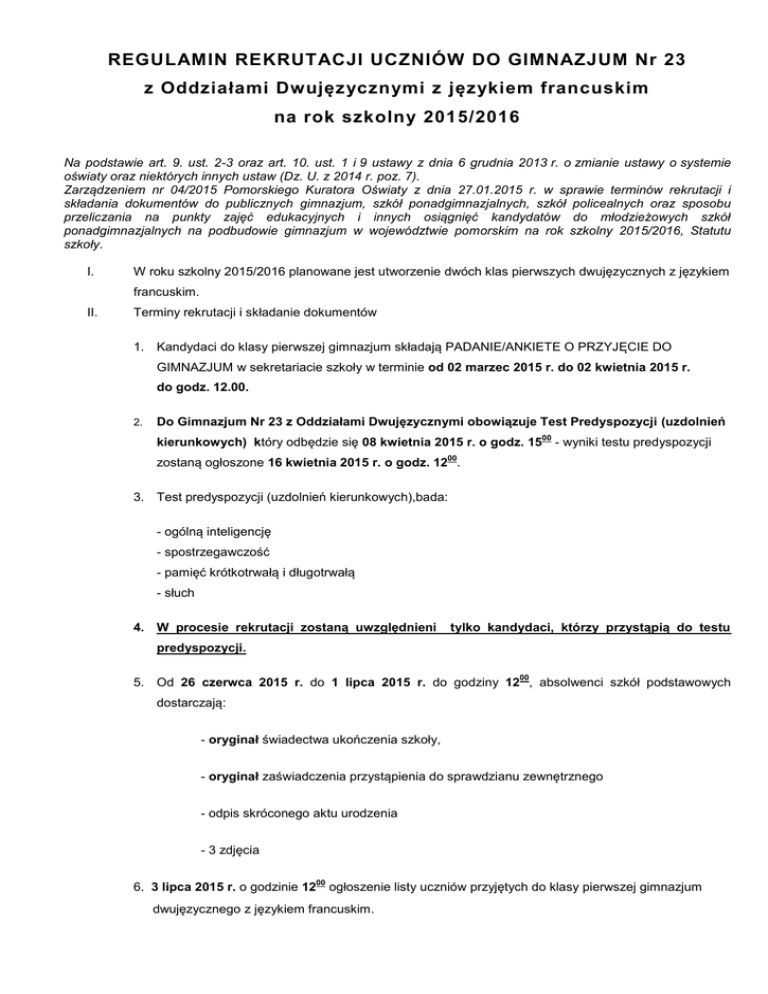 REGULAMIN REKRUTACJI UCZNIÓW DO GIMNAZJUM Nr 23 z Oddziałami Dwujęzycznymi z językiem francuskim na rok szkolny 2015/2016 Na podstawie art. 9. ust. 2-3 oraz art. 10. ust. 1 i 9 ustawy z dnia 6 grudnia 2013 r. o zmianie ustawy o systemie oświaty oraz niektórych innych ustaw (Dz. U. z 2014 r. poz. 7). Zarządzeniem nr 04/2015 Pomorskiego Kuratora Oświaty z dnia 27.01.2015 r. w sprawie terminów rekrutacji i składania dokumentów do publicznych gimnazjum, szkół ponadgimnazjalnych, szkół policealnych oraz sposobu przeliczania na punkty zajęć edukacyjnych i innych osiągnięć kandydatów do młodzieżowych szkół ponadgimnazjalnych na podbudowie gimnazjum w województwie pomorskim na rok szkolny 2015/2016, Statutu szkoły. I. W roku szkolny 2015/2016 planowane jest utworzenie dwóch klas pierwszych dwujęzycznych z językiem francuskim. II. Terminy rekrutacji i składanie dokumentów 1. Kandydaci do klasy pierwszej gimnazjum składają PADANIE/ANKIETE O PRZYJĘCIE DO GIMNAZJUM w sekretariacie szkoły w terminie od 02 marzec 2015 r. do 02 kwietnia 2015 r. do godz. 12.00. 2. Do Gimnazjum Nr 23 z Oddziałami Dwujęzycznymi obowiązuje Test Predyspozycji (uzdolnień kierunkowych) który odbędzie się 08 kwietnia 2015 r. o godz. 15 00 - wyniki testu predyspozycji 00 zostaną ogłoszone 16 kwietnia 2015 r. o godz. 12 . 3. Test predyspozycji (uzdolnień kierunkowych),bada: - ogólną inteligencję - spostrzegawczość - pamięć krótkotrwałą i długotrwałą - słuch 4. W procesie rekrutacji zostaną uwzględnieni tylko kandydaci, którzy przystąpią do testu predyspozycji. 00 5. Od 26 czerwca 2015 r. do 1 lipca 2015 r. do godziny 12 , absolwenci szkół podstawowych dostarczają: - oryginał świadectwa ukończenia szkoły, - oryginał zaświadczenia przystąpienia do sprawdzianu zewnętrznego - odpis skróconego aktu urodzenia - 3 zdjęcia 00 6. 3 lipca 2015 r. o godzinie 12 ogłoszenie listy uczniów przyjętych do klasy pierwszej gimnazjum dwujęzycznego z językiem francuskim. III. Sposób przeliczenia na punkty ocen z wybranych zajęć edukacyjnych, wyników testu predyspozycji, a także sposobów punktowania innych osiągnięć kandydatów 1. O przyjęciu kandydata do pierwszej klasy Gimnazjum Nr 23 z Oddziałami Dwujęzycznymi decyduje suma punktów, której składnikami są: a) punkty uzyskane z testu predyspozycji (uzdolnień kierunkowych)- maksymalna liczba punktów możliwych do uzyskania 200 b) punkty pochodzące z przeliczenia ocen z języka polskiego i matematyki wpisanych na świadectwie ukończenia szkoły podstawowej, sposób przeliczenia: - celujący: 6 punktów - bardzo dobry: 4 punkty - dobry: 2 punkty - dostateczny i poniżej : 0 punktów c) inne osiągnięcia ucznia wymienione w świadectwie ukończenia szkoły podstawowej – maksymalnie 2 punkty d) świadectwo z wyróżnieniem – 2 punkty e) udział w konkursach przedmiotowych organizowanych przez KURATORIUM OŚWIATY, których program obejmuje w całości lub poszerza treści podstawy programowej co najmniej jednego przedmiotu (bloku przedmiotowego) nauczanego w szkole podstawowej – maksymalnie 2 punkty za tytuł finalisty konkursu (brane są pod uwagę nie więcej jak dwa tytuły). f) maksymalna liczba punktów możliwa do uzyskania podczas procesu rekrutacji do klasy pierwszej gimnazjum wynosi 218 punktów. IV. Tryb odwoławczy 1. Wynik przeprowadzonego na przełomie czerwca i lipca 2015 roku postępowania rekrutacyjnego do klas pierwszych Gimnazjum nr 23 z Oddziałami Dwujęzycznymi podaje się do publicznej wiadomości w formie listy kandydatów zakwalifikowanych, zawierającej imiona i nazwiska kandydatów oraz informację o zakwalifikowaniu kandydata do szkoły. 2. Komisja rekrutacyjna przyjmuje kandydata, jeżeli w wyniku postępowania rekrutacyjnego kandydat został zakwalifikowany oraz złożył wymagane dokumenty. 3. Listy podaje się do publicznej wiadomości poprzez umieszczenie w widocznym miejscu w szkole (gablota szkolna przy sekretariacie). Listy zawierają imiona i nazwiska kandydatów uszeregowane w kolejności od największej do najmniejszej ilości zdobytych punktów. 4. W terminie 7 dni od dnia podania do publicznej wiadomości listy kandydatów przyjętych i kandydatów nieprzyjętych, rodzic lub opiekun prawny kandydata może wnieść do dyrektora szkoły odwołanie. 5. Dyrektor szkoły rozpatruje odwołanie w terminie 7 dni od otrzymania odwołania. Do rozpatrzenia odwołania dyrektor szkoły będzie uwzględniał sytuacje rodzinną kandydata, orzeczenie z poradni psychologiczno-pedagogicznej oraz inne sytuacje losowe. 6. Na rozstrzygnięcie dyrektora szkoły służy skarga do sądu administracyjnego. IV. Laureaci konkursów interdyscyplinarnych z języka polskiego z historią i matematyki z przyrodą, oraz biblijnego, organizowanych przez Pomorskiego Kuratora Oświaty oraz laureaci konkursów o zasięgu ponad wojewódzkim, których program obejmuje w całości lub poszerza treści podstawy programowej co najmniej jednego przedmiotu, przyjmowani są do wybranego gimnazjum bez względu na kryteria ustalone spoza obwodu szkoły. V. Kandydatów do klas pierwszych publicznych gimnazjów, którzy ukończyli szkołę za granicą (klasę, dany etap edukacji w szkole za granicą) lub szkołę dla dzieci obywateli polskich czasowo przebywających za granicą, przyjmuje się na podstawie przedstawionego dyrektorowi szkoły świadectwa (zaświadczenia) wydanego przez szkołę za granicą i ostatniego świadectwa szkolnego wydanego w Polsce, jeżeli uczeń takie posiada. Dyrektor szkoły podejmuje decyzję o przyjęciu danego ucznia do szkoły na podstawie sumy lat nauki szkolnej ucznia. VI. Przyjmowanie cudzoziemców do szkół publicznych reguluje §2 ust. 1 i 4 rozporządzenia Ministra Edukacji Narodowej z dnia 1 kwietnia 2010 r. w sprawie przyjmowania osób niebędących obywatelami polskimi do publicznych przedszkoli, szkół, zakładów kształcenia nauczycieli i placówek oraz organ