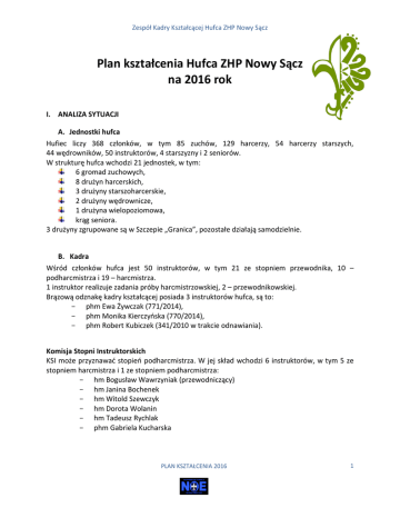 Zespół Kadry Kształcącej Hufca ZHP Nowy Sącz Plan kształcenia Hufca ZHP Nowy Sącz na 2016 rok I. ANALIZA SYTUACJI A. Jednostki hufca Hufiec liczy 368 członków, w tym 85 zuchów, 129 harcerzy, 54 harcerzy starszych, 44 wędrowników, 50 instruktorów, 4 starszyzny i 2 seniorów. W strukturę hufca wchodzi 21 jednostek, w tym: 6 gromad zuchowych, 8 drużyn harcerskich, 3 drużyny starszoharcerskie, 2 drużyny wędrownicze, 1 drużyna wielopoziomowa, krąg seniora. 3 drużyny zgrupowane są w Szczepie „Granica”, pozostałe działają samodzielnie. B. Kadra Wśród członków hufca jest 50 instruktorów, w tym 21 ze stopniem przewodnika, 10 – podharcmistrza i 19 – harcmistrza. 1 instruktor realizuje zadania próby harcmistrzowskiej, 2 – przewodnikowskiej. Brązową odznakę kadry kształcącej posiada 3 instruktorów hufca, są to: - phm Ewa Żywczak (771/2014), - phm Monika Kierczyńska (770/2014), - phm Robert Kubiczek (341/2010 w trakcie odnawiania). Komisja Stopni Instruktorskich KSI może przyznawać stopień podharcmistrza. W jej skład wchodzi 6 instruktorów, w tym 5 ze stopniem harcmistrza i 1 ze stopniem podharcmistrza: - hm Bogusław Wawrzyniak (przewodniczący) - hm Janina Bochenek - hm Witold Szewczyk - hm Dorota Wolanin - hm Tadeusz Rychlak - phm Gabriela Kucharska PLAN KSZTAŁCENIA 2016 1 Zespół Kadry Kształcącej Hufca ZHP Nowy Sącz Zespół Kadry Kształcącej Zespół instruktorów zajmujących się kształceniem w hufcu działa od kilku lat, lecz ze względu na niewystarczającą ilość BOKK nie mógł być zatwierdzony oficjalnie. Zespół Kadry Kształcącej hufca oficjalnie został powołany 28 II 2015, początkowo pod przewodnictwem phm Moniki Kierczyńskiej, od 6 XI 2015 Szefem HZKK jest phm Ewa Żywczak. W skład HZKK wchodzą: - phm Ewa Żywczak (BOKK), - phm Monika Kierczyńska (BOKK), - phm Robert Kubiczek, - phm Justyna Blukacz - phm Gabriela Kucharska. Przeprowadził on m. in.: Kurs Przewodnikowski „Ararat” – wiosna 2013 (komendant: phm Robert Kubiczek) Kurs Drużynowych Harcerskich „Tęcza – niebieski” (komendant: phm Robert Kubiczek) C. Warunki Hufiec posiada dobrą bazę lokalową i środki finansowe do prowadzenia szkoleń. Należy zakupić odpowiednie materiały programowe i metodyczne. Instruktorzy hufca są w stanie pracować jako kadra kształcąca. ZKK zawsze może liczyć także na pomoc ze strony Chorągwianego Zespołu Kadry Kształcącej „Wierchy”. II. PRZYSZŁOŚĆ Cel: Przygotowanie kadry hufca do pełnienia funkcji, pozyskanie młodych kompetentnych drużynowych oraz motywowanie funkcyjnych i instruktorów hufca do samokształcenia, samodoskonalenia i systematycznego podnoszenia kwalifikacji. Zamierzenia: 1 Poznanie zapotrzebowania na formy kształceniowe wśród drużynowych i kadry hufca. 2 Zaplanowanych i zorganizowanie form kształceniowych. 3 Stworzenie bazy materiałów metodycznych potrzebnych w kształceniu. Założenia organizacyjne: 1. Uczestnictwo we wszystkich dłuższych niż 1 dzień formach szkoleniowych jest odpłatne. 2. Za każdą formę kształceniową odpowiada jeden instruktor z ZKK. 3. Uczestnictwo w formach szkoleniowych może być dofinansowane przez hufiec. Każdy wniosek o dofinansowanie musi zaopiniować ZKK. Zatwierdza go komenda hufca. PLAN KSZTAŁCENIA 2016 2 Zespół Kadry Kształcącej Hufca ZHP Nowy Sącz Formy kształceniowe na rok 2016: Miesiąc styczeń Data 9 - 10 11 Kurs Przewodnikowski – sesja 1 Tworzenie programu drużyny – warsztaty 15 - 17 Kurs Namiestników 6 luty Forma 12 - 14 Kurs Przewodnikowski – sesja 2 Kurs Komend Hufców 19 - 21 20-21 7 12 - 13 4 9 - 10 16 - 17 Konferencja Harcmistrzowska Kurs Przewodnikowski – sesja 3, 4 Obsługa Ewidencji ZHP - warsztaty marzec Kurs Przewodnikowski – sesja 5 (ostatnia) Opis funkcji - warsztaty kwiecień Kurs Zastępowych – sesja 1 Kurs Zastępowych – sesja 2 Motywowanie i nagradzanie w ZHP – maj 9 warsztaty czerwiec 6 Ciąg wychowawczy w ZHP - warsztaty Kurs Kadry Kształcącej II sierpień Kurs przewodnikowski połowa Kursy drużynowych październik Analiza potrzeb kadry hufca w zakresie kształcenia listopad 7 Ewaluacja pracy - warsztaty Osoba odpowiedzialna, uwagi phm Monika Kierczyńska phm Monika Kierczyńska Organizator: Chorągiew Krakowska phm Monika Kierczyńska Organizator: Chorągiew Krakowska Organizator: GK phm Monika Kierczyńska phm Robert Kubiczek phm Monika Kierczyńska phm Monika Kierczyńska phm Robert Kubiczek phm Robert Kubiczek phm Gabriela Kucharska phm Ewa Żywczak Organizator: Chorągiew Krakowska phm Ewa Żywczak phm Monika Kierczyńska Szef ZKK: phm Ewa Żywczak PLAN KSZTAŁCENIA 2016 3