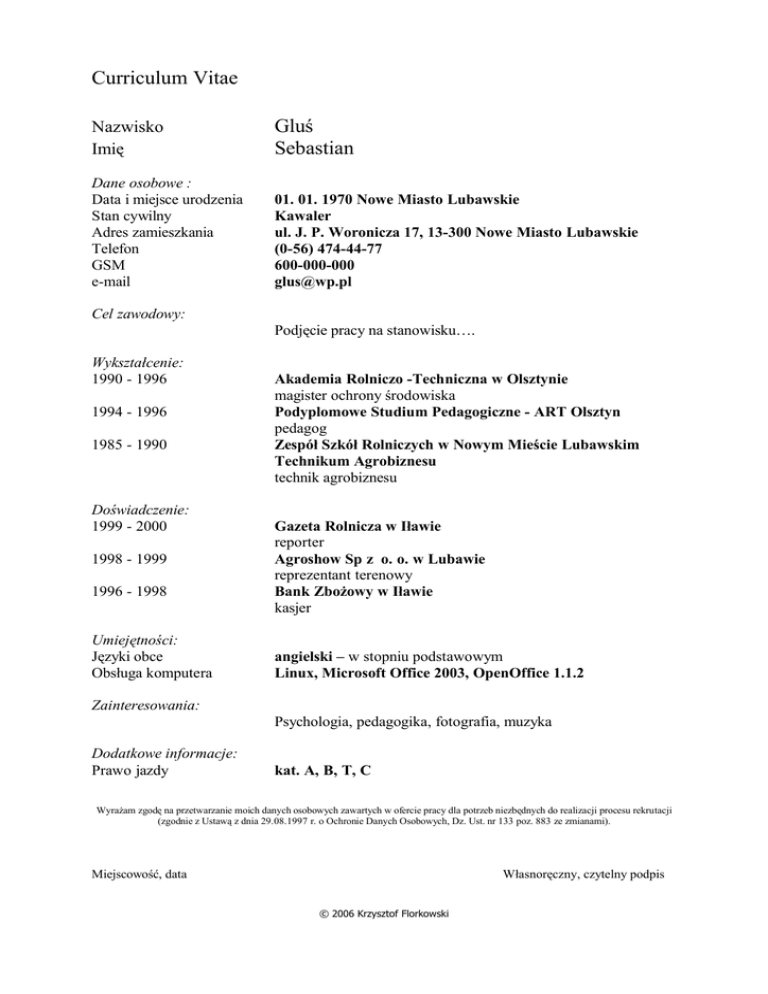 Curriculum Vitae Nazwisko Imię Gluś Sebastian Dane osobowe : Data i miejsce urodzenia Stan cywilny Adres zamieszkania Telefon GSM e-mail 01. 01. 1970 Nowe Miasto Lubawskie Kawaler ul. J. P. Woronicza 17, 13-300 Nowe Miasto Lubawskie (0-56) 474-44-77 600-000-000 [email protected] Cel zawodowy: Podjęcie pracy na stanowisku…. Wykształcenie: 1990 - 1996 1994 - 1996 1985 - 1990 Doświadczenie: 1999 - 2000 1998 - 1999 1996 - 1998 Umiejętności: Języki obce Obsługa komputera Akademia Rolniczo -Techniczna w Olsztynie magister ochrony środowiska Podyplomowe Studium Pedagogiczne - ART Olsztyn pedagog Zespół Szkół Rolniczych w Nowym Mieście Lubawskim Technikum Agrobiznesu technik agrobiznesu Gazeta Rolnicza w Iławie reporter Agroshow Sp z o. o. w Lubawie reprezentant terenowy Bank Zbożowy w Iławie kasjer angielski – w stopniu podstawowym Linux, Microsoft Office 2003, OpenOffice 1.1.2 Zainteresowania: Psychologia, pedagogika, fotografia, muzyka Dodatkowe informacje: Prawo jazdy kat. A, B, T, C Wyrażam zgodę na przetwarzanie moich danych osobowych zawartych w ofercie pracy dla potrzeb niezbędnych do realizacji procesu rekrutacji (zgodnie z Ustawą z dnia 29.08.1997 r. o Ochronie Danych Osobowych, Dz. Ust. nr 133 poz. 883 ze zmianami). Miejscowość, data Własnoręczny, czytelny podpis © 2006 Krzysztof Florkowski