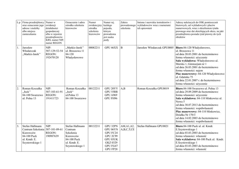 L.p Firma przedsiębiorcy . oraz oznaczenie jego adresu i siedziby albo miejsca zamieszkania Numer w Oznaczenie i adres ewidencji ośrodka szkolenia działalności kierowców gospodarczej albo w rejestrze przedsiębiorców KRS, numer NIP, numer REGON Numer ewidencyjny ośrodka szkolenia kierowców 1. Jarosław Włodarczak ,,Markiz-Jarek’’ NIP: 587-129-52-54 REGON: 192470120 00082211 2. Roman Koszałka ,,Jock’’ 84-100 Swarzewo ul. Polna 13 3. Stefan Hallmann Centrum Szkolenia Kierowców 84-100 Puck ul. Kmdr. E. Szystowskiego 1 ,,Markiz-Jarek’’ ul. Brzozowa 11 84-120 Władysławowo Numer rej. każdego pojazdu, którym prowadzona jest nauka jazdy Zakres Imiona i nazwiska instruktorów i prowadzonego wykładowców wraz z numerami szkolenia ich uprawnień Adresy należacych do OSK pomieszczeń biurowych, sal wykładowych i placów manerwowych, wraz z określeniem tytułu prawnego oraz dat określających okres, na jaki przedsiębiorca posiada tytuł prawny do tych obiektów GPU 46XX B Jarosław Włodarczak GPU0005 Biuro:84-120 Władysławowo, ul. Brzozowa 11 od dnia 20.03.2001 do bezterminowo forma własności: użyczenie Sala wykładowa: Władysławowo ul. Morska 1, Gimnazjum nr 1 od dnia 26.03.2001 do bezterminowo forma własności: najem Plac manewrowy: 84-120 Władysławowo ul. Gdańska 75 od dnia 22.01.2007 r. do bezterminowo forma własności: użyczenie NIP: Roman Koszałka 00122211 587-103-61-91 „Jock“ REGON: ul.Polna 13 191411723 84-100 Swarzewo GPU 20YY A,B GPU 55RR GPU A969 GPU FH96 Roman Koszałka GPU0019 NIP: 587-101-09-61 REGON: 190987639 GPU 32PN AM,A1,A2, Stefan Hallmann GPU0021 GPU 06YN A,B,C,T,CE GPU FC24 GPU 2C99 GPU 03UK GKZ 0329 GPU FG47 GPU FP28 Stefan Hallmann Centrum Szkolenia Kierowców 84-100 Puck ul. Kmdr. E. Szystowskiego 1 00132211 Biuro:84-100 Swarzewo ul. Polna 13 od dnia 29.09.2009 do bezterminowo forma własności: użyczenie Sala wykładowa: 84-110 Minkowice ul. Nowa 5 od dnia 30.07.2013 do bezterminowo forma własności: współwłasność Plac manewrowy: 84-110 Minkowice, Działka Nr 170/3 od dnia 14.02.2003 do bezterminowo forma własności: współwłasność Biuro:84-100 Puck ul. ul. Kmdr. E.Szystowskiego 1 od dnia 03.03.2003 do bezterminowo forma własności: własność Sala wykładowa: 84-100 Puck ul. Kmdr. E.Szystowskiego 1 od dnia 03.03.2003 do bezterminowo forma własności: własność GPU 1E90 Plac manewrowy: 84-100 Puck ul. ul. Kmdr. E.Szystowskiego 1 od dnia 03.03.2003 do bezterminowo forma własności: własność 4. Mariola Koszałka Ośrodek Szkolenia Kierowców "MARIOLKA" NIP: 588-148-67-25 REGON: 193016238 Mariola Koszałka 00182211 Ośrodek Szkolenia Kierowców "MARIOLKA" 84-110 Minkowice ul. Długa 2A GWE 02900 B Mariola Koszałka GWE0057 5. Dariusz Głomski Ośrodek Szkolenia Kierowców „DAKAR“ NIP: 587-151-78-55 REGON: 220502837 Dariusz Głomski 00192211 Ośrodek Szkolenia Kierowców „DAKAR“ ul. Pucka 1 84-110 Minkowice GPU 4Y84 GO YARIS Dariusz Głomski GPU0036 Biuro: 84-110 Minkowice ul. Pucka 1 Kazimierz Maszczyk GPU0035 od dnia 02.01.2014 do bezterminowo forma własności: najem Sala wykładowa: 84-110 Minkowice ul. Pucka 1 od dnia 08.09.2008 do bezterminowo forma własności: najem Plac manewrowy: 84-110 Minkowice ul. Pucka 1 od dnia 08.09.2008 do bezterminowo forma własności: najem 6. Bartoszewicz Krystian „KRYSTIAN” NIP: 587-151-62-64 REGON: 220468773 Bartoszewicz 00232211 Krystian „KRYSTIAN” 84-104 Tupadły ul. Wiatrakowa 33 GWE 52739 B Krystian Bartoszewicz GPU0066 Biuro: 84-104 Tupadły ul. Wiatrakowa 33 od dnia 01.12.2009 do bezterminowo forma własności: użyczenie Sala wykładowa: 84-104 Tupadły ul. Wiatrakowa 33 od dnia 01.12.2009 do bezterminowo forma własności: użyczenie Plac manewrowy: 84-107 Kłanino Nr 49/1 od dnia 01.02.2013 do 28.02.2014 forma własności: wynajem 7. Grubba Adam NIP: Grubba Adam GPU 30YF Adam Grubba GPU0054 Biuro: Żelistrzewo 00242211 B B Biuro: 84-110 Minkowice ul. Długa 2A od dnia 01.10.2012 do czas nieokreślony forma własności: dzierżawa Sala wykładowa: 84-110 Minkowice ul. Długa 2A od dnia 01.10.2012 do czas nieokreślony forma własności: dzierżawa Plac manewrowy: 84-110 Minkowice działka nr 170/3 od dnia 29.04.2013 do bezterminowo forma własności: współwłasność Ośrodek Szkolenia 587-127-54-93 Ośrodek Szkolenia Kierowców REGON: Kierowców „AUTOBELFER” 220718916 „AUTOBELFER” Żelistrzewo ul. Kwiatowa 64 GD 286EJ GPU 3T41 Tomasz Jakubiuk GSP0029 Tadeusz Wolski GPU0091 ul. Kwiatowa 64 od dnia 05.01.2010 do bezterminowo forma własności: dzierżawa Sala wykładowa: Gdynia ul. Kalksztajnów 26 od dnia 05.01.2010 do bezterminowo forma własności: dzierżawa Plac manewrowy: 84-100 Żelistrzewo ul. Pucka 54 od dnia 01.03.2013 do bezterminowo forma własności: dzierżawa 8. Jerzy Karnowski "MARCIN" 84-120 Władysławowo ul. Parkowa 7 NIP: 587-127-04-03 REGON: 191098143 Jerzy Karnowski 00292211 OSK "MARCIN" 84-120 Władysławowo ul. Parkowa 7 GPU 33YW B Jerzy Karnowski GPU0034 Biuro: 84-120 Władysławowo ul. Parkowa 7 od dnia 31.08.2010 do bezterminowo forma własności: Sala wykładowa: 84-120 Władysławowo ul. Morska 1 od dnia 01.09.2010 do 30.06.2011 forma własności: Plac manewrowy: 84-120 Władysławowo ul. Parkowa 7 od dnia 31.08.2010 do bezterminowo forma własności: najem 9. Wiesława WysockaCentrum Szkolenia Kierowców "RONDO-BIS" NIP: 588-123-40-76 REGON: 192602709 Wiesława 00342211P GWE AN23 AM,A1,A2, Wysocka Centrum GWE CN10 A,B1,B,C,D, Szkolenia GWE 1EK3 T,BE,CE Kierowców GWE 5CW5 "RONDO-BIS" GWE 9CK1 84-100 Puck GWE 3EA5 ul. Gen. Józefa GD 258FK Hallera 2 GD 647EJ GWE 08056 GWE 64382 GWE 2953A GWE 15449 GWE 45921 GWE 16A4 GWE 5EJ1 GWE 2703A GWE EE22 Wojciech Chróściel GWE 0190 Marek Marciniec GWE 0109 Dariusz Matusiak GWE 0155 Jacek Piotrowski GWE 0003 Piotr Tkacz GWE 0224 Wiesława Wysocka GWE 0069 Edmund Paszylk GWE 0250 Zbigniew Jankowski GWE 0199 Tadeusz Szlendak GA0174 Grzegorz Wiktorek BLM0029 Jarosław O