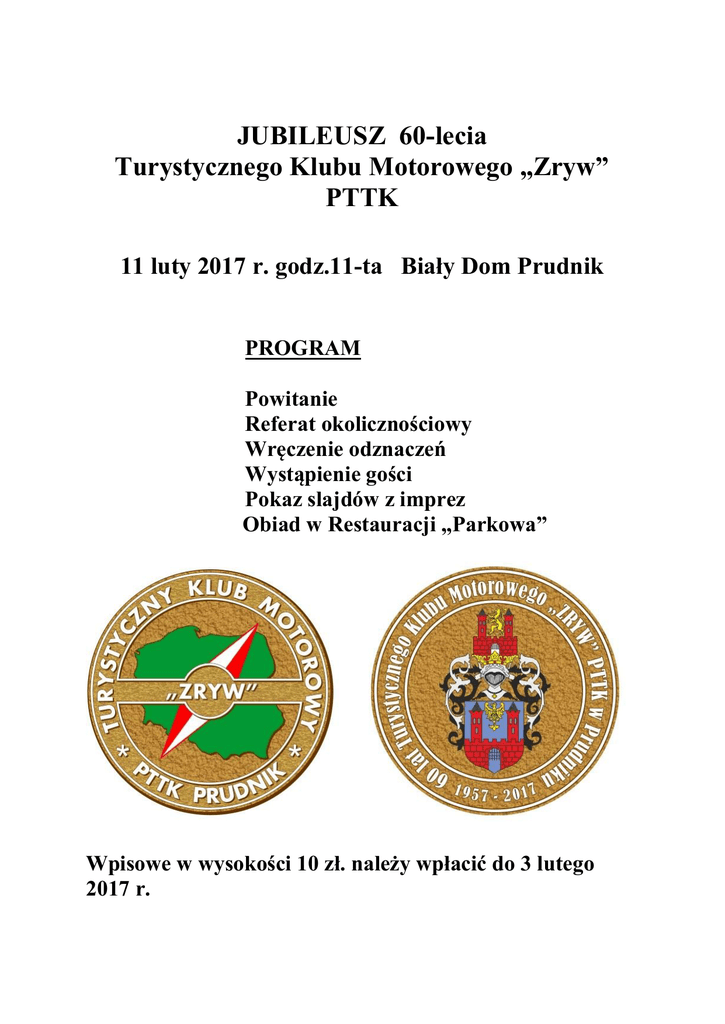 JUBILEUSZ 60-lecia Turystycznego Klubu Motorowego „Zryw” PTTK 11 luty 2017 r. godz.11-ta Biały Dom Prudnik PROGRAM Powitanie Referat okolicznościowy Wręczenie odznaczeń Wystąpienie gości Pokaz slajdów z imprez Obiad w Restauracji „Parkowa” Wpisowe w wysokości 10 zł. należy wpłacić do 3 lutego 2017 r.