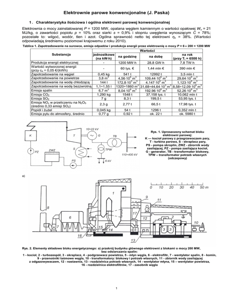 Elektrownie parowe konwencjonalne (J. Paska) 1 . Charakterystyka ilościowa i ogólna elektrowni parowej konwencjonalnej Elektrownia o mocy zainstalowanej P = 1200 MW, opalana węglem kamiennym o wartości opałowej Wu = 21 MJ/kg, o zawartości popiołu p = 10% oraz siarki s = 0,9% i stopniu uwęglenia wynoszącym C = 78%; pozostałe to: wilgoć, wodór, tlen i azot. Ogólna sprawność netto tej elektrowni ηo = 38%. (Wartości odpowiadają średniemu poziomowi krajowemu z roku 2010). Tablica 1. Zapotrzebowanie na surowce, emisja odpadów i produkcja energii przez elektrownię o mocy P = 6 × 200 = 1200 MW Wartości Substancja Produkcja energii elektrycznej Wartość wytworzonej energii (przy ce = 0,05 €/(kWh) Zapotrzebowanie na węgiel Zapotrzebowanie na powietrze Zapotrzebowanie na wodę chłodzącą Zapotrzebowanie na wodę bezzwrotną Emisja spalin Emisja CO2 Emisja SO2 Emisja NOx w przeliczeniu na N2O5 (średnio 0,33 emisji SO2) Popiół i żużel Emisja pyłu do atmosfery, średnio jednostkowe (na kW⋅⋅h) 0,45 kg 3 3,8 m 144 l 1,1÷1,55 l 3 6,7 m 1,290 kg 7g na godzinę na dobę 1200 MW⋅h 28,8 GW⋅h na rok (przy Ti = 6500 h) 7,8 TW⋅h 60 tys. € 1,44 mln € 390 mln € 541 t 12992 t 3,5 mln t 6 3 6 3 9 3 4,56⋅10 m 109,44⋅10 m 29,64⋅10 m 3 3 6 3 9 3 172,8⋅10 m 4,147⋅10 m 1,123⋅10 m 3 3 3 6 1320÷1860 m 31,68÷44,64⋅10 m 8,58÷12,09⋅10 m3 6 3 6 3 9 3 8,04⋅10 m 192,96⋅10 m 52,26⋅10 m 1548 t 37,158 tys. t 10,062 mln t 8,3 t 199,5 t 53,95 tys. t 2,3 g 2,77 t 66,5 t 17,98 tys. t 0,045 kg 0,77 g 54 t 0,92 t 1296 t ok. 22 t 0,352 mln t ok. 5980 t Rys. 1. Uproszczony schemat bloku elektrowni parowej: K — kocioł parowy z przegrzewaczem pary, T - turbina parowa, S - skraplacz pary, PS - pompa skroplin, ZWZ - zbiornik wody zasilającej, PZ - pompa zasilająca kocioł, G - generator, TB - transformator blokowy, TPW – transformator potrzeb własnych (odczepowy) a) Rys. 2. Elementy składowe bloku energetycznego: a) przekrój budynku głównego elektrowni z blokami o mocy 200 MW, bez odsiarczania spalin: 1 - kocioł, 2 - turbozespół, 3 - skraplacz, 4 - podgrzewacz powietrza, 5 - młyn węgla, 6 - elektrofiltr, 7 - wentylator spalin, 8 - komin, 9 - przenośniki taśmowe węgla, 10 - transformatory: blokowy i potrzeb własnych, 11 - zbiornik wody zasilającej z odgazowywaczem, 12 - nastawnia, 13 - rozdzielnica potrzeb własnych, 14 - wentylator młyna, 15 – wentylator powietrza, 16 - rozdzielnica elektrofiltrów, 17 - zasobnik węgla 1 Elektrownie parowe konwencjonalne (J. Paska) b) Rys. 2. Elementy składowe bloku energetycznego: b) układ technologiczny elektrowni na przykładzie Elektrowni BEŁCHATÓW 2. Kotły parowe Rys. 3. Uproszczony przekrój kotła parowego: 1 - walczak, 2 - komora paleniskowa, 3 - palniki, 4 - rury opadowe, 5 - przegrzewacz pary, 6 - podgrzewacz wody, 7 - podgrzewacz powietrza, 8 - wentylator powietrza Rys. 4. Uproszczony schemat bloku z międzystopniowym przegrzewaniem pary: K - kocioł parowy; PI, PII - przegrzewacze pary: pierwotny, wtórny (międzystopniowy); WP - wysokoprężna część turbiny; NP - niskoprężna część turbiny; S - skraplacz pary; PS - pompa skroplin; ZWZ - zbiornik wody zasilającej; PZ - pompa zasilająca kocioł; G – generator 2 Elektrownie parowe konwencjonalne (J. Paska) Tablica 2. Parametry niektórych krajowych energetycznych kotłów parowych Symbol kotła Wydajność [t/h] / Moc bloku [MW] 380/120 Ciśnienie pary [MPa/MPa] 13,6/2,7 Temperatura pary [°C/°C] 540/540 OP-380 OP-650 650/200 15,6/2,7 540/540 OB-650 BB-1150* 1150/360 18,3/4,2 540/540 BB-2400 2400/858 26,1/5,46 554/582 * Z obiegiem dodatkowo wspomaganym w obrębie parownika Sprawność [%] 87÷90 91÷92 88 91 ? Temperatura wody zasilającej [°C] 230 240 255 278 Rys. 5. Charakterystyka energetyczna kotła parowego: Qkmin - minimum techniczne kotła, Qkmax - maksymalna wydajność kotła 3 . Turbiny parowe T u r b i n a p a r o w a jest silnikiem cieplnym stosowanym w elektrowni do napędu generatora synchronicznego. Silnik ten ma cechy szczególnie predestynujące go do takiego zastosowania. Turbina parowa jest silnikiem przepływowym, wirnikowym - rozwijającym na wale równomierny moment obrotowy. Rys. 6. Turbina parowa: a) zasada działania turbiny jednostopniowej, b) przekrój poglądowy; 1 - dysza/wieniec dysz, 2 - wieniec łopatek wirnika, ZR - zawór regulacyjny, S - skraplacz pary, PS - pompa skroplin 3 Elektrownie parowe konwencjonalne (J. Paska) Rys. 7. Turbiny: a) jednokadłubowa, b) dwukadłubowa, c) trójkadłubowa, d) czterokadłubowa; e) wirnik turbiny 40 MW; f) przekrój osiowy części WP i SP turbiny 18K380 (17,5/4,2 MPa; 550/570°°C; 380 MW); kadłuby: WP - wysokoprężny, SP - średnioprężny, NP - niskoprężny; MPP - międzystopniowy przegrzewacz pary (element kotła parowego) Rys. 8. Symbole turbin parowych: a) kondensacyjna, b) przeciwprężna, c) upustowo-przeciwprężna, d) upustowo-kondensacyjna. Indeksy przy symbolach parametrów pary oznaczają parę: 1 - świeża zasilająca turbinę, 2 – na wylocie z turbiny kondensacyjnej, p - opuszczająca turbinę przeciwprężną, u - pobierana z upustu turbiny Tablica 3. Parametry niektórych krajowych turbin parowych Parametry pary Upust regulowany Ciśnienie na wylocie temperatura ciśnienie ciśnienie pobór pary Symbol początkowa wt. prz. MW MPa °C °C MPa MPa t/h Turbiny kondensacyjne skraplacz TK 120 120 12,7 535 535 skraplacz 13K 215 200 13,0 535 535 skraplacz 18K 360 360 17,7 535 535 skraplacz K 500* 500 16,3 535 535 Turbiny przeciwprężne 0,4÷0,6 TP ... 2,5 do 6 3,5 435 0,9 TP 20 19,5 9,0 500 0,12 TP 30 30 9,0 500 0,07 i 0,03** 1,0 7,5÷85 13UP50 50 13,0 535 Turbiny upustowo-kondensacyjne UK 8 2 do 8 2,4 380 skraplacz 0,12÷0,6 2,5÷51 3,5 435 4,5 450 UK 12 5 do 12 2,4 380 skraplacz 0,12÷0,6 5,0÷65 i 435 3,5 450 * Konstrukcja b. Leningradzkiej Fabryki Turbin. ** Dwa wyloty, turbina upustowo-przeciwprężna. Moc 4 Elektrownie parowe konwencjonaln