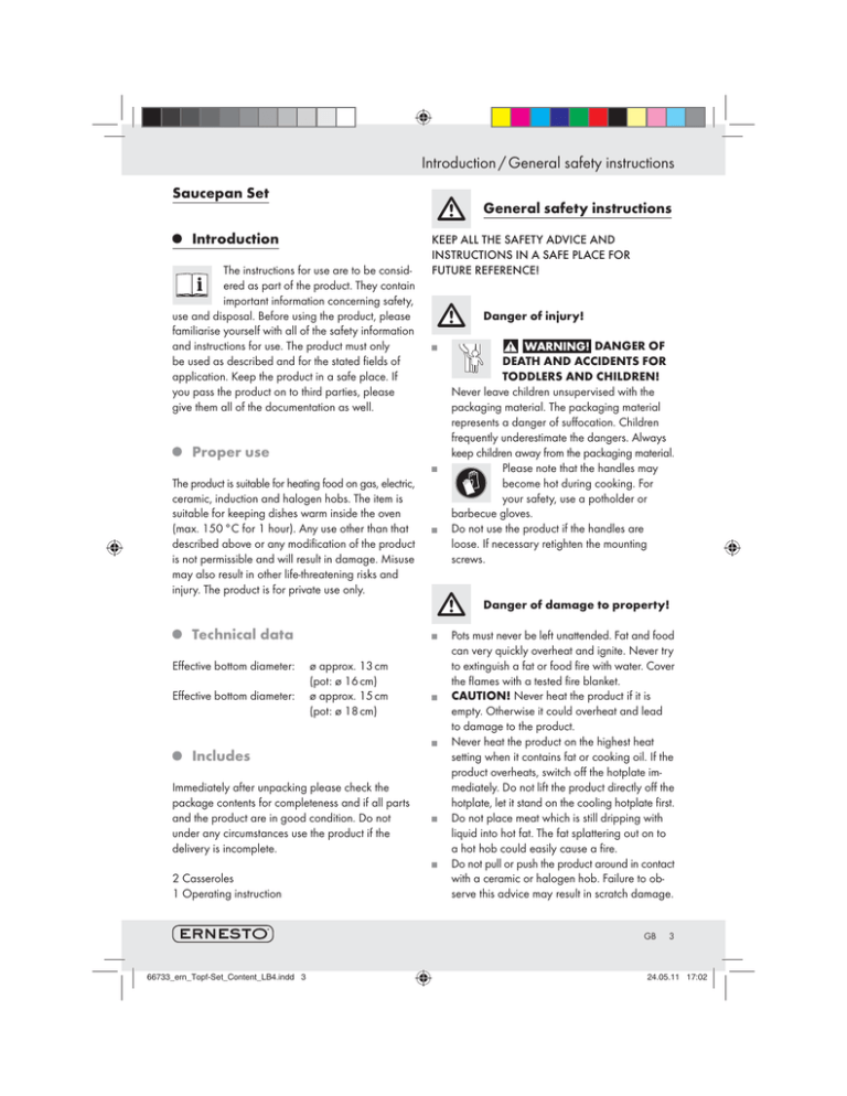 Introduction / General safety instructions Saucepan Set General safety instructions Introduction The instructions for use are to be considered as part of the product. They contain important information concerning safety, use and disposal. Before using the product, please familiarise yourself with all of the safety information and instructions for use. The product must only be used as described and for the stated fields of application. Keep the product in a safe place. If you pass the product on to third parties, please give them all of the documentation as well. Proper use The product is suitable for heating food on gas, electric, ceramic, induction and halogen hobs. The item is suitable for keeping dishes warm inside the oven (max. 150 °C for 1 hour). Any use other than that described above or any modification of the product is not permissible and will result in damage. Misuse may also result in other life-threatening risks and injury. The product is for private use only. KEEP ALL THE SAFETY ADVICE AND INSTRUCTIONS IN A SAFE PLACE FOR FUTURE REFERENCE! Danger of injury! DANGER OF DEATH AND ACCIDENTS FOR TODDLERS AND CHILDREN! Never leave children unsupervised with the packaging material. The packaging material represents a danger of suffocation. Children frequently underestimate the dangers. Always keep children away from the packaging material. Please note that the handles may become hot during cooking. For your safety, use a potholder or barbecue gloves. Do not use the product if the handles are loose. If necessary retighten the mounting screws. Danger of damage to property! Technical data Effective bottom diameter: Effective bottom diameter: ø approx. 13 cm (pot: ø 16 cm) ø approx. 15 cm (pot: ø 18 cm) Includes Immediately after unpacking please check the package contents for completeness and if all parts and the product are in good condition. Do not under any circumstances use the product if the delivery is incomplete. 2 Casseroles 1 Operating instruction Pots must never be left unattended. Fat and food can very quickly overheat and ignite. Never try to extinguish a fat or food fire with water. Cover the flames with a tested fire blanket. CAUTION! Never heat the product if it is empty. Otherwise it could overheat and lead to damage to the product. Never heat the product on the highest heat setting when it contains fat or cooking oil. If the product overheats, switch off the hotplate immediately. Do not lift the product directly off the hotplate, let it stand on the cooling hotplate first. Do not place meat which is still dripping with liquid into hot fat. The fat splattering out on to a hot hob could easily cause a fire. Do not pull or push the product around in contact with a ceramic or halogen hob. Failure to observe this advice may result in scratch damage. GB 66733_ern_Topf-Set_Content_LB4.indd 3 3 24.05.11 17:02 General safety instructions / Use / Cleaning and care / Disposal Save energy! To avoid heat loss, choose a hotplate with a diameter that matches the diameter of the product. CAUTION! FIRE DANGER! If the food liquid evaporates completely the food will scorch. The food gets uneatable and may ignite. Clean the product after used. For washing the product, use hot water with a little ordinary washing-up liquid. Avoid using sharp or pointed objects for this in order not to damage the product. Do not use harsh scouring agents. FOOD-SAFE! This product has no adverse effect on taste or smell. From time to time minerals in the water may give rise to stains on or discolouring of the product. They can be removed by rubbing half a lemon over the affected areas. Stubborn stains can be removed with a mixture of nine parts water to one part vinegar. Hard water and some foodstuffs can give rise to calcium deposits on or discolouration of the product. To remove these residues, boil a mixture of water and vinegar in the product at regular intervals. Remove any stubborn residues using a special cleaner. Special cleaners are available from specialist cleaning material or DIY shops. Disposal Do not use the product if it is damaged. Use Before first use, remove any stickers or labels from the article and rinse it in hot water. Boil water in the product two or three times in order to completely remove any residues remaining from the manufacturing process. Lightly grease cooking surfaces of the product. Never heat the product if it is empty. Heat up the food at a higher / medium heat setting and then let it cook at a lower heat setting until ready. The packaging is made entirely of recyclable materials, which you may dispose of at local recycling facilities. Contact your local refuse disposal authority for more details of how to dispose of your worn-out product. Product description: Saucepan Set Model no.: Z29058 Version: 07 / 2011 Cleaning and care Under no circumstances should you use hard objects, wire wool and / or aggressive or abrasive cleaning agents such as chlorine bleach. This product is suitable for dishwasher. For washing the product, use hot water with a little ordinary washing-up liquid. Food residues that have become stuck to the pots should first be soaked in water and then removed using a wooden scraper, sponge or brush, if necessary. Check the product regularly for damage. 4 GB 66733_ern_Topf-Set_Content_LB4.indd 4 24.05.11 17:02 Wstęp / Wskazówki dotyczące bezpieczeństwa Komplet rondli stanu elementów. Nie należy składać produktu, jeżeli zawartość opakowania jest niekompletna. Wstęp 2 Rondeli 1 Instrukcja obsługi Instrukcja obsługi jest częścią składową tego produktu. Zawiera ona ważne wskazówki dotyczące bezpieczeństwa, użycia i usuwania. Przed użyciem produktu należy zapoznać się ze wszystkimi wskazówkami dotyczącymi bezpieczeństwa i obsługi. Produkt stosować zgodnie z opisem i zgodnie z zastosowaniem. Należy przechowywać produkt w bezpiecznym miejscu. W przypadku przekazania produktu w ręce osoby trzeciej, prosimy o przekazanie tak