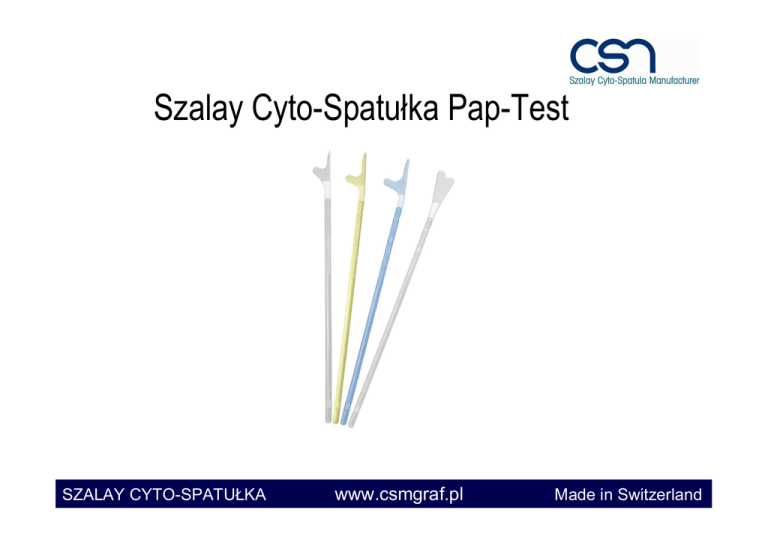 Szalay Cyto-Spatułka Pap-Test SZALAY CYTO-SPATULA CYTO-SPATUŁKA www.csmgraf.ch www.csmgraf.pl Made MadeininSwitzerland Switzerland Po wprowadzeniu wziernika naleŜy postępować następująco: – śluz i resztki z zewnętrznej powierzchni szyjki macicy powinny zostać usunięte tamponem z waty – właściwa szpatułka zostaje wybrana w zaleŜności od kształtu i szerokości szyjki macicy – „języczek” szpatułki zostaje wprowadzony do szyjki macicy tak Ŝe bok szpatułki leŜy na zewnętrznej powierzchni szyjki macicy i wskazuje godzinę 15:00. – Szpatułkę naleŜy raz obrócić, z miękkim naciskiem, zgodnie z kierunkiem wskazówek zegara. JeŜeli ma się wraŜenie, Ŝe uzyskało się za mało materiału komórkowego, naleŜy obrót powtórzyć. SZALAY CYTO-SPATULA CYTO-SPATUŁKA www.csmgraf.ch www.csmgraf.pl Made MadeininSwitzerland Switzerland Uzyskany materiał komórkowy rozprowadzić równolegle na szkiełku. JeŜeli materiał nie rozmazał się równolegle, badanie moŜe zostać powtórzone. Przy analizie opartej na płynie naleŜy górną część szpatułki odłamać i włoŜyć razem ze szkiełkiem do pojemnika z płynem utrwalającym. SZALAY CYTO-SPATULA CYTO-SPATUŁKA www.csmgraf.ch www.csmgraf.pl Made MadeininSwitzerland Switzerland Szalay Cyto-Szpatułka nr 1 Usunąć tamponem z waty śluz i resztki z zewnętrznej powierzchni szyjki macicy. SZALAY CYTO-SPATULA CYTO-SPATUŁKA www.csmgraf.ch www.csmgraf.pl Made MadeininSwitzerland Switzerland Bok Cyto-Szpatułki (nr 1) połoŜyć na zewnętrznej części szyjki, tak Ŝeby wskazywał godzinę 15:00 SZALAY CYTO-SPATULA CYTO-SPATUŁKA www.csmgraf.ch www.csmgraf.pl Made MadeininSwitzerland Switzerland Bok Cyto-Szpatułki (nr 1) połoŜyć na zewnętrznej części szyjki, tak Ŝeby wskazywał godzinę 15:00 SZALAY CYTO-SPATULA CYTO-SPATUŁKA www.csmgraf.ch www.csmgraf.pl Made MadeininSwitzerland Switzerland Obróć Cyto-Szpatułkę (nr 1) z miękkim naciskiem zgodnie z kierunkiem ruchu zegara SZALAY CYTO-SPATULA CYTO-SPATUŁKA www.csmgraf.ch www.csmgraf.pl Made MadeininSwitzerland Switzerland Obróć Cyto-Szpatułkę (nr 1) z miękkim naciskiem zgodnie z kierunkiem ruchu zegara SZALAY CYTO-SPATULA CYTO-SPATUŁKA www.csmgraf.ch www.csmgraf.pl Made MadeininSwitzerland Switzerland Obróć Cyto-Szpatułkę (nr 1) z miękkim naciskiem zgodnie z kierunkiem ruchu zegara SZALAY CYTO-SPATULA CYTO-SPATUŁKA www.csmgraf.ch www.csmgraf.pl Made MadeininSwitzerland Switzerland Obróć Cyto-Szpatułkę (nr 1) z miękkim naciskiem zgodnie z kierunkiem ruchu zegara SZALAY CYTO-SPATULA CYTO-SPATUŁKA www.csmgraf.ch www.csmgraf.pl Made MadeininSwitzerland Switzerland Szalay Cyto-Szpatułka nr 2 Śluz jest usunięty SZALAY CYTO-SPATULA CYTO-SPATUŁKA www.csmgraf.ch www.csmgraf.pl Made MadeininSwitzerland Switzerland Bok Cyto-Szpatułki (nr 2) połoŜyć na zewnętrznej części szyjki, tak Ŝeby wskazywał godzinę 15:00 SZALAY CYTO-SPATULA CYTO-SPATUŁKA www.csmgraf.ch www.csmgraf.pl Made MadeininSwitzerland Switzerland Obróć Cyto-Szpatułkę (nr 2) z miękkim naciskiem zgodnie z kierunkiem ruchu zegara SZALAY CYTO-SPATULA www.csmgraf.ch Made in Switzerland Obróć Cyto-Szpatułkę (nr 2) z miękkim naciskiem zgodnie z kierunkiem ruchu zegara SZALAY CYTO-SPATULA CYTO-SPATUŁKA www.csmgraf.ch www.csmgraf.pl Made MadeininSwitzerland Switzerland Obróć Cyto-Szpatułkę (nr 2) z miękkim naciskiem zgodnie z kierunkiem ruchu zegara SZALAY CYTO-SPATULA CYTO-SPATUŁKA www.csmgraf.ch www.csmgraf.pl Made MadeininSwitzerland Switzerland Obróć Cyto-Szpatułkę (nr 2) z miękkim naciskiem zgodnie z kierunkiem ruchu zegara SZALAY CYTO-SPATULA CYTO-SPATUŁKA www.csmgraf.ch www.csmgraf.pl Made MadeininSwitzerland Switzerland Uzyskany materiał komórkowy rozprowadzany jest równolegle na szkiełku. SZALAY CYTO-SPATULA CYTO-SPATUŁKA www.csmgraf.ch www.csmgraf.pl Made MadeininSwitzerland Switzerland Uzyskany materiał komórkowy rozprowadzany jest równolegle na szkiełku. SZALAY CYTO-SPATULA CYTO-SPATUŁKA www.csmgraf.ch www.csmgraf.pl Made MadeininSwitzerland Switzerland Uzyskany materiał komórkowy rozprowadzany jest równolegle na szkiełku. SZALAY CYTO-SPATULA CYTO-SPATUŁKA www.csmgraf.ch www.csmgraf.pl Made MadeininSwitzerland Switzerland Uzyskany materiał komórkowy rozprowadzany jest równolegle na szkiełku. SZALAY CYTO-SPATULA CYTO-SPATUŁKA www.csmgraf.ch www.csmgraf.pl Made MadeininSwitzerland Switzerland Rozkład komórek na powierzchni moŜe wskazywać na istnienie nowotworu. SZALAY CYTO-SPATULA CYTO-SPATUŁKA www.csmgraf.ch www.csmgraf.pl Made MadeininSwitzerland Switzerland Szalay Cyto-Szpatułka nr 3 W tym przypadku nie obracaj Cyto-Szpatułki (nr 3 ) lecz przesuwaj języczek szpatułki pod miękkim naciskiem wzdłuŜ zewnętrznej powierzchni szyjki macicy. SZALAY CYTO-SPATULA CYTO-SPATUŁKA www.csmgraf.ch www.csmgraf.pl Made MadeininSwitzerland Switzerland W tym przypadku nie obracaj Cyto-Szpatułki (nr 3 ) lecz przesuwaj języczek szpatułki pod miękkim naciskiem wzdłuŜ zewnętrznej powierzchni szyjki macicy. SZALAY CYTO-SPATULA CYTO-SPATUŁKA www.csmgraf.ch www.csmgraf.pl Made MadeininSwitzerland Switzerland Konwencjonalne metodyof analizy Conventional method analysis SZALAY CYTO-SPATULA CYTO-SPATUŁKA www.csmgraf.ch www.csmgraf.pl Made MadeininSwitzerland Switzerland Metoda analizymethod oparta o analizę płynu Liquid based of analysis SZALAY CYTO-SPATULA www.csmgraf.ch Made in Switzerland Zaleta Pojedynczy wymaz gwarantuje wystarczającą ilość reprezentacyjnego materiału komórkowego ze wszystkich sfer szyjki macicy. SZALAY CYTO-SPATULA CYTO-SPATUŁKA www.csmgraf.ch www.csmgraf.pl Made MadeininSwitzerland Switzerland Zaleta Pojedynczy wymaz gwarantuje wystarczającą ilość reprezentacyjnego materiału komórkowego ze wszystkich sfer szyjki macicy. SZALAY CYTO-SPATULA CYTO-SPATUŁKA www.csmgraf.ch www.csmgraf.pl Made MadeininSwitzerland Switzerland Zaleta Specjalnie wykonana powierzchnia szpatułki pozwala na uzy