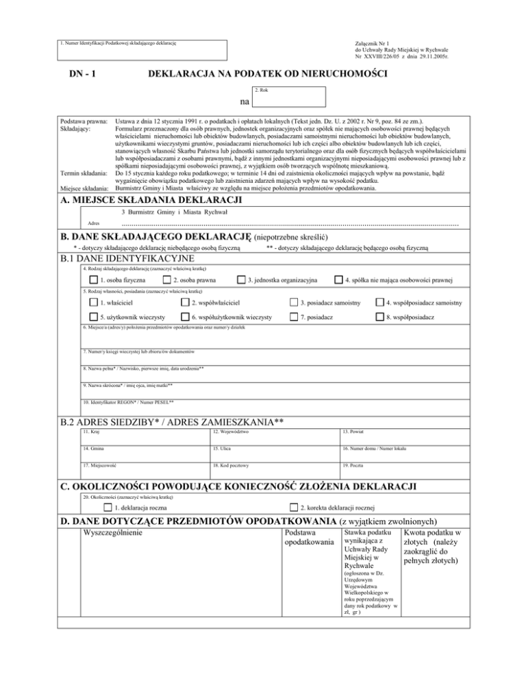 1. Numer Identyfikacji Podatkowej składają cego deklarację DN - 1 Załą cznik Nr 1 do Uchwały Rady Miejskiej w Rychwale Nr XXVIII/226/05 z dnia 29.11.2005r. DEKLARACJA NA PODATEK OD NIERUCHOMOŚ CI 2. Rok na Ustawa z dnia 12 stycznia 1991 r. o podatkach i opłatach lokalnych (Tekst jedn. Dz. U. z 2002 r. Nr 9, poz. 84 ze zm.). Formularz przeznaczony dla osób prawnych, jednostek organizacyjnych oraz spółek nie mają cych osobowości prawnej będą cych właścicielami nieruchomości lub obiektów budowlanych, posiadaczami samoistnymi nieruchomości lub obiektów budowlanych, użytkownikami wieczystymi gruntów, posiadaczami nieruchomości lub ich części albo obiektów budowlanych lub ich części, stanowią cych własność Skarbu Państwa lub jednostki samorządu terytorialnego oraz dla osób fizycznych będą cych współwłaścicielami lub współposiadaczami z osobami prawnymi, bą dź z innymi jednostkami organizacyjnymi nieposiadają cymi osobowości prawnej lub z spółkami nieposiadają cymi osobowości prawnej, z wyją tkiem osób tworzą cych wspólnotę mieszkaniową . Do 15 stycznia każdego roku podatkowego; w terminie 14 dni od zaistnienia okoliczności mają cych wpływ na powstanie, bądź wygaśnięcie obowią zku podatkowego lub zaistnienia zdarzeń mają cych wpływ na wysokość podatku. Burmistrz Gminy i Miasta właściwy ze względu na miejsce położenia przedmiotów opodatkowania. Podstawa prawna: Składający: Termin składania: Miejsce składania: A. MIEJSCE SKŁ ADANIA DEKLARACJI 3 Burmistrz Gminy i Miasta Rychwał ........................................................................................................................................................................ Adres B. DANE SKŁ ADAJĄ CEGO DEKLARACJĘ (niepotrzebne skreślić ) * - dotyczy składają cego deklarację niebędą cego osobą fizyczną ** - dotyczy składają cego deklarację będącego osobą fizyczną B.1 DANE IDENTYFIKACYJNE 4. Rodzaj składają cego deklarację (zaznaczyć właściwą kratkę) 1. osoba fizyczna 2. osoba prawna 3. jednostka organizacyjna 4. spółka nie mają ca osobowości prawnej 5. Rodzaj własności, posiadania (zaznaczyć właściwą kratkę) 1. właściciel 2. współwłaściciel 3. posiadacz samoistny 4. współposiadacz samoistny 5. użytkownik wieczysty 6. współużytkownik wieczysty 7. posiadacz 8. współposiadacz 6. Miejsce/a (adres/y) położenia przedmiotów opodatkowania oraz numer/y działek 7. Numer/y księgi wieczystej lub zbioru/ów dokumentów 8. Nazwa pełna* / Nazwisko, pierwsze imię, data urodzenia** 9. Nazwa skrócona* / imię ojca, imię matki** 10. Identyfikator REGON* / Numer PESEL** B.2 ADRES SIEDZIBY* / ADRES ZAMIESZKANIA** 11. Kraj 12. Województwo 13. Powiat 14. Gmina 15. Ulica 16. Numer domu / Numer lokalu 17. Miejscowość 18. Kod pocztowy 19. Poczta C. OKOLICZNOŚ CI POWODUJĄ CE KONIECZNOŚ Ć ZŁ OŻ ENIA DEKLARACJI 20. Okoliczności (zaznaczyć właściwą kratkę) 1. deklaracja roczna 2. korekta deklaracji rocznej D. DANE DOTYCZĄ CE PRZEDMIOTÓ W OPODATKOWANIA (z wyją tkiem zwolnionych) Wyszczególnienie Podstawa opodatkowania Stawka podatku wynikają ca z Uchwały Rady Miejskiej w Rychwale (ogłoszona w Dz. Urzędowym Województwa Wielkopolskiego w roku poprzedzają cym dany rok podatkowy w zł, gr ) wwww zł, gr Kwota podatku w złotych (należy zaokrą glić do pełnych złotych) D.1 POWIERZCHNIA GRUNTÓ W 1. zwią zanych z prowadzeniem działalności gospodarczej, bez względu na sposób zakwalifikowania w ewidencji gruntów i budynków 2. pod jeziorami, zajętych na zbiorniki wodne retencyjne lub elektrowni wodnych 3. pozostałe grunty 21. 22. m2 24. , 25. ha 27. 30. w tym: - kondygnacji o wysokości od 1,40 do 2,20 m (zaliczyć 50% powierzchni) 33. m2 , , 29. , 31. , 32. , 34. - kondygnacji o wysokości powyżej 2,20 m , 26. 28. m2 D.2 POWIERZCHNIA UŻ YTKOWA BUDYNKÓ W LUB ICH CZĘ ŚCI (*) 1. mieszkalnych – ogółem 23. , 35. m2 , , m2 , , * Do powierzchni użytkowej budynku lub jego części należy zaliczyć powierzchnię mierzoną , po wewnętrznej długości ścian na wszystkich kondygnacjach, z wyją tkiem powierzchni klatek schodowych oraz szybów dźwigowych. Za kondygnację uważa się również garaże podziemne, piwnice, sutereny i poddasza użytkowe. 2. zwią zanych z prowadzeniem działalności gospodarczej oraz od części budynków mieszkalnych zajętych na prowadzenie działalności gospodarczej ogółem, 36. 37. w tym: - kondygnacji o wysokości od 1,40 do 2,20 m (zaliczyć 50% powierzchni) - kondygnacji o wysokości powyżej 2,20 m 3. zajęte na prowadzenie działalności gospodarczej w zakresie obrotu kwalifikowanym materiałem siewnym ogółem, , , m2 m2 , , , , 40. - kondygnacji o wysokości powyżej 2,20 m 41. m2 , , m2 m2 , , , , 42. 43. w tym: - kondygnacji o wysokości od 1,40 do 2,20 m (zaliczyć 50% powierzchni) - kondygnacji o wysokości powyżej 2,20 m 5. pozostałych ogółem m2 39. w tym: - kondygnacji o wysokości od 1,40 do 2,20 m (zaliczyć 50% powierzchni) 4. zajęte na prowadzenie działalności gospodarczej w zakresie świadczenia usług medycznych ogółem, 38. 44. 2 m , , m2 m2 , , , , 45. 46. 47. , , m2 , , m2 , , 2 m w tym: - kondygnacji o wysokości od 1,40 do 2,20 m (zaliczyć 50% powierzchni) - kondygnacji o wysokości powyżej 2,20 m D.3 BUDOWLE 1. budowle (wartość , o której mowa w przepisach o podatkach dochodowych) 48. 49. 50. , , E. Ł Ą CZNA KWOTA PODATKU Kwota podatku Suma kwot z kol. D (należy zaokrą glić do pełnych złotych ) 51. , F. INFORMACJA O PRZEDMIOTACH ZWOLNIONYCH (podać powierzchnię, bą dź wartość budowli przedmiotów zwolnionych oraz przepis prawa - z jakiego tytułu występuje zwolnienie) G. OŚ WIADCZENIE I PODPIS SKŁ ADAJĄ CEGO / OSOBY REPREZENTUJĄ CEJ SKŁ ADAJĄ CEGO Oświadczam, że podane przeze mnie dane są zgodne z prawdą. 52. Imię 53. Nazwisko 54. Data wypełnienia (dzień - miesią c - rok) 55. Podpis (pie