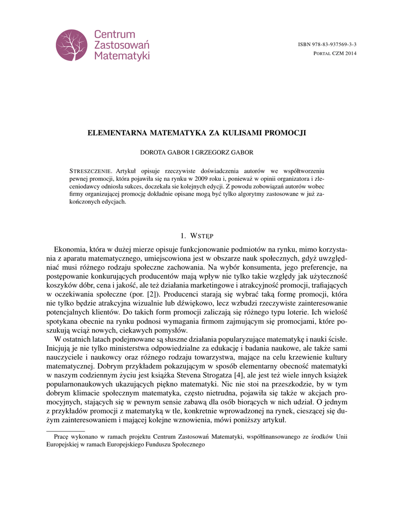 Prac˛e wykonano w ramach projektu Centrum Zastosowań Matematyki, współfinansowanego ze środków Unii