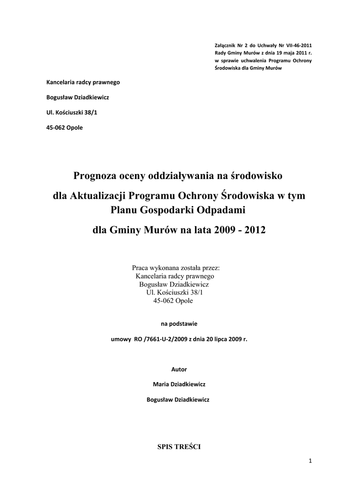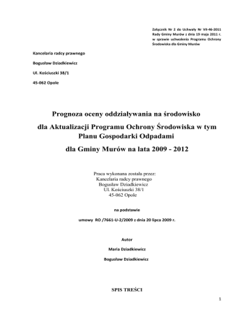 Załącznik Nr 2 do Uchwały Nr VII-46-2011 Rady Gminy Murów z dnia 19 maja 2011 r. w sprawie uchwalenia Programu Ochrony Środowiska dla Gminy Murów Kancelaria radcy prawnego Bogusław Dziadkiewicz Ul. Kościuszki 38/1 45-062 Opole Prognoza oceny oddziaływania na środowisko dla Aktualizacji Programu Ochrony Środowiska w tym Planu Gospodarki Odpadami dla Gminy Murów na lata 2009 - 2012 Praca wykonana została przez: Kancelaria radcy prawnego Bogusław Dziadkiewicz Ul. Kościuszki 38/1 45-062 Opole na podstawie umowy RO /7661-U-2/2009 z dnia 20 lipca 2009 r. Autor Maria Dziadkiewicz Bogusław Dziadkiewicz SPIS TREŚCI 1 Rozdział Pierwszy Informacje o zawartości, głównych celach projektowanego dokumentu oraz jego powiązaniach z innymi dokumentami. 1. Zawartość i cele projektowanego dokumentu 4 2. Powiązania z innymi dokumentami Prognozy Oceny Oddziaływania na Środowisko dla Gminy Murów 5 3. Informacje o metodach zastosowanych przy sporządzaniu prognozy 6 4. Propozycje dotyczące przewidywanych metod analizy skutków realizacji postanowień projektowanego przeprowadzania dokumentu oraz częstotliwości jej 7 Rozdział Drugi Określenie, analiza i ocena istniejącego stanu środowiska 1. Charakterystyka i ocena aktualnego środowiska Gminy Murów 1.1.Warunki klimatyczne 1.2. Budowa geologiczna 1.3.Surowce mineralne 1.4.Gleby i powierzchnia ziemi 1.4.1.Stan zanieczyszczenia gleb 1.5.Wody i gospodarka wodno-ściekowa 1.5.1 Wody powierzchniowe 1.5.2. Wody podziemne 1.5.3. Gospodarka wodno – ściekowa 1.5.3.1. Zaopatrzenie w wodę 1.5.3.2. Odprowadzanie i oczyszczanie ścieków 1.6.Powietrze atmosferyczne 1.6.1 Źródła i emisja zanieczyszczeń powietrza w gminie 1.6.2. Stan powietrza w gminie 1.7. Hałas 1.7.1 Klimat akustyczny 1.7.2. Źródła emisji hałasu na terenie gminy Murów 1.8.Gospodarka odpadami 1.9.Promieniowanie niejonizujące 1.10.Środowisko przyrodnicze 1.10.1 Flora 1.10.2. Fauna 1.10.3. Pomniki przyrody 1.10.4. Łąki 1.10.5. Lasy 1.10.6. Obszary podlegające ochronie 8 9 9 9 9 10 10 10 11 11 12 12 12 12 13 13 13 14 14 15 16 16 18 19 20 21 21 2.Zmiany stanu środowiska w przypadku braku realizacji projektowanego dokumentu 22 Rozdział Trzeci 2 1. Stan środowiska na obszarach objętych przewidywanym znaczącym oddziaływaniem Programu Ochrony Środowiska w tym Planu Gospodarki Odpadami dla gminy Murów 25 2. Istniejące problemy ochrony środowiska istotne z punktu widzenia realizacji projektowanego dokumentu, w szczególności dotyczące obszarów podlegających ochronie na podstawie ustawy z dnia 16 kwietnia 2004 r. o ochronie przyrody 25 3. Cele ochrony środowiska ustanowione na szczeblu międzynarodowym, wspólnotowym i krajowym, istotne z punktu widzenia projektowanego dokumentu, oraz sposoby, w jakich te cele i inne problemy środowiska zostały uwzględnione podczas opracowywania dokumentu 26 3.1.Cele w zakresie gospodarki odpadami 27 3.2.Cele w zakresie jakości powietrza 28 3.3.Cele w zakresie ochrony gleby 28 3.4.Cele w zakresie stosunków wodnych i ochrony wód 29 3.5. Cele w zakresie ograniczenia hałasu 29 3.6. Cele do osiągnięcia dla gminy Murów w przypadku nadzwyczajnych zagrożeń dla środowiska 30 3.7. Cele w zakresie ochrony różnorodności biologicznej 30 3.8. Cele w zakresie infrastruktury 30 4. Przewidywane znaczące oddziaływania, w tym oddziaływania bezpośrednie, pośrednie, wtórne, skumulowane, krótkoterminowe, średnioterminowe i długoterminowe, stałe i chwilowe oraz pozytywne i negatywne, na cele i przedmiot ochrony obszaru NATURA 2000 31 Rozdział Czwarty 1. Rozwiązania mające na celu zapobieganie, ograniczanie lub kompensację przyrodniczą negatywnych oddziaływań na środowisko, mogących być rezultatem realizacji projektowanego dokumentu, w szczególności na cele i przedmiot ochrony obszaru Natura 2000 oraz integralność tego obszaru 34 2. Rozwiązania alternatywne do rozwiązań zawartych w projektowanym dokumencie wraz z uzasadnieniem ich wyboru, oraz opis metod dokonania oceny prowadzącej do tego wyboru, w tym także wskazanie napotkanych trudności wynikających z niedostatku techniki, lub luk we współczesnej wiedzy 27 3. Informacje o możliwym transgranicznym oddziaływaniu na środowisko 36 4. Streszczenie sporządzone w języku niespecjalistycznym 36 Załącznik mapowy i bibliografia 40 Rozdział Pierwszy 3 Informacje o zawartości, głównych celach projektowanego dokumentu oraz jego powiązaniach z innymi dokumentami. 1. Zawartość i cele projektowanego dokumentu Prognozę oddziaływania na środowisko wykonano w oparciu o przepisy ustawy z dnia 3 października 2008 roku o udostępnianiu informacji o środowisku i jego ochronie, udziale społeczeństwa w ochronie środowiska oraz o ocenach oddziaływania na środowisko (Dz. U. 2008 nr 199 poz. 1227 z póżn. Zm.), oraz Art.17 ust. 1 Ustawy z dnia 27 kwietnia 2001 r. Prawo ochrony środowiska( Dz. U z 2008 r. Nr 25, poz.150 ze zm.). Opracowanie Prognozy Oceny Oddziaływania na Środowisko ma na celu określić, jak aktualne przedsięwzięcia i zadania w zakresie ochrony środowiska w Gminie Murów wpłyną na bezpieczeństwo ekologiczne społeczności gminy, oraz wskazać kierunki działania zmierzające do zatrzymania degradacji środowiska, doprowadzając do równowagi ekologicznej bez wpływu na zahamowanie procesów gospodarczych. Przedmiotem prognozy jest projekt Gminnego Programu Ochrony środowiska, w tym Planu Gospodarki odpadami na lata 2009 – 2012. Prognozę oddziaływania na środowisko wykonano w oparciu o przepisy ustawy z dnia 21 kwietnia 2001 r. – Prawo ochrony środowiska, dyrektywy Parlamentu Europejskiego i Rady 2001/42/WE z dnia 27 czerwca 2001 r. w sprawie oceny skutków niektórych planów i programów oraz dyrektywy 2003/4/WE w sprawie publicznego dostępu do informacji dotyczących środowiska. Zgodnie z wymogami ustawy Prawo ochrony środowiska, oraz odpowiednimi przepisami prawa Unii Europejskiej ( dyrektywa sprawie o