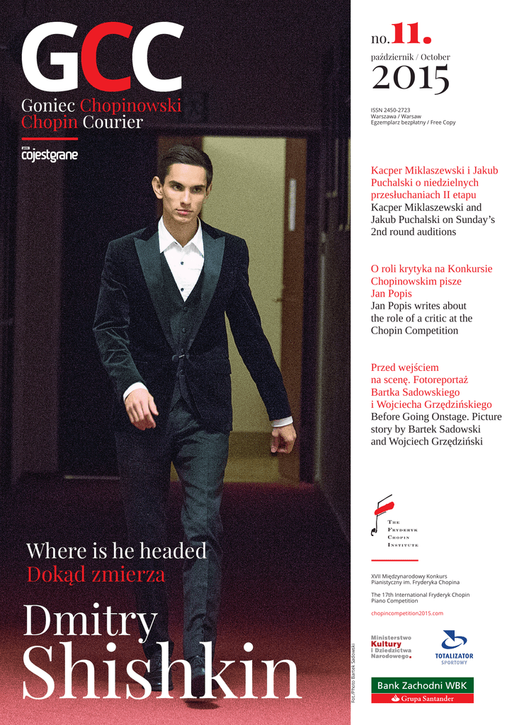 11. no. 2015 październik / October ISSN 2450-2723 Warszawa / Warsaw Egzemplarz bezpłatny / Free Copy Kacper Miklaszewski i Jakub Puchalski o niedzielnych przesłuchaniach II etapu Kacper Miklaszewski and Jakub Puchalski on Sunday’s 2nd round auditions O roli krytyka na Konkursie Chopinowskim pisze Jan Popis Jan Popis writes about the role of a critic at the Chopin Competition Przed wejściem na scenę. Fotoreportaż Bartka Sadowskiego i Wojciecha Grzędzińskiego Before Going Onstage. Picture story by Bartek Sadowski and Wojciech Grzędziński Where is he headed Dokąd zmierza Shishkin The 17th International Fryderyk Chopin Piano Competition chopincompetition2015.com Fot./Photo Bartek Sadowski Dmitry XVII Międzynarodowy Konkurs Pianistyczny im. Fryderyka Chopina Wydawca/Publisher: Narodowy Instytut Fryderyka Chopina Redaktor Naczelna/Editor -in-Chief: Agata Kwiecińska Redaktor Prowadząca /Commissioning Editor: Dorota Kozińska Redakcja/Editorial Staff: Magdalena Romańska, Krzysztof Komarnicki Projekt graficzny/Layout: Joanna Cymkiewicz (INFOR IT) Tłumacze/Translators: Cara Thornton, Michał Szostało Lidia Kozubek (19 stycznia 1927 – 11 października 2015) – Była damą z temperamentem – wspomina prof. Andrzej Jasiński. – Ceniłem ją za inteligencję i żywość umysłu. Kiedyś powiedziała: „Przyjedzie tu dziewczyna, która wszystkich zawojuje”. I zawojowała. Była to Martha Argerich. Poznały się we Włoszech, dokąd Lidia Kozubek jeździła, by uczyć się pod okiem Artura Benedettiego Michelangelego. Druk/Print: Perfekt S.A. – Pani Profesor była bardzo zaangażowana w Konkurs. Przed pięciu laty była jedną z ulubionych komentatorek naszych widzów i niezwykle wyrazistą osobowością w studiu – wspomina Robert Kamyk z TVP Kultura. – W tym roku także byliśmy umówieni. Pani Lidia miała się pojawić u nas 4 października. Dwa dni wcześniej dostaliśmy wiadomość, że trafiła do szpitala. Wysłuchała Agata Kwiecińska Lidia Kozubek (19 January 1927–11 October 2015) ‘She was a lady with temperament,’ recalls Prof. Andrzej Jasiński. ‘I esteemed her for her intelligence and liveliness of mind. She once said, “There is a girl who will come here and win everyone’s heart.” And indeed she did. It was Martha Argerich. They had met in Italy, where Lidia Kozubek was traveling from time to time to study under Arturo Benedetti Michelangeli.’ GCC Goniec Chopinowski / Chopin Courier 10.00 Alexei Tartakovsky 10.35 Alexander Ullman Wielka Brytania/UK 11.10 Chao Wang Chiny/China – Ostatniego Konkursu intensywnie słuchała – mówi Andrzej Jasiński. – Miała porady i dla mnie – jurora. Wskazywała pianistów, których powinienem zauważyć, podpowiadała, żebym zwracał uwagę na tych, którzy mają indywidualność i temperament. – Jej repertuar koncertowy ogniskował się wokół muzyki polskiej. Lidia Kozubek wprowadziła na estrady wiele dzieł, m.in. utwory Marii Szymanowskiej. Wykonywała też Fantazję Henryka Pachulskiego na fortepian z orkiestrą – dodaje Stanisław Dybowski. – Jako uczennica Michelangelego posiadła umiejętność grania pięknym dźwiękiem i kształtowania formy. Było to zgodne z logiką muzyczną, ale też ze stylem danego kompozytora i epoki: odbyła wszak studia muzykologiczne. Jako jedna z pierwszych w Polsce grała na fortepianie historycznym. 2 Sesja poranna / Morning session Stany Zjednoczone/USA Urodziła się w Poznaniu. Studia pianistyczne podjęła w Katowicach w 1948 roku, w klasie Władysławy Markiewiczówny. Muzykologię studiowała na Uniwersytecie Jagiellońskim u Zdzisława Jachimeckiego. Działalność koncertową rozpoczęła w 1949 roku. Po uzyskaniu dyplomu katowickiej Państwowej Wyższej Szkoły Muzycznej podjęła studia u profesora Jana Ekiera w PWSM w Warszawie. Skład/DTP: Agora S.A. Korekta/Proofreading: Agora S.A. Harmonogram dnia / Schedule of the day Born in Poznań, she took up studies in piano performance with Władysława Markiewiczówna in 1948, and studied musicology at the Jagiellonian University with Zdzisław Jachimecki. She began her concert career in 1949. After receiving her diploma at the Katowice State Music College, she took up studies with Prof. Jan Ekier at the State Music College in Warsaw. ‘She listened to the last Competition intensively,’ says Andrzej Jasiński. ‘She had advice for me as a juror. She pointed out pianists whom I should notice, suggested that I pay attention to those who have individuality and temperament.’ ‘Her concert repertoire focused on Polish music. Lidia Kozubek introduced many works to the stage, among them pieces by Maria Szymanowska. She also performed Henryk Pachulski’s Fantasy for piano and orchestra,’ adds Stanisław Dybowski. ‘As a student of Michelangeli, she possessed skill in playing with beautiful sound and in shaping form. This was in accordance with musical logic, but also with the style of the given composer and era: after all, she had studied musicology. She was one of the first pianists in Poland to play a historical instrument. ‘Professor Kozubek was very involved in the Competition. Five years ago, she was one of our audience’s favorite commentators, and an extraordinarily distinctive personality in the studio,’ recalls Robert Kamyk from TVP Kultura. ‘This year as well, we had agreed she would come. Mme Lidia was supposed to appear in our studio on 4 October. Two days before, we received the news that she had gone into the hospital.’ Interviewed by: Agata Kwiecińska 12.15 Andrzej Wierciński Polska/Poland 12.50 Zi Xu Chiny/China Sesja popołudniowa / Afternoon session 17.00 Yike (Tony) Yang Kanada/Canada 17.35 Cheng Zhang Chiny/China 18.10 Annie Zhou Kanada/Canada 19.15 Soo Jung Ann Korea Płd./South Korea 19.50 Miyako Arishima Japonia/Japan Zdaniem recenzentów / In the Reviewers’ Opinion nistyki chopinowskiej. Onodzie brakło jednak czasem precyzji; w starannie przemyślanym Sche