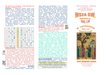 Pan jest dobry dla wszystkich, a Jego miłosierdzie nad wszystkim, co stworzył. (Ps 145) Krzyżówka: 1. Zwierzchnik celników, bardzo chciał zobaczyć Jezusa 2. Nazwa miasta, do którego wszedł Jezus 3. Tak bowiem Bóg umiłował świat, że dał swojego Syna … 4. „Każdy, kto w Niego wierzy, ma życie … 5. Jezus wszedł do Jerycha i … przez miasto. 6. Syn Człowieczy przyszedł szukać i … to, co zginęło. 7. . Zacheusz rzekł do Pana: „oto połowę mego ... daję ubogim” 8. „Wszyscy, widząc to, szemrali: Do … poszedł w gościnę” 9. Zacheusz rzekł do Pana: „:jeśli kogo w czym … zwracam poczwórnie”.10. Jezus rzekł do niego: Dziś zbawienie stało się … tego domu 11 Zacheusz wspiął się na … aby móc ujrzeć Jezusa. 12. Zacheusz zeszedł z pośpiechem (z sykomory) i przyjął Jezusa … 1 Z H U Z x x x x x x x x x x x 2 J R O x x 3 J D R D N O x 4 W E Z E x x x x x x x x 5 P E H D Ł x 6 Z W Ć x x x x x x x x x x 7 x M J T U x x x x x x 8 G E N A x x x x 9 S Z W Z Ł M x x x x x 10 U Z Ł M x x x x x x 11 S K O Ę x x 12 R Z A O Y x x Papież Franciszek - Bez miłości Chrystusa, bez życia tą miłością, bez uznania jej, karmienia się nią nie można być chrześcijaninem. Chrześcijanin czuje na sobie wzrok Chrystusa, czuje się ukochany przez Pana aż do końca. Chrześcijanin czuje, wie, że jego życie zostało zbawione, uratowane przez Chrystusa – to jest ta miłość – … postawmy sobie pytanie: czy bardziej podobny jestem do Pawła, czy też do Jerozolimy? Czy moja miłość względem Boga jest tak mocna, jak miłość Pawła, czy też moje serce jest letnie jak serce Jerozolimy? – Niech Pan, za wstawiennictwem bł. Jana Pawła II, pomoże nam odpowiedzieć na to pytanie. Niech się tak stanie! –… [podczas Mszy św. w kaplicy św. Sebastiana, gdzie znajduje się grób bł. Jana Pawła II, 31 października 2013]. Jan Paweł II - … Między Bogiem a człowiekiem - choć każdy przebywa w swoim własnym świecie - istnieje jedyna w swoim rodzaju więź wzajemności" (n. 17) … Potrzeba znalezienia fundamentu, na którym można zbudować życie osobiste i społeczne, daje się szczególnie mocno odczuć zwłaszcza wówczas, gdy człowiek przekonuje się, jak niepełne są propozycje, które rzeczywistość doraźną i przemijającą wynoszą do rangi wartości, budząc fałszywe nadzieje na odkrycie prawdziwego sensu istnienia. Pod ich wpływem wielu ludzi doprowadza swoje życie na krawędź przepaści, nie zdając sobie sprawy, co ich czeka. Przyczyną tego jest także fakt, że niejednokrotnie ci, którzy zostali powołani, aby w różnych formach kultury ukazywać owoce swoich przemyśleń, odwrócili spojrzenie od prawdy, przedkładając doraźny sukces nad trud cierpliwego poszukiwania tego, co naprawdę warto uczynić treścią życia. (6) [Fides et ratio]. Stefan Kardynał Wyszyński - Świętość nie jest łatwym życiem, nie jest odgrodzeniem się od świata – jest wytrwałą walką z sobą, jest otwieraniem serca i dłoni ku braciom. [Kromka Chleba, 01.XI]. Kilkakrotnie w ciągu roku w tekstach mszalnych wraca postać Zacheusza, który nigdy się nie znudzi i nie zestarzeje. – Można go chyba nazwać patronem współczesnych ateistów, tych, którzy uważają, że odwrócili się od Jezusa, ale po cichu interesują się Nim. - Czasem taki ateusz przyjdzie do kościoła, siedzi dłużej czy krócej, podobny do urzędnika Zacheusza, i chce się wdrapać na drzewo, żeby choć z daleka zobaczyć Ewangelię. – Czasem klęka w pustym konfesjonale (sam widziałem) i kiedy pojawia się ksiądz, ucieka w te pędy, jak ptak z gałęzi drzewa. - Jedna z umierających po spowiedzi zadeklarowała, że chce mieć pogrzeb laicki. Można pomyśleć, cóż to za nawrócenie? – Może się też przypomnieć Zacheusz. Tak jak on, chciała wdrapać się na drzewo, zobaczyć Jezusa, ale nie opowiadać i nie pokazywać tego ludziom. – Zacheusz jest cichym protestem przeciwko niedyskrecji wobec ludzi, którzy borykają się z przeżyciami religijnymi, chcą je ukrywać, aby być tylko sam na sam z Panem Bogiem. [x Jan INSTYTUT MATKI I DZIECKA . ul. Kasprzaka 17 KAPLICA ŚW. RODZINY (OBOK IZBY PRZYJĘĆ) Twardowski, W świetle Ewangelii, wyd: W drodze 05, s. 271]. MOJE POSTANOWIENIE: Pomodlę się o Miłosierdzie Boże dla moich bliskich zmarłych … i pomoc dla tych, którzy upadają na złych drogach swojego życia … Kapelan IMiDz- x. Proboszcz A. Wójtowicz - 22 632 38 00 e-mail : [email protected] http://www.stanislaw-bm.pl/ Parafia Św. Stanisława BM-01-244 Warszawa; ul.Bema73/75 nr naszego konta bank.: 23 2490 0005 0000 4500 1511 3922 [gazetka do użytku wewnętrznego Instytutu] Spowiedź pół godziny przed i po Mszy Św. oraz na prośbę. Tak bowiem Bóg umiłował świat, że dał swojego Syna Jednorodzonego, każdy, kto w Niego wierzy, ma życie wieczne. (J 3,16) Łk 19,1-10 Jezus wszedł do Jerycha i przechodził przez miasto. A był tam pewien człowiek, imieniem Zacheusz, zwierzchnik celników i bardzo bogaty. Chciał on koniecznie zobaczyć Jezusa, kto to jest, ale nie mógł z powodu tłumu, gdyż był niskiego wzrostu. Pobiegł więc naprzód i wspiął się na sykomorę, aby móc Go ujrzeć, tamtędy bowiem miał przechodzić. Gdy Jezus przyszedł na to miejsce, spojrzał w górę i rzekł do niego: Zacheuszu, zejdź prędko, albowiem dziś muszę się zatrzymać w twoim domu. Zeszedł więc z pośpiechem i przyjął Go rozradowany. A wszyscy, widząc to, szemrali: Do grzesznika poszedł w gościnę. Lecz Zacheusz stanął i rzekł do Pana: Panie, oto połowę mego majątku daję ubogim, a jeśli kogo w czym skrzywdziłem, zwracam poczwórnie. Na to Jezus rzekł do niego: Dziś zbawienie stało się udziałem tego domu, gdyż i on jest synem Abrahama. Albowiem Syn Człowieczy przyszedł szukać i zbawić to, co zginęło. Ziarnko piasku nie jest zbyt małe ani poranna rosa zbyt ulotna, żeby nie mogły za