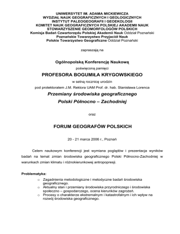 UNIWERSYTET IM. ADAMA MICKIEWICZA WYDZIAŁ NAUK GEOGRAFICZNYCH I GEOLOGICZNYCH INSTYTUT PALEOGEOGRAFII I GEOEKOLOGII KOMITET NAUK GEOGRAFICZNYCH POLSKIEJ AKADEMII NAUK STOWARZYSZENIE GEOMORFOLOGÓW POLSKICH Komisja Badań Czwartorzędu Polskiej Akademii Nauk Oddział Poznański Poznańskie Towarzystwo Przyjaciół Nauk Polskie Towarzystwo Geograficzne Oddział Poznański zapraszają na Ogólnopolską Konferencję Naukową poświęconą pamięci PROFESORA BOGUMIŁA KRYGOWSKIEGO w setną rocznicę urodzin pod protektoratem J.M. Rektora UAM Prof. dr. hab. Stanisława Lorenca Przemiany środowiska geograficznego Polski Północno – Zachodniej oraz FORUM GEOGRAFÓW POLSKICH 20 - 21 marca 2006 r., Poznań Celem naukowym konferencji jest wymiana poglądów i prezentacja wyników badań na temat zmian środowiska geograficznego Polski Północno-Zachodniej w warunkach zmian klimatu i różnokierunkowej antropopresji. Problematyka: o Zagadnienia metodologiczne i metodyczne badań środowiska geograficznego. o Aktualny stan i przemiany środowiska przyrodniczego i środowiska społeczno – gospodarczego, ocena kierunków zagrożeń. o Procesy o charakterze ekstremalnym i katastrofalnym i ich wpływ na rozwój środowiska geograficznego. Przewidywany program: 20 marca 2006, godz.1000 – Otwarcie konferencji Sesja okolicznościowa Sesja plenarna, referaty zamawiane Przerwa obiadowa Sesja posterowa Sesja referatowa Spotkanie towarzyskie 21 marca 2006, godz. 900 – Sesja plenarna – Forum Geografów Polskich Sesja referatowa Przerwa obiadowa Sesja referatowa Zakończenie konferencji Terminy: Zgłoszenie uczestnictwa w Konferencji i Forum wraz z podaniem tytułu referatu, komunikatu lub posteru, prosimy kierować na niżej podany adres do 31grudnia 2005 r. Na nadesłanie tekstów proponowanych wystąpień wraz z ilustracjami oczekujemy do 31 stycznia 2006 r. Czas wygłoszenia referatu: 20 minut Czas wygłoszenia komunikatu: 10 minut Organizatorzy zapewniają rzutniki pisma i projektor multimedialny. Orientacyjny koszt wpisowego: 100 zł Dalsze szczegóły związane z programem, sposobem przygotowania nadsyłanych referatów oraz kosztów uczestnictwa zostaną podane w Komunikacie nr 2, który zostanie przesłany w terminie do 15 stycznia 2006. Przewodniczący Komitetu Organizacyjnego Dziekan Wydziału Nauk Geograficznych i Geologicznych Prof. dr hab. Andrzej Kostrzewski Prof. dr hab. Henryk Rogacki Adres korespondencyjny: dr Jolanta Czerniawska Instytut Paleogeografii i Geoekologii UAM ul. Dzięgielowa 27, 61-680 Poznań tel.61 829 61 93, 61 829 61 75; fax.: 61 829 62 71 z dopiskiem”Konferencja” e-mail:[email protected] KARTA ZGŁOSZENIA UCZESTNICTWA Ogólnopolska Konferencja Naukowa poświęcona pamięci PROFESORA BOGUMIŁA KRYGOWSKIEGO w setną rocznicę urodzin Przemiany środowiska geograficznego Polski Północno – Zachodniej oraz FORUM GEOGRAFÓW POLSKICH 20 - 21 marca 2006 r., Poznań Zgłaszam uczestnictwo: Tytuł naukowy, imię i nazwisko: Miejsce pracy (nazwa i adres instytucji): NIP instytucji Telefon kontaktowy: Adres e-mailowy do korespondencji: referat poster komunikat bez wystąpienia Zgłaszam ( X ) Tytuł referatu, komunikatu lub posteru: Rezerwacja noclegów: 19 / 20.03.2006 20 / 21 03.2006 . 20 03.2006 21 03.2006 Pokoje jedno i dwuosobowe o wyższym standardzie (koszt za pokój ze śniadaniem: 140-300 zł) Pokoje jedno i dwuosobowe w domu studenckim (koszt za pokój ze śniadaniem: 70-160 zł) Rezerwacja obiadów (koszt 1 obiadu ok. 25 zł) Zgłaszam swój udział w spotkaniu towarzyskim (ok. 60 zł) ....................................................................... data i podpis