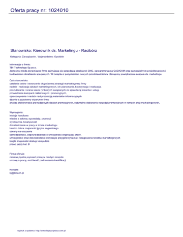 Oferta pracy nr: 1024010 Stanowisko: Kierownik ds. Marketingu - Racibórz Kategoria: Zarządzanie , Województwo: Opolskie Informacje o firmie: TBI Technology Sp.zo.o. Jesteśmy młodą dynamiczną firmą zajmującą się sprzedażą obrabiarek CNC, oprogramowania CAD/CAM oraz samodzielnym projektowaniem i budowaniem obrabiarek specjalnych. W związku z pozyskaniem nowych przedstawicielstw planujemy powiększenie zespołu ds. marketingu. Opis stanowiska: ustalanie celów i stworzenie długofalowej strategii marketingowej firmy nadzór i realizacja działań marketingowych, ich planowanie, koordynacja i realizacja. poszukiwanie i ocena szans rynkowych związanych ze sprzedażą towarów i usług. prowadzenie kampanii reklamowych i promocyjnych, opracowywanie i nadzór nad produkcją materiałów informacyjnych dbanie o pozytywny wizerunek firmy analiza efektywności prowadzonych działań promocyjnych, optymalne dobieranie narzędzi promocyjnych w ramach akcji marketingowych, Wymagania: intuicja handlowa wiedza z zakresu sprzedaży, promocji wyobraźnia, kreatywność doświadczenie w pracy w dziale marketingu bardzo dobra znajomość języka angielskiego otwarty na otoczenie samodzielność, odpowiedzialność i umiejętność organizacji pracy, umiejętności oraz doświadczenie dotyczące przygotowywania i redagowania tekstów marketingowych biegła znajomość obsługi komputera prawo jazdy kat. B Firma oferuje: ciekawą i pełną wyzwań pracę w młodym zespole umowę o pracę, możliwość podnoszenia kwalifikacji Kontakt: [email protected] wydruk z systemu: http://www.lepsza-praca.com.pl
