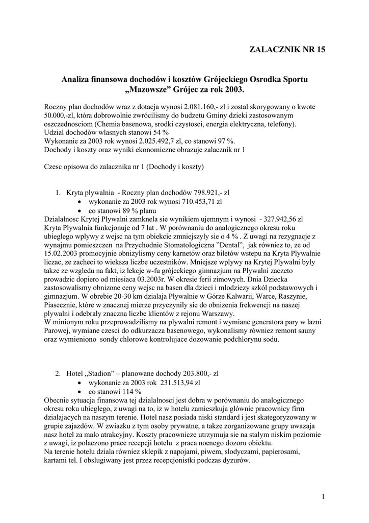 ZALACZNIK NR 15 Analiza finansowa dochodów i kosztów Grójeckiego Osrodka Sportu „Mazowsze” Grójec za rok 2003. Roczny plan dochodów wraz z dotacja wynosi 2.081.160,- zl i zostal skorygowany o kwote 50.000,-zl, która dobrowolnie zwrócilismy do budzetu Gminy dzieki zastosowanym oszczednosciom (Chemia basenowa, srodki czystosci, energia elektryczna, telefony). Udzial dochodów wlasnych stanowi 54 % Wykonanie za 2003 rok wynosi 2.025.492,7 zl, co stanowi 97 %. Dochody i koszty oraz wyniki ekonomiczne obrazuje zalacznik nr 1 Czesc opisowa do zalacznika nr 1 (Dochody i koszty) 1. Kryta plywalnia - Roczny plan dochodów 798.921,- zl • wykonanie za 2003 rok wynosi 710.453,71 zl • co stanowi 89 % planu Dzialalnosc Krytej Plywalni zamknela sie wynikiem ujemnym i wynosi - 327.942,56 zl Kryta Plywalnia funkcjonuje od 7 lat . W porównaniu do analogicznego okresu roku ubieglego wplywy z wejsc na tym obiekcie zmniejszyly sie o 4 % . Z uwagi na rezygnacje z wynajmu pomieszczen na Przychodnie Stomatologiczna ”Dental”, jak równiez to, ze od 15.02.2003 promocyjnie obnizylismy ceny karnetów oraz biletów wstepu na Kryta Plywalnie liczac, ze zacheci to wieksza liczbe uczestników. Mniejsze wplywy na Krytej Plywalni byly takze ze wzgledu na fakt, iz lekcje w-fu grójeckiego gimnazjum na Plywalni zaczeto prowadzic dopiero od miesiaca 03.2003r. W okresie ferii zimowych. Dnia Dziecka zastosowalismy obnizone ceny wejsc na basen dla dzieci i mlodziezy szkól podstawowych i gimnazjum. W obrebie 20-30 km dzialaja Plywalnie w Górze Kalwarii, Warce, Raszynie, Piasecznie, które w znacznej mierze przyczynily sie do obnizenia frekwencji na naszej plywalni i odebraly znaczna liczbe klientów z rejonu Warszawy. W minionym roku przeprowadzilismy na plywalni remont i wymiane generatora pary w lazni Parowej, wymiane czesci do odkurzacza basenowego, wykonalismy równiez remont sauny oraz wymieniono sondy chlorowe kontrolujace dozowanie podchlorynu sodu. 2. Hotel „Stadion” – planowane dochody 203.800,- zl • wykonanie za 2003 rok 231.513,94 zl • co stanowi 114 % Obecnie sytuacja finansowa tej dzialalnosci jest dobra w porównaniu do analogicznego okresu roku ubieglego, z uwagi na to, iz w hotelu zamieszkuja glównie pracownicy firm dzialajacych na naszym terenie. Hotel nasz posiada niski standard i jest skategoryzowany w grupie zajazdów. W zwiazku z tym osoby prywatne, a takze zorganizowane grupy uwazaja nasz hotel za malo atrakcyjny. Koszty pracownicze utrzymuja sie na stalym niskim poziomie z uwagi, iz polaczono prace recepcji hotelu z praca nocnego dozoru obiektu. Na terenie hotelu dziala równiez sklepik z napojami, piwem, slodyczami, papierosami, kartami tel. I obslugiwany jest przez recepcjonistki podczas dyzurów. 1 Z dzialalnosci tej pozyskujemy równiez dochody, które zwiekszaja dodatni wynik dzialalnosci hotelowej. 3. Obiekty sportowe Stadion Grójec. Koszty utrzymania obiektów za rok 2003 wynosza 175.656,69 zl na w/w koszty skladaja sie : Obiekty te sluza celom spolecznym, z których nieodplatnie korzystaja: Klub Sportowy „Mazowsze”, Szkolny Zwiazek Sportowy, Straz Pozarna, Policja, a takze wszyscy chetni w grupach zorganizowanych oraz osoby indywidualne. Utrzymanie jest bardzo kosztowne ze wzgledu na wzrost cen art. potrzebnych do utrzymania i prawidlowego funkcjonowania tego obiektu tj.: koszty energii elektrycznej, cieplnej oraz wody, materialów potrzebnych do konserwacji ( paliwa do kosiarek, nawozy sztuczne, opryski, torf, trawa itp.) jak równiez calodobowy dozór obiektu. 4. Sport – Roczny plan dochodów wynosi : 10.472,-zl Wykonanie dochodów stanowi : 11.002,50 zl, co stanowi 105% Koszty dzialalnosci sportowej wynosza : 80.602,38 zl Wynik na dzialalnosci : 69.599,88 zl Dzialalnosc sportowa opieramy na scislej wspólpracy z Klubami Sportowymi oraz Szkolnym Zwiazkiem Sportowym. Oplacamy z wlasnych srodków zakup nagród, upominków napoi, slodyczy, dyplomów, pucharów, medali dla uczestników i zwyciezców zawodów lekkoatletycznych, plywackich, turniejów szóstek pilkarskich, pilki siatkowej i koszykowej, tenisa stolowego. Oplacilismy równiez sedziów jak i osoby organizujace imprezy, które nadzoruje i koordynuje inspektor do spraw sportu –pracownik Osrodka. Zaklad nasz jak corocznie wlacza sie w organizacje Sportowych imprez okolicznosciowych takich jak : „Swieto Kwitnacych Jabloni”, „Zima w miescie”, Wakacje 2003 zarówno na Stadionie Sportowym, Hali Sportowej, Krytej Plywalni „Wodnik”. 5. Transport Dzialalnosc transportu – planowane dochody za rok 203 wynosza: -86.383,- zl Wykonanie wynosi 71.507.39 zl co stanowi 83% Strata na dzialalnosci transportu wynikla z powaznej awarii silnika, która spowodowala przerwe w swiadczeniu uslug dowozenia dzieci i mlodziezy na basen oraz rozwóz po zajeciach lekcyjnych, jak równiez powazne koszty zwiazane z remontem. Dlatego strata na dzialalnosci transportu wyniosla: -16.385,60 zl (strate te pokrylismy z dochodów dzialalnosci hotelu „Stadion”) 6. Hala Sportowa „Spartakus” Wynik na dzialalnosci Hali Sportowej wraz z zespolem boisk jest ujemny i wynosi : -293.789,70 zl. 2 Jest to najmlodszy ostatnio uruchomiony obiekt, na którym prowadzimy dzialalnosc sportowa i rekreacyjna. Udostepniamy obiekty grupom zorganizowanym (karate, aerobik, pilka siatkowa, nozna, koszykówka) oraz osobom indywidualnym. W godz. Od 8.0 – 17.00 od poniedzialku do piatku hala wraz z zespolem boisk zajeta jest przez Gimnazjum Publiczne, które korzysta z calego obiektu bezplatnie. Wszystkie koszty utrzymania tego obiektu ponosi GOS(jedynie koszty sprzatania hali w okresie roku szkolnego 50% doplaca ZAPO). 7. Korty Tenisowe – dochody ze sprzedazy biletów, karnetów wstepu wynosza : 15.331 zl zas koszty 2.612.15 zl (wynik + 12.718,85 zl) Jest to najmlodszy obiekt uruchomiony przy Osrodku w miesiacu maju 2003. Koszty funkcjonowania tego obiektu sa zmniejszone przez to, ze calosciowa obsluge techniczna i kase prowadza pracown