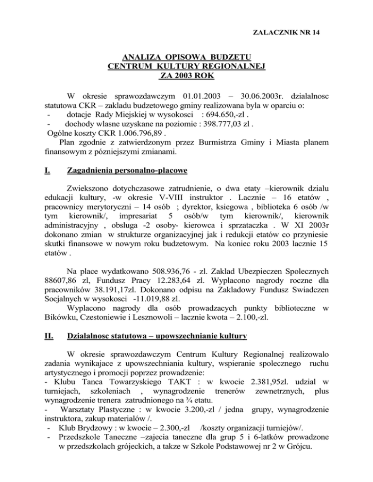 ZALACZNIK NR 14 ANALIZA OPISOWA BUDZETU CENTRUM KULTURY REGIONALNEJ ZA 2003 ROK W okresie sprawozdawczym 01.01.2003 – 30.06.2003r. dzialalnosc statutowa CKR – zakladu budzetowego gminy realizowana byla w oparciu o: dotacje Rady Miejskiej w wysokosci : 694.650,-zl . dochody wlasne uzyskane na poziomie : 398.777,03 zl . Ogólne koszty CKR 1.006.796,89 . Plan zgodnie z zatwierdzonym przez Burmistrza Gminy i Miasta planem finansowym z pózniejszymi zmianami. I. Zagadnienia personalno-placowe Zwiekszono dotychczasowe zatrudnienie, o dwa etaty –kierownik dzialu edukacji kultury, -w okresie V-VIII instruktor . Lacznie – 16 etatów , pracownicy merytoryczni – 14 osób ; dyrektor, ksiegowa , biblioteka 6 osób /w tym kierownik/, impresariat 5 osób/w tym kierownik/, kierownik administracyjny , obsluga -2 osoby- kierowca i sprzataczka . W XI 2003r dokonano zmian w strukturze organizacyjnej jak i redukcji etatów co przyniesie skutki finansowe w nowym roku budzetowym. Na koniec roku 2003 lacznie 15 etatów . Na place wydatkowano 508.936,76 - zl. Zaklad Ubezpieczen Spolecznych 88607,86 zl, Fundusz Pracy 12.283,64 zl. Wyplacono nagrody roczne dla pracowników 38.191,17zl. Dokonano odpisu na Zakladowy Fundusz Swiadczen Socjalnych w wysokosci -11.019,88 zl. Wyplacono nagrody dla osób prowadzacych punkty biblioteczne w Bikówku, Czestoniewie i Lesznowoli – lacznie kwota – 2.100,-zl. II. Dzialalnosc statutowa – upowszechnianie kultury W okresie sprawozdawczym Centrum Kultury Regionalnej realizowalo zadania wynikajace z upowszechniania kultury, wspieranie spolecznego ruchu artystycznego i promocji poprzez prowadzenie: - Klubu Tanca Towarzyskiego TAKT : w kwocie 2.381,95zl. udzial w turniejach, szkoleniach , wynagrodzenie trenerów zewnetrznych, plus wynagrodzenie trenera zatrudnionego na ¾ etatu. - Warsztaty Plastyczne : w kwocie 3.200,-zl / jedna grupy, wynagrodzenie instruktora, zakup materialów /. - Klub Brydzowy : w kwocie – 2.300,-zl /koszty organizacji turniejów/. - Przedszkole Taneczne –zajecia taneczne dla grup 5 i 6-latków prowadzone w przedszkolach grójeckich, a takze w Szkole Podstawowej nr 2 w Grójcu. 2 - Formacja Taneczna WENA: w kwocie 4.500,- zl /oplata instruktora, stroje/ - Warsztaty Teatralne /2.000zl.oplaty instruktorów ./ Na zasadzie odplatnosci prowadzone sa zajecia: - Ogniska Muzycznego w klasie gitary koszty instruktora 3.726,-zl, natomiast wplyw 4.959,-zl. - Studium Nauki Jezyków Obcych – 245 osób o róznym poziomie zaawansowania ; lacznie grup – 25 w Grójcu dzialalo 20 grup /przedszkola, Szkoly Podstawowe, CKR/, w terenie 5 grup .Do prowadzenia kursów zatrudniono 5 lektorów . Koszty prowadzenia zajec: wynagrodzenie lektorów , sal 35.190-zl., wykorzystanie samochodu sluzbowego do zbiórki naleznosci , udostepnienie sal 3.869,- przy dochodach 61.951,-zl. Centrum Kultury Regionalnej bylo organizatorem : - XLVIII Ogólnopolskiego Konkursu Recytatorskiego –w Eliminacjach Powiatowych wzielo udzial 77 recytatorów. Do Eliminacji Rejonowych zakwalifikowalo sie 11 osób a 20 przyznano wyróznienia . Wczesniej zorganizowano Eliminacje gminne, w których wzielo udzial 42 osób /ogólny koszt: w tym nagrody , wyróznienia i oplaty jurorów – 1.500,-zl /. - VI Konkurs Recytatorski „Moja Ojczyzna” /58 recytatorów/ - XXIII Ogólnopolskiego Konkursu Poetyckiego ,,O Laur Jabloni ,, Wplynelo 143 zestawów wierszy, zawierajace 454 utwory poetyckie . Przyznano nagrody glówne oraz wyróznien . /nagrody, honoraria jurorów /- 5.000,-zl - X Edycje Turnieju Wiedzy o Grójcu i Regionie p.n. ,,GRÓJBÓJ,, pt. „Kultura materialna Ziemi Grójeckiej”. Startowalo 26 zespolów 2 – osobowe (11 ze Szkól Podstawowych, 15 z Gimnazjum miejscowosci: Grójec, Belsk, Bledów, Chynów, Jasieniec, Karolew, Kruszew ). /koszty organizacji , nagrody /w ramach Swieta Kwitnacych Jabloni. - IV Grójecka Mini Lista Przebojów /udzial wzielo 53 uczestników w trzech kategoriach wiekowych , /dodatkowo tanczylo 56 dzieci / przy kosztach – 1.300,- zl/ - IV Powiatowy Festiwal Piesni Sakralnej /zgloszono 14 scholi i 33 solistów z calego powiatu/ - na nagrody i komisje przeznaczono –6.500,- zl. - VII Festiwal Piosenki Przedszkolnej /26 dzieci spiewajacych i 34 tanczacych Odbyly sie dwie wystawy zbiorowe Stowarzyszenia Plastyków Ziemi Grójeckiej polaczona z Aukcja , zorganizowano takze wystawe prac pani Danuty Mietelskiej i pani Barbary Wiercikowskiej – Domagaly ( wystawa polaczona z recytacja poezji pani Urszula Raczkowskiej –Cieslik koszt 2.000,- zl. Ponadto zorganizowano 4 imprezy /przedstawienia dla dzieci i mlodziezy/, w których wzielo udzial ok. 1850 osób, wsród nich III Karnawalowe Spotkania z Bajkami, CKR byl organizatorem koncertu zespolu Stare Dobre Malzenstwo i Agnieszki Szewczyk z zespolem PORTHOUSE wraz z Gosia Kunc i zespolem CINNAMONES (finalistki programu IDOL). 2 3 Tradycyjnie juz zorganizowano kweste na rzecz Wielkiej Orkiestry Swiatecznej Pomocy. Centrum Kultury Regionalnej bylo organizatorem miejskich obchodów ; Swieta 3 Maja polaczonych z uroczysta sesja Rady Miejskiej – wyklad prof. zw dr hab. Andrzeja Ajnenkiela program artystyczny „ Piesni Polskie” w wykonaniu artystów scen krakowskich. Zorganizowano uroczystosci poswieconej 60-tej rocznicy smierci generala Wladyslawa Sikorskiego , wraz z odslonieciem tablicy pamiatkowej . 64 rocznica Wybuchu II Wojny Swiatowej. 85 Rocznicy Odzyskania Niepodleglosci. W zwiazku z organizacja uroczystosci CKR pokrywal koszty zaproszen, druku plakatów , koszty dojazdu zespolów itp. W ramach obchodów 85 Rocznicy Odzyskania Niepodleglosci. zorganizowano festyn „Zyj zdrowo Polska Cie potrzebuje”, w czasie którego wystapil zespól szantowy, zespól country, druzyna rycerzy, kabaret „Pigwa Show”. Mozna bylo obejrzec wystepy taneczne dzieci oraz program patriotyczny w wykonaniu dzieci z PSP nr 1. CKR byl organizatorem Konkursów plastycznych: - „ Mrozem malowane” / naplynelo 60 prac/, - „Moja p