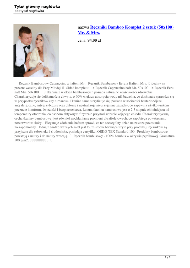 Tytuł główny nagłówka podtytuł nagłówka nazwa Ręczniki Bamboo Komplet 2 sztuk (50x100) Mr. & Mrs. cena: 94.00 zł Ręcznik Bambusowy Cappuccino z haftem Mr. Ręcznik Bambusowy Ecru z Haftem Mrs. idealny na prezent weselny dla Pary Młodej Skład kompletu: 1x Ręcznik Cappuccino haft Mr. 50x100 1x Ręcznik Ecru haft Mrs. 50x100 Tkanina z włókien bambusowych posiada naturalne właściwości zdrowotne. Charakteryzuje się delikatnością chwytu, o 60% większą absorpcją wody niż bawełna, co doskonale sprawdza się w przypadku ręczników czy turbanów. Tkanina sama sterylizuje się, posiada właściwości bakteriobójcze, antyalergiczne, antygrzybiczne oraz chłonie i neutralizuje nieprzyjemne zapachy, co zapewnia użytkownikom poczucie komfortu, świeżości i bezpieczeństwa. Latem, tkanina bambusowa jest o 2-3 stopnie chłodniejsza od temperatury otoczenia, co osobom aktywnym fizycznie przynosi uczucie kojącego chłodu. Charakterystyczną cechą tkaniny bambusowej jest również pochłanianie promieni ultrafioletowych, co zapobiega powstawaniu nowotworów skóry. Elegancje zdobienie haftem sprawi, że ten szczególny dzień na zawsze pozostanie niezapomniany. Jedną z bardzo ważnych zalet jest to, że środki barwiące użyte przy produkcji ręczników są przyjazne dla człowieka i środowiska, posiadają certyfikat OEKO-TEX Standard 100. Produkty bambusowe powstają z natury i do natury wracają. Ręcznik bambusowy - 100% bambus w okrywie pętelkowej Gramatura: 500 g/m2 1/1