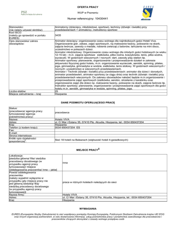 OFERTA PRACY WUP w Poznaniu Numer referencyjny: 10430441 Stanowisko: (nie należy używać skrótów) Kod ISCO: (należy go sprawdzić w portalu EURES) Opis stanowiska/ zakres obowiązków: Liczba etatów: Miejsce zatrudnienia – kraj: Animatorzy (dziecięcy, młodzieżowi, sportowi), technicy (dźwięk i światło) przy przedstawieniach + animatorzy, instruktorzy sportowi 3435 Animator dziecięcy: organizowanie czasu wolnego dla najmłodszych gości Hoteli Viva. Organizowanie gier, zabaw, zajęć sportowych, np.malowanie twarzy, polowanie na skarb, zajęcia twórcze, zawody o medale, robienie zwierząt z balonów, tańczenie na mini disco, uczestnictwo w pokazach dzieci. Animator młodzieżowy: Organizowanie czasu wolnego dla młodych gości hotelowych (w wieku 12-15 lat) - m.in. zajęcia sportowe: siatkówka, piłka nożna, koszykówka, tenis, piłka wodna, wycieczki. W godzinach wieczornych / nocnych: dart, zawody play station itp. Animator sportowy: planowanie, organizowanie i przeprowadzanie działań w zakresie aktywności fizycznej gości hotelu, m.in. organizowanie wycieczek, aerobik, spinning, pilates, joga, gimnastyka, gimnastyka w wodzie, siatkówka, tenis stołowy. W godzinach wieczornych / nocnych: uczestnictwo w wieczornych przedstawieniach. Animator / Technik (dźwięk i światło) przy przedstawieniach: animator dla dzieci i dorosłych, animator przedstawień, animator sportowy (w ciągu dnia) oraz technik (dźwięk i światło) przy przedstawieniach wieczornych. Do zakresu obowiazków należeć będzie m.in.organizowanie i przeprowadzenie zajęć sportowych (siatkówka, aerobic, strzelanie z karabinku oraz organizowanie zajęć dla dzieci np. malowanie twarzy, polowanie na skarb, zajęcia twórcze itp. Instruktor sportowy: planowanie, organizowanie i przeprowadzanie zajęć sportowych dla gości hotelu m.in. aerobik, gimnastyka w wodzie, spinning, pilates, joga. 25 Hiszpania DANE PODMIOTU OFERUJĄCEGO PRACĘ Status: (pracodawca/ agencja pracy tymczasowej/ agencja pośrednictwa pracy) Nazwa: Adres: Kraj: Telefon (z kodem kraju): Fax: E-mail: Strona internetowa: Krótki opis działalności gospodarczeji: pracodawca Hotels VIVA ul. C/ Mar i Estany 35, 07410 Pto. Alcudia, Hiszpania, tel.: 0034 650437204 Hiszpania 0034 650437204 ES Sieć 18 hoteli na Balearach (większość hoteli 4-gwiadkowych) MIEJSCE PRACYii Lokalizacja: [siedziba główna/ filia/ siedziba pracodawcy docelowego (w przypadku agencji pracy tymczasowej)/ miejsce oddelegowania pracownika/ inne – jakie] Powód oddelegowania pracownika: [należy wypełnić wyłącznie w przypadku gdy miejsce pracy nie jest główną siedzibą/ filią/ siedzibą pracodawcy docelowego (w przypadku agencji pracy tymczasowej)] Nazwa firmy: Adres: Kraj: inna praca w różnych hotelach należących do sieci Hotels VIVA ul. C/ Mar i Estany 35, 07410 Pto. Alcudia, Hiszpania, tel.: 0034 650437204 Hiszpania WYMAGANIA EURES (Europejskie Służby Zatrudnienia) to sieć współpracy pomiędzy Komisją Europejską, Publicznymi Służbami Zatrudnienia krajów UE/ EOG oraz innych organizacji partnerskich, w celu dostarczania informacji, usług pośrednictwa pracy i poradnictwa zawodowego dla pracodawców i pracowników chcących skorzystać z zasady wolnego przepływu osób Wykształcenie: Doświadczenie zawodowe: Znajomość języków: Uprawnienia/ dyplomy/ dokumenty (np. prawo jazdy): Inne istotne wymagania: Język 1. angielski Poziom 1. bardzo dobry w mowie bardzo dobry w piśmie Wymagane doświadczenie w pracy na podobnym stanowisku. Wymagana znajomość co najmniej 2 języków obcych (każdy kolejny będzie dodatkowym atutem), język angielski obowiązkowy. Poszukiwane są osoby energiczne, elastyczne, pozytywnie nastawione do ludzi oraz lubiące pracę z ludźmi. Konieczna dostępność od końca marca do listopada. Wymagane doświadczenie / profesjonalne kursy i szkolenia. WYNAGRODZENIE I WARUNKI ZATRUDNIENIA Wysokość pensji brutto: Wysokość pensji netto: Waluta, w jakiej wypłacana jest pensja: Rodzaj stawki wynagrodzenia: (godzinowa/ tygodniowa/ miesięczna/ roczna/ inna) Premie: Dodatkowe świadczenia (zakwaterowanie, wyżywienie, koszty związane ze zmianą miejsca zamieszkania, koszty podróży itp.): 1.414,75 Euro Czasowy ze stawką miesięczną brak danych zakwaterowanie na koszt pracodawcy (pokój w hotelu lub pobliżu kompleksu hotelowego, dzielony ze współpracownikiem tej samej płci. Pracodawca zapewnia wyżywienie (śniadanie, lunch, kolacja oraz ustalona ilość napojów w ciągu dnia). Zwrot kosztów przelotu na Majorkę i z powrotem (do 400 EUR) pod warunkiem wypełnienia postanowień kontraktu. Przed rozpoczęciem sezonu osoba bierze udział w bezpłatnym szkoleniu (od 20 marca do 5 kwietnia 2017 r.), (zagwarantowane wyżywienie, napoje i zakwaterowanie) - za czas szkolenia nie przysługuje wynagrodzenie, ale pracownik nie ponosi żadnych kosztów związanych ze szkoleniem. Okres pracy: po zakończeniu szkolenia do 5 listopada (niektóre osoby mogą zakończyć pracę tydzień lub 2 tygodnie wcześniej). Hotels VIVA Nazwa firmy, z którą zostanie podpisana umowa: Rodzaj umowy: (umowa o pracę, umowa zlecenia, wolontariat, praktyka zawodowa/ staż, umowa o pracę praca zdalna, agencja pracy tymczasowej, inne): Wymiar czasu pracy pełny etat (praca na pełen etat/ część etatu): Czas trwania umowy: określony (nieokreślony/ określony) Liczba godzin tygodniowo: Zmiany i praca w dni wolne: Data rozpoczęcia: Inne informacje: Data wygaśnięcia umowy (w przypadku umowy na czas określony): 2017-11-05 45,00 liczba godzin pracy tygodniowo: 40-45, praca max. 6 dni w tygodniu (Różne godziny pracy w ciągu dnia w zależności od stanowiska i rodzaju zajęć. 2017-04-06 liczba godzin pracy tygodniowo: 40-45, praca max. 6 dni w tygodniu (Różne godziny pracy w ciągu dnia w zależnosci od stanowiska i rodzaju zajęć. SPOSÓB SKŁADANIA WNIOSKU Wymagane dokumenty (list motywacyjny, CV itp.): Język, w którym muszą 