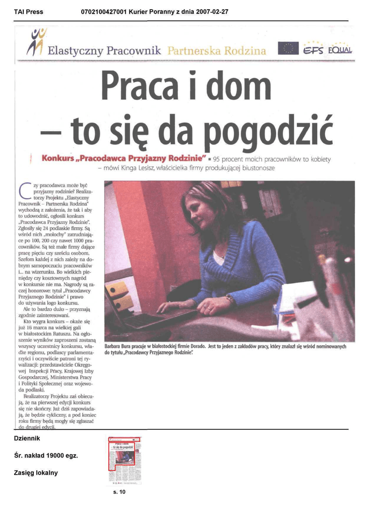 0702100427001 Kurier Poranny z dnia 2007-02-27 TAI Press Elastyczny Pracownik ł artnerska Rodzina l £FS EC Praca idom - to się da pogodzić Konkurs „Pracodawca Przyjazny Rodzinie" • 95 procent moich pracowników to kobiety - mówi Kinga Lesisz, właścicielka firmy produkującej biustonosze zy pracodawca może być przyjazny rodzinie? Realizatorzy Projektu „Elastyczny Pracownik - Partnerska Rodzina" wychodzą z założenia, że tak i aby to udowodnić, ogtosili konkurs „Pracodawca Przyjazny Rodzinie". Zgłosiły się 24 podlaskie firmy. Są wśród nich „molochy" zatrudniające po 100, 200 czy nawet 1000 pracowników. Są też małe firmy dające pracę pięciu czy sześciu osobom. Szefom każdej z nich zależy na dobrym samopoczuciu pracowników i... na wizerunku. Bo wielkich pieniędzy czy kosztownych nagród w konkursie nie ma. Nagrody są raczej honorowe: tytuł „Pracodawcy Przyjaznego Rodzinie" i prawo do używania logo konkursu. Ale to bardzo dużo - przyznają zgodnie zainteresowani. Kto wygra konkurs - okaże się już 16 marca na wielkiej gali w białostockim Ratuszu. Na ogłoszenie wyników zaproszeni zostaną wszyscy uczestnicy konkursu, władze regionu, podlascy parlamentarzyści i oczywiście patroni tej rywalizacji: przedstawiciele Okręgowej Inspekcji Pracy, Krajowej Izby Gospodarczej, Ministerstwa Pracy i Polityki Społecznej oraz wojewoda podlaski. Realizatorzy Projektu zaś obiecują, że na pierwszej edycji konkurs się nie skończy. Już dziś zapowiadają, że będzie cykliczny, a pod koniec roku firmy będą mogły się zgłaszać do drugiej edycji. C Barbara Buta pracuje w białostockiej firmie Dorado. Jest to jeden z zakładów pracy, który znalazł się wśród nominowanych do tytułu „Pracodawcy Przyjaznego Rodzinie" Dziennik Śr. nakład 19000egz. Zasięg lokalny s. 10 TAI Press 0702100427002 Kurier Poranny z dnia 2007-02-27 Urlop dla mamy, Mikołaj dla dziecka Ideą konkursu jest wypromowanie tych zakładów pracy, które mają właściwe podejście do pracowników. Co to znaczy? Firma musi być przyjaźnie nastawiona do rodziny. Promujemy biznes odpowiedzialny społecznie. Chcemy pokazać inną stronę zakładów pracy - mówi Mirosław Leśniewski z Izby Przemysłowo-Handlowej, jednego z organizatorów konkursu. Bo na wizerunek firmy wpływa nie tylko uzyskanie przez nią odpowiednio wysokiego dochodu. Ważne też są aspekty społeczne: na przykład to, jak traktuje się w firmie młode matki. Jaka więc powinna być firma przyjazna rodzinie? Uczy się przede wszystkim ogólna atmosfera w zakładzie pracy. - Trudno to oczywiście zmierzyć - przyznaje Mirosław Leśniewski. Ale przeprowadzamy wywiady, rozmawiamy z pracownikami. Oprócz atmosfery liczą się też oczywiście konkrety. Na przykład to, jak pracodawca reaguje na wiadomość, ze pracownica jest w ciąży, chce iść na wychowawczy czy ma chore dziecko. Ważne jest też, czy w firmie są pieniądze na przykład na dofinansowanie wczasów, na paczki świąteczne dla dzieci czy nawet na zorganizowanie zabawy choinkowej. Wszystko to jest dokładnie badane. Pracodawcy wypełniają ankiety, a realizatorzy projektu skrupulatnie podliczają wyniki. Na ten swoisty audyt w tym roku zdecydowały się aż 24 podlaskie firmy. Dlaczego? - 95 procent moich pracowników to kobiety - mówi Kinga Lesisz, właścicielka firmy Kinga produkującej biustonosze. - A jak kobiety, to wiadomo: dzieci, urlopy rodzicielskie. Jeszcze się u nas nie zdarzyło, żeby po macierzyńskim na młodą matkę nie czekało jej miejsce pracy - zastrzega. W firmie nie ma co prawda rozbudowanego funduszu socjalnego, ale matki i tak są pod specjalną ochroną. Nigdy nie ma problemu, gdy dziecko którejś pracownicy zachoruje. - Podobnie jest firmie Dorado, która zajmuje się sprzedażą odzieży i świadczy usługi w zakresie BHP i ochrony przeciwpożarowej. To mała firma, w której pracują same kobiety. Jedna z nich jest na urlopie wychowawczym, ale dorabia sobie w domu - na stanowisku telepracownika finansowanym właśnie z Projektu. - Dzięki temu nie traci kontaktu z pracą - mówi Mirosław Maciejewski, właściciel Dorado. Poza tym Dorado to firma rodzinna. Pracujące tu kobiety są często ze sobą spokrewnione. A gdy trzeba wykonać jakąś dodatkową pracę, na umowę zlecenie zatrudniani są mężowie pracownic. Nie ma też problemu, gdy któraś Chce wziąć kilka do urlopu poza grafikiem. O tym, że w konkursie wystartuje Wojewódzki Urząd Pracy, zadecydowały młode matki tam pracujące. Przyszły do mnie i kazały składać wniosek - śmieje się Janina Mironowicz, dyrektor WUP 0BFKK BIAŁYSTOK Dziennik Śr. nakład 19000egz. Zasięg lokalny s. 10 wi*du dli rozwoju A czy urząd naprawdę jest przyjazny rodzime? Przyjaźnie w urzędzie? - Staramy się wspomagać młode mamy na przykład przez ruchomy czas pracy, fundusz socjalny, z którego pieniądze są przeznaczane na przykład na dopłaty do wczasów czy kolonii dla dzieci - wymienia Janina Mironowicz. W urzędzie jest właśnie opracowywany nowy regulamin funduszu socjalnego, tak aby jeszcze bardziej wspomóc rodzinę. - Mamy w firmie coraz więcej dzieci i chcemy im co roku organizować zabawę choinkową - tłumaczy dyrektor. Która z firm zdobędzie tytuł „Pracodawcy Przyjaznego Rodzinie" okaże się już 16 marca Ale niezależnie od zdobytego miejsca właściciele i dyrektorzy już się czują wygrani. To nie o to chodzi, żeby zająć jakieś miejsce - mówi Kinga I^esisz. Po prostu chcę udowodnić, że warto robić coś, żeby zachęcić pracownika do powrotu do firmy. Bo coraz częściej brakuje u nas pracowników, a nie pracy. I dlatego to my, pracodawcy, powinniśmy się bardziej starać. • Projekt jest realizowany przy udziale środków Europejskiego Funduszu Społecznego w ramach Inicjatywy Wspólnotowej EQUAL. TAI Press 0702100427003 Kurier Poranny z dnia 2007-02-27 Rozmowa Kurier Poranny: Czy można zaryzykować stwierdzenie, 