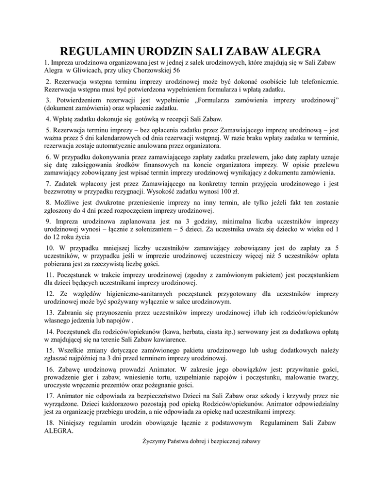 REGULAMIN URODZIN SALI ZABAW ALEGRA 1. Impreza urodzinowa organizowana jest w jednej z salek urodzinowych, które znajdują się w Sali Zabaw Alegra w Gliwicach, przy ulicy Chorzowskiej 56 2. Rezerwacja wstępna terminu imprezy urodzinowej może być dokonać osobiście lub telefonicznie. Rezerwacja wstępna musi być potwierdzona wypełnieniem formularza i wpłatą zadatku. 3. Potwierdzeniem rezerwacji jest wypełnienie „Formularza zamówienia imprezy urodzinowej” (dokument zamówienia) oraz wpłacenie zadatku. 4. Wpłatę zadatku dokonuje się gotówką w recepcji Sali Zabaw. 5. Rezerwacja terminu imprezy – bez opłacenia zadatku przez Zamawiającego imprezę urodzinową – jest ważna przez 5 dni kalendarzowych od dnia rezerwacji wstępnej. W razie braku wpłaty zadatku w terminie, rezerwacja zostaje automatycznie anulowana przez organizatora. 6. W przypadku dokonywania przez zamawiającego zapłaty zadatku przelewem, jako datę zapłaty uznaje się datę zaksięgowania środków finansowych na koncie organizatora imprezy. W opisie przelewu zamawiający zobowiązany jest wpisać termin imprezy urodzinowej wynikający z dokumentu zamówienia. 7. Zadatek wpłacony jest przez Zamawiającego na konkretny termin przyjęcia urodzinowego i jest bezzwrotny w przypadku rezygnacji. Wysokość zadatku wynosi 100 zł. 8. Możliwe jest dwukrotne przeniesienie imprezy na inny termin, ale tylko jeżeli fakt ten zostanie zgłoszony do 4 dni przed rozpoczęciem imprezy urodzinowej. 9. Impreza urodzinowa zaplanowana jest na 3 godziny, minimalna liczba uczestników imprezy urodzinowej wynosi – łącznie z solenizantem – 5 dzieci. Za uczestnika uważa się dziecko w wieku od 1 do 12 roku życia 10. W przypadku mniejszej liczby uczestników zamawiający zobowiązany jest do zapłaty za 5 uczestników, w przypadku jeśli w imprezie urodzinowej uczestniczy więcej niż 5 uczestników opłata pobierana jest za rzeczywistą liczbę gości. 11. Poczęstunek w trakcie imprezy urodzinowej (zgodny z zamówionym pakietem) jest poczęstunkiem dla dzieci będących uczestnikami imprezy urodzinowej. 12. Ze względów higieniczno-sanitarnych poczęstunek przygotowany dla uczestników imprezy urodzinowej może być spożywany wyłącznie w salce urodzinowym. 13. Zabrania się przynoszenia przez uczestników imprezy urodzinowej i/lub ich rodziców/opiekunów własnego jedzenia lub napojów . 14. Poczęstunek dla rodziców/opiekunów (kawa, herbata, ciasta itp.) serwowany jest za dodatkowa opłatą w znajdującej się na terenie Sali Zabaw kawiarence. 15. Wszelkie zmiany dotyczące zamówionego pakietu urodzinowego lub usług dodatkowych należy zgłaszać najpóźniej na 3 dni przed terminem imprezy urodzinowej. 16. Zabawę urodzinową prowadzi Animator. W zakresie jego obowiązków jest: przywitanie gości, prowadzenie gier i zabaw, wniesienie tortu, uzupełnianie napojów i poczęstunku, malowanie twarzy, uroczyste wręczenie prezentów oraz pożegnanie gości. 17. Animator nie odpowiada za bezpieczeństwo Dzieci na Sali Zabaw oraz szkody i krzywdy przez nie wyrządzone. Dzieci każdorazowo pozostają pod opieką Rodziców/opiekunów. Animator odpowiedzialny jest za organizację przebiegu urodzin, a nie odpowiada za opiekę nad uczestnikami imprezy. 18. Niniejszy regulamin urodzin obowiązuje łącznie z podstawowym ALEGRA. Regulaminem Sali Zabaw Życzymy Państwu dobrej i bezpiecznej zabawy Zespół Sali Zabaw ALEGRA