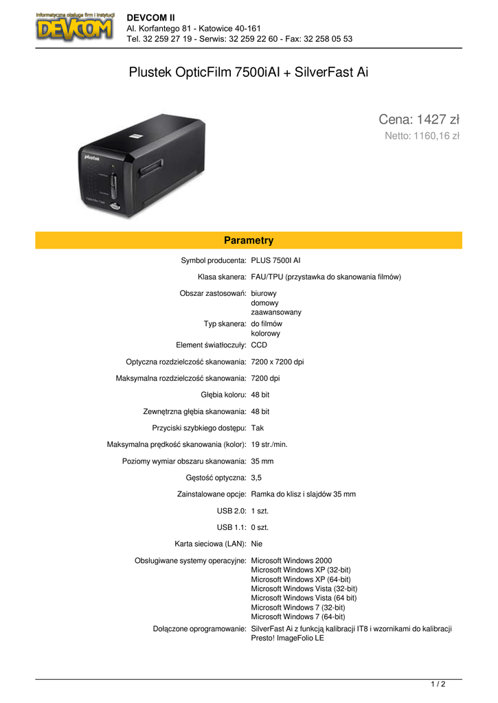 DEVCOM II Al. Korfantego 81 - Katowice 40-161 Tel. 32 259 27 19 - Serwis: 32 259 22 60 - Fax: 32 258 05 53 Plustek OpticFilm 7500iAI + SilverFast Ai Cena: 1427 zł Netto: 1160,16 zł Parametry Symbol producenta: PLUS 7500I AI Klasa skanera: FAU/TPU (przystawka do skanowania filmów) Obszar zastosowań: biurowy domowy zaawansowany Typ skanera: do filmów kolorowy Element światłoczuły: CCD Optyczna rozdzielczość skanowania: 7200 x 7200 dpi Maksymalna rozdzielczość skanowania: 7200 dpi Głębia koloru: 48 bit Zewnętrzna głębia skanowania: 48 bit Przyciski szybkiego dostępu: Tak Maksymalna prędkość skanowania (kolor): 19 str./min. Poziomy wymiar obszaru skanowania: 35 mm Gęstość optyczna: 3,5 Zainstalowane opcje: Ramka do klisz i slajdów 35 mm USB 2.0: 1 szt. USB 1.1: 0 szt. Karta sieciowa (LAN): Nie Obsługiwane systemy operacyjne: Microsoft Windows 2000 Microsoft Windows XP (32-bit) Microsoft Windows XP (64-bit) Microsoft Windows Vista (32-bit) Microsoft Windows Vista (64 bit) Microsoft Windows 7 (32-bit) Microsoft Windows 7 (64-bit) Dołączone oprogramowanie: SilverFast Ai z funkcją kalibracji IT8 i wzornikami do kalibracji Presto! ImageFolio LE 1/2 DEVCOM II Al. Korfantego 81 - Katowice 40-161 Tel. 32 259 27 19 - Serwis: 32 259 22 60 - Fax: 32 258 05 53 Presto!PageManager Zawartość zestawu: zasilacz sieciowy Ramka dla slajdów 35mm, pasków filmów 35mm Kabel USB torba karta do kalibracji sterowniki na CD Dodatkowe informacje: Profesjonalny skaner do filmów i slajdów Wzorzec 35 mm IT8 do kalibracji Funkcja wielokrotnego pobierania próbek Funkcja wielokrotnej ekspozycji Funkcja iSRD dodatkowo usuwa plamki od kurzu i zarysowania Oprogramowanie SilverFast 6.5 AI Studio (MultiExposure) iSRD Gwarancja DOOR TO DOOR Zasilanie: zasilacz sieciowy Szerokość: 272 mm Głębokość: 120 mm Wysokość: 119 mm Masa netto: 1,5 kg Dodatkowe informacje o gwarancji: 24 miesiące dla klientów indywidualnych Więcej informacji: www.plustek.pl [LINK] 2/2 Powered by TCPDF (www.tcpdf.org)