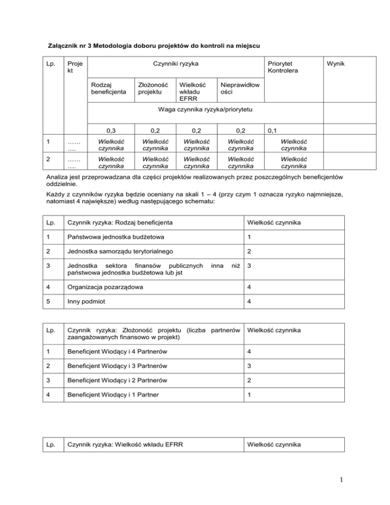 Załącznik nr 3 Metodologia doboru projektów do kontroli na miejscu Lp. Proje kt Czynniki ryzyka Rodzaj beneficjenta Złożoność projektu Wielkość wkładu EFRR Priorytet Kontrolera Wynik Nieprawidłow ości Waga czynnika ryzyka/priorytetu 0,3 0,2 0,2 0,2 0,1 1 …… …. Wielkość czynnika Wielkość czynnika Wielkość czynnika Wielkość czynnika Wielkość czynnika 2 …… …. Wielkość czynnika Wielkość czynnika Wielkość czynnika Wielkość czynnika Wielkość czynnika Analiza jest przeprowadzana dla części projektów realizowanych przez poszczególnych beneficjentów oddzielnie. Każdy z czynników ryzyka będzie oceniany na skali 1 – 4 (przy czym 1 oznacza ryzyko najmniejsze, natomiast 4 największe) według następującego schematu: Lp. Czynnik ryzyka: Rodzaj beneficjenta Wielkość czynnika 1 Państwowa jednostka budżetowa 1 2 Jednostka samorządu terytorialnego 2 3 Jednostka sektora finansów publicznych państwowa jednostka budżetowa lub jst 4 Organizacja pozarządowa 4 5 Inny podmiot 4 Lp. Czynnik ryzyka: Złożoność projektu (liczba partnerów zaangażowanych finansowo w projekt) Wielkość czynnika 1 Beneficjent Wiodący i 4 Partnerów 4 2 Beneficjent Wiodący i 3 Partnerów 3 3 Beneficjent Wiodący i 2 Partnerów 2 4 Beneficjent Wiodący i 1 Partner 1 Lp. Czynnik ryzyka: Wielkość wkładu EFRR Wielkość czynnika inna niż 3 1 1 Do 50 tys. EUR 1 2 Powyżej 50 tys. – 150 tys. EUR 2 3 Powyżej 150 tys. – 250 tys. EUR 3 4 Powyżej 250 tys. EUR 4 Lp. Czynnik ryzyka: Nieprawidłowości Wielkość czynnika 1 W Projekcie nie wystąpiły nieprawidłowości lub 1 Kontroler nie ma informacji o popełnieniu przez beneficjenta nieprawidłowości w jakimkolwiek innym projekcie 2 W Projekcie wystąpiły nieprawidłowości niepodlegające raportowaniu do Komisji Europejskiej lub 2 Kontroler ma informacje o popełnieniu przez beneficjenta nieprawidłowości niepodlegających raportowaniu do Komisji Europejskiej w jakimkolwiek innym projekcie 3 W Projekcie wystąpiły nieprawidłowości raportowaniu do Komisji Europejskiej lub podlegające 3 Kontroler ma informacje o popełnieniu przez beneficjenta nieprawidłowości podlegających raportowaniu do Komisji Europejskiej w jakimkolwiek innym projekcie 4 W Projekcie wystąpiły nieprawidłowości podlegające raportowaniu oraz nieprawidłowości niepodlegające raportowaniu do Komisji Europejskiej lub 4 Kontroler ma informacje o popełnieniu przez beneficjenta nieprawidłowości podlegających raportowaniu oraz nieprawidłowości niepodlegających raportowaniu do Komisji Europejskiej w jakimkolwiek innym projekcie 2