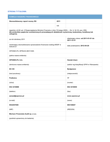 STRONA TYTUŁOWA KOMISJA NADZORU FINANSOWEGO Skonsolidowany raport roczny RS 2011 rok (zgodnie z § 82 ust. 2 Rozporządzenia Ministra Finansów z dnia 19 lutego 2009 r. - Dz. U. Nr 33, poz. 259) dla emitentów papierów wartościowych prowadzących działalność wytwórczą, budowlaną, handlową lub usługową za rok obrotowy 2011 obejmujący okres: od 2011-01-01 do 2011-12-31 zawierający skonsolidowane sprawozdanie finansowe według MSSF w walucie zł data przekazania: 2012-04-26 OPONEO.PL SPÓŁKA AKCYJNA (pełna nazwa emitenta) OPONEO.PL S.A. Handel (han) (skrócona nazwa emitenta) (sektor wg klasyfikacji GPW w Warszawie) 85-145 Bydgoszcz (kod pocztowy) (miejscowość) Podleśna 17 (ulica) (numer) 052 3418888 052 3418850 (telefon) (fax) [email protected] www.oponeo.pl (e-mail) (www) 9532457650 093149847 (NIP) (REGON) Morison Finansista Audit sp. z o.o. (podmiot uprawniony do badania) WYBRANE DANE FINANSOWE w tys. zł w tys. EUR WYBRANE DANE FINANSOWE 2011 I. Przychody netto ze sprzedaży produktów, towarów i materiałów 2010 2011 2010 170 964 144 142 43 197 36 084 32 023 27 668 7 773 6 926 6 152 9 424 1 493 2 359 IV. Zysk (strata) brutto 10 043 9 544 2 438 2 389 V. Zysk (strata) netto 7 453 7 440 1 809 1 862 VI. Przepływy pieniężne netto z działalności operacyjnej 12 318 13 325 2 990 3 337 VII. Przepływy pieniężne netto z działalności inwestycyjnej -2 389 -17 494 -580 -4 377 VIII. Przepływy pieniężne netto z działalności finansowej -5 324 -488 -1 292 -121 4 605 -4 635 1 118 -1 161 108 366 85 665 24 535 21 631 29 872 27 224 6 763 6 874 XII. Zobowiązania długoterminowe 3 716 150 881 38 XIII. Zobowiązania krótkoterminowe 26 156 27 074 5 922 6 836 XIV. Kapitał własny 78 494 58 441 17 772 14 757 XV. Kapitał zakładowy 13 936 12 676 3 155 3 201 13 936 000 12 676 000 13 936 000 12 676 000 XVII. Zysk (strata) na jedną akcję zwykłą (w zł/ EUR) 0,57 0,59 0,14 0,15 XVIII. Rozwodniony zysk (strata) na jedną akcję zwykłą (w zł/EUR) 0,57 0,59 0,14 0,15 XIX. Wartość księgowa na jedną akcję (w zł/EUR) 5,63 4,61 1,27 1,16 XX. Rozwodniona wartość księgowa na jedną akcję (w zł/EUR) 5,63 4,61 1,27 1,16 0 0 0 0 II. Zysk (strata) ze sprzedaży III. Zysk (strata) z działalności operacyjnej IX. Przepływy pieniężne netto, razem X. Aktywa, razem XI. Zobowiązania i rezerwy na zobowiązania XVI. Liczba akcji (w szt.) XXI. Zadeklarowana lub wypłacona dywidenda na jedną akcję (w zł/EUR) 1. Poszczególne pozycje aktywów i pasywów prezentowane są według średniego kursu NBP obowiązującego na dzień bilansowy tj. na 30.12.2011 - 4,4168 Tabela nr 252/A/NBP/2011 oraz dla danych porównywalnych według średniego kursu NBP obowiązującego na dzień bilansowy tj. 31.12.2010 3,9603 Tabela nr 255/A/NBP/2010 2. Wykazane pozycje rachunku zysków i strat oraz przepływów pieniężnych prezentowane są według kursu stanowiącego średnia arytmetyczną kursów ustalanych przez NBP, obowiązujących na ostatni dzień każdego zakończonego miesiąca tj. za okres od 01.01.2011 do 31.12.2011 - 4,1198 oraz dla danych porównywalnych według kursu stanowiącego średnią arytmetyczną kursów ustalanych przez NBP obowiązujących na na ostatni dzień każdego zakończonego miesiąca tj. za okres od 01.01.2010 do 31.12.2010 - 3,9946 Raport powinien zostać przekazany do Komisji Nadzoru Finansowego, Giełdy Papierów Wartościowych w Warszawie S.A. albo MTS-CeTO S.A. oraz agencji informacyjnej zgodnie z przepisami prawa. PODPISY WSZYSTKICH CZŁONKÓW ZARZĄDU Data Imię i Nazwisko Stanowisko/Funkcja 2012-04-26 Dariusz Topolewski Prezes Zarządu 2012-04-26 Michał Butkiewicz Członek Zarządu 2012-04-26 Maciej Karpusiewicz Członek Zarządu 2012-04-26 Andrzej Reysowski Członek Zarządu Podpis PODPIS OSOBY, KTÓREJ POWIERZONO PROWADZENIE KSIĄG RACHUNKOWYCH Data Imię i Nazwisko Stanowisko/Funkcja 2012-04-26 Małgorzata Nowicka Główny Księgowy Identyfikator raportu yk911fg691 Nazwa raportu RS Symbol raportu RS Nazwa emitenta OPONEO.PL SPÓŁKA AKCYJNA Symbol Emitenta OPONEO.PL S.A. Tytuł Sektor Handel (han) Kod 85-145 Miasto Bydgoszcz Ulica Podleśna Podpis Nr 17 Tel. 052 3418888 Fax 052 3418850 e-mail [email protected] NIP 9532457650 REGON 093149847 Data sporządzenia 2012-04-26 Rok bieżący Numer adres www www.oponeo.pl