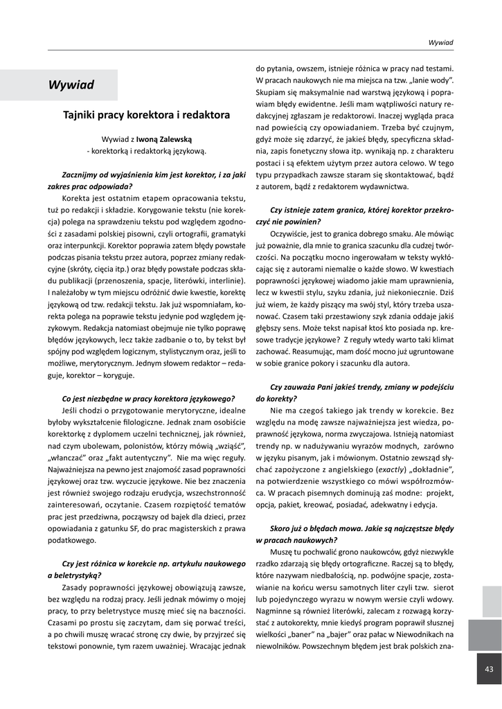 Wywiad Wywiad Tajniki pracy korektora i redaktora Wywiad z Iwoną Zalewską - korektorką i redaktorką językową. Zacznijmy od wyjaśnienia kim jest korektor, i za jaki zakres prac odpowiada? Korekta jest ostatnim etapem opracowania tekstu, tuż po redakcji i składzie. Korygowanie tekstu (nie korekcja) polega na sprawdzeniu tekstu pod względem zgodności z zasadami polskiej pisowni, czyli ortografii, gramatyki oraz interpunkcji. Korektor poprawia zatem błędy powstałe podczas pisania tekstu przez autora, poprzez zmiany redakcyjne (skróty, cięcia itp.) oraz błędy powstałe podczas składu publikacji (przenoszenia, spacje, literówki, interlinie). I należałoby w tym miejscu odróżnić dwie kwestie, korektę językową od tzw. redakcji tekstu. Jak już wspomniałam, korekta polega na poprawie tekstu jedynie pod względem językowym. Redakcja natomiast obejmuje nie tylko poprawę błędów językowych, lecz także zadbanie o to, by tekst był spójny pod względem logicznym, stylistycznym oraz, jeśli to możliwe, merytorycznym. Jednym słowem redaktor – redaguje, korektor – koryguje. Co jest niezbędne w pracy korektora językowego? Jeśli chodzi o przygotowanie merytoryczne, idealne byłoby wykształcenie filologiczne. Jednak znam osobiście korektorkę z dyplomem uczelni technicznej, jak również, nad czym ubolewam, polonistów, którzy mówią „wziąść”, „włanczać” oraz „fakt autentyczny”. Nie ma więc reguły. Najważniejsza na pewno jest znajomość zasad poprawności językowej oraz tzw. wyczucie językowe. Nie bez znaczenia jest również swojego rodzaju erudycja, wszechstronność zainteresowań, oczytanie. Czasem rozpiętość tematów prac jest przedziwna, począwszy od bajek dla dzieci, przez opowiadania z gatunku SF, do prac magisterskich z prawa podatkowego. Czy jest różnica w korekcie np. artykułu naukowego a beletrystyką? Zasady poprawności językowej obowiązują zawsze, bez względu na rodzaj pracy. Jeśli jednak mówimy o mojej pracy, to przy beletrystyce muszę mieć się na baczności. Czasami po prostu się zaczytam, dam się porwać treści, a po chwili muszę wracać stronę czy dwie, by przyjrzeć się tekstowi ponownie, tym razem uważniej. Wracając jednak do pytania, owszem, istnieje różnica w pracy nad testami. W pracach naukowych nie ma miejsca na tzw. „lanie wody”. Skupiam się maksymalnie nad warstwą językową i poprawiam błędy ewidentne. Jeśli mam wątpliwości natury redakcyjnej zgłaszam je redaktorowi. Inaczej wygląda praca nad powieścią czy opowiadaniem. Trzeba być czujnym, gdyż może się zdarzyć, że jakieś błędy, specyficzna składnia, zapis fonetyczny słowa itp. wynikają np. z charakteru postaci i są efektem użytym przez autora celowo. W tego typu przypadkach zawsze staram się skontaktować, bądź z autorem, bądź z redaktorem wydawnictwa. Czy istnieje zatem granica, której korektor przekroczyć nie powinien? Oczywiście, jest to granica dobrego smaku. Ale mówiąc już poważnie, dla mnie to granica szacunku dla cudzej twórczości. Na początku mocno ingerowałam w teksty wykłócając się z autorami niemalże o każde słowo. W kwestiach poprawności językowej wiadomo jakie mam uprawnienia, lecz w kwestii stylu, szyku zdania, już niekoniecznie. Dziś już wiem, że każdy piszący ma swój styl, który trzeba uszanować. Czasem taki przestawiony szyk zdania oddaje jakiś głębszy sens. Może tekst napisał ktoś kto posiada np. kresowe tradycje językowe? Z reguły wtedy warto taki klimat zachować. Reasumując, mam dość mocno już ugruntowane w sobie granice pokory i szacunku dla autora. Czy zauważa Pani jakieś trendy, zmiany w podejściu do korekty? Nie ma czegoś takiego jak trendy w korekcie. Bez względu na modę zawsze najważniejsza jest wiedza, poprawność językowa, norma zwyczajowa. Istnieją natomiast trendy np. w nadużywaniu wyrazów modnych, zarówno w języku pisanym, jak i mówionym. Ostatnio zewsząd słychać zapożyczone z angielskiego (exactly) „dokładnie”, na potwierdzenie wszystkiego co mówi współrozmówca. W pracach pisemnych dominują zaś modne: projekt, opcja, pakiet, kreować, posiadać, adekwatny i edycja. Skoro już o błędach mowa. Jakie są najczęstsze błędy w pracach naukowych? Muszę tu pochwalić grono naukowców, gdyż niezwykle rzadko zdarzają się błędy ortograficzne. Raczej są to błędy, które nazywam niedbałością, np. podwójne spacje, zostawianie na końcu wersu samotnych liter czyli tzw. sierot lub pojedynczego wyrazu w nowym wersie czyli wdowy. Nagminne są również literówki, zalecam z rozwagą korzystać z autokorekty, mnie kiedyś program poprawił słusznej wielkości „baner” na „bajer” oraz pałac w Niewodnikach na niewolników. Powszechnym błędem jest brak polskich zna43 Rynek - Społeczeństwo - Kultura | nr 4/2012 ków w wyrazach że (ze) i więc (wiec). Jest jeszcze pewien zwyczaj, nie jest to błąd, maniera raczej. A mianowicie stosowanie w pracach naukowych podkreśleń, wytłuszczeń, pisanie DUŻYMI literami. Artykuł, praca naukowa to jednak nie poradnik, czy podręcznik szkolny, gdzie ważne problemy wyróżnia się graficznie, żeby lepiej się czytało i uczyło. Czytelnicy prac na pewno zorientują się, które informacje w tekście są szczególnie ważne. Stosowanie podkreśleń, wytłuszczeń itd. sprawia wrażenie, że autor nie docenia swoich czytelników. Kolejnym przykładem są sławne już w naukowych pismach tasiemce, czyli zbyt długie zdania. A tuż po nich zbyt skomplikowana forma tych zdań. Po pierwsze krótkie zdania lepiej się czyta i łatwiej zapamiętuje treść. Po drugie poziom komplikacji zdania nie świadczy bynajmniej o inteligencji autora, tylko o jego indolencji komunikacyjnej. Dlatego doradzam autorom, aby zdać się na własną intuicję. Nie udziwniać i nie „unaukowiać” swojego wywodu na siłę. Treść obroni się sama, nie trzeba jej nadawać z