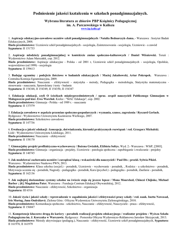 Podniesienie jakości kształcenia w szkołach ponadgimnazjalnych. Wybrana literatura ze zbiorów PBP Książnicy Pedagogicznej im. A. Parczewskiego w Kaliszu www.kp.kalisz.pl 1. Aspiracje edukacyjno-zawodowe uczniów szkół ponadgimnazjalnych / Natalia Bednarczyk-Jama..- Warszawa : Instytut Badań Edukacyjnych, 2008. Hasła przedmiotowe: Uczniowie szkół ponadgimnazjalnych - socjologia, Zainteresowania - socjologia, Uczniowie - a zawód Sygnatura: II 151733 2. Aspiracje młodzieży ponadgimnazjalnej w kontekście zmian społeczno-kulturowych / Daniel Wiśniewski. Toruń : Wydawnictwo Adam Marszałek, cop. 2012. Hasła przedmiotowe: Aspiracje edukacyjne - Polska - od 2001 r, Uczniowie szkół ponadgimnazjalnych - socjologia, Opolskie, województwo (od 1999) - socjologia Sygnatura: II 159613 3. Badając egzaminy : podejście ilościowe w badanich edukacyjnych / Maciej Jakubowski, Artur Pokropek. Warszawa : Centralna Komisja Egzaminacyjna, 2009. Hasła przedmiotowe: Nauczanie - efektywność - statystyka - metody, Pedagogika - metodologia, Statystyka matematyczna stosowanie - nauczanie, Sprawdziany i testy - badanie Sygnatura: II 154348, II 154349, II 154350, II 154347 4. Edukacja edukacji, czyli O ścieżkach międzyprzedmiotowych / oprac. zespół nauczycieli Publicznego Gimnazjum w Małogoszczu pod kier. Ewa Warchoł. Kielce : "MAC Edukacja", cop. 2002. Hasła przedmiotowe: Gimnazja - Polska - od 1989 r. - nauczanie Sygnatura: II 137579 5. Edukacja zawodowa w aspekcie przemian społeczno-gospodarczych : wyznania, szanse, zagrożenia / Ryszard Gerlach. Bydgoszcz : Wydawnictwo Uniwersytetu Kazimierza Wielkiego, 2007. Hasła przedmiotowe: Szkolnictwo zawodowe Sygnatura: II 147736 6. Ewaluacja a jakość edukacji : koncepcje, doświadczenia, kierunki praktycznych rozwiązań / red. Grzegorz Michalski. Łódź : Wydawnictwo Uniwersytetu Łódzkiego, 2011. Hasła przedmiotowe: Nauczanie - efektywność Sygnatura: II 158170 7. Gimnazjalny projekt profilaktyczno-wychowawczy / Bożena Gwizdek, Elżbieta Sołtys. Wyd. 2.- Warszawa : WSiP, [2003]. Hasła przedmiotowe: Gimnazja - organizacja - projekty, Uczniowie - patologia społeczna - zapobieganie i zwalczanie - projekty Sygnatura: II 140745 8. Jak modelować zachowania uczniów i zarządzać klasą : wskazówki dla nauczycieli / Paul Dix ; przekł. Sylwia Pikiel. Warszawa : Wydawnictwo Naukowe PWN, 2013. Hasła przedmiotowe: Klasa szkolna (socjol.) - poradnik, Uczniowie - wychowanie - poradnik, , Rodzice - a szkolnictwo - poradnik, Motywacja uczenia się - poradnik, Nagrody - pedagogika - poradnik, Kara (psychol.) - pedagogika - poradnik, Zaufanie - poradnik, Sygnatura: II 162136 9. Jak najlepiej doskonalone systemy szkolne na świecie staja się jeszcze lepsze / Mona Mourshed, Chinezi Chijioke, Michael Barber ; [tł.] Magdalena Pater. Warszawa : Fundacja Centrum Edukacji Obywatelskiej, 2012. Hasła przedmiotowe: Nauczanie - efektywność, Szkolnictwo - organizacja Sygnatura: III 6516 10. Jakość życia i jakość szkoły : wprowadzenie w zagadnienia jakości i efektywności pracy szkoły / red. nauk. Inetta Nowosad, Iris Mortag, Jana Ondráková. Zielona Góra : Oficyna Wydawnicza Uniwersytetu Zielonogórskiego, 2010. Hasła przedmiotowe: Komunikacja społeczna - szkolnictwo, Nauczanie - efektywność, Nauczyciele - praca - efektywność, Sygnatura: II 156847 11. Kompetencje kluczowe drogą do kariery : poradnik realizacji projektu edukacyjnego / realizator projektu : Wyższa Szkoła Pedagogiczna im. J. Korczaka w Warszawie. Bydgoszcz : Pomorska Oficyna Wydawniczo-Reklamowa Jarosław Skrzypczak, 2013. Hasła przedmiotowe: Metody aktywizujące (pedagog.), Nauczanie - efektywność, Uczniowie szkół ponadgimnazjalnych, Sygnatura: II 161978, II 161979 12. Kompetencje kluczowe drogą twórczego rozwoju : wrzesień 2008 - sierpień 2012 / [red. Agnieszka Roguska]. Siedlce : Uniwersytet Przyrodniczo-Humanistyczny, 2012. Hasła przedmiotowe: Metody aktywizujące (pedagog.), Nauczanie - efektywność Sygnatura: II 159090, II 159091 13. Komunikacja werbalna nauczyciela i ucznia na lekcji / Małgorzata Mądry-Kupiec. Kraków : "Impuls", 2011. Hasła przedmiotowe: Komunikacja werbalna - szkolnictwo, Nauczyciele - a uczniowie - Polska - od 2001 r, Sygnatura: II 158173, II 162461 14. Kształcenie zawodowe - wyzwania, priorytety, standardy / Stefan M. Kwiatkowski. Wyd. 2 uzup. Warszawa : Instytut Badań Edukacyjnych, 2008. Hasła przedmiotowe: Szkolnictwo zawodowe Sygnatura: II 152740 15. Metoda projektu w gimnazjum : poradnik dyrektora i nauczyciela / Kamilla Przychodzień. Warszawa : Grupa Wydawnicza Adamantan, 2011. Hasła przedmiotowe: Nauczanie - metoda projektów - poradnik, Metoda projektów - nauczanie, Gimnazja - nauczanie Sygnatura: II 160298 16. Mobbing w szkole : jak zapobiegać przemocy grupowej / Karl E. Dambach ; przekł. Aleksandra Ubertowska. Gdańsk : Gdańskie Wydawnictwo Psychologiczne, 2003. Hasła przedmiotowe: Uczniowie - psychologia, Przemoc w szkole - zapobieganie i zwalczanie Sygnatura: II 151859, II 142870 17. Nauczyciel w warunkach zmiany społecznej i edukacyjnej / Jolanta Szempruch. Wyd. 2 uzup. Kraków : "Impuls", 2012. Hasła przedmiotowe: Nauczyciele - praca - efektywność - Polska - od 1989 r, Nauczyciele - przydatność zawodowa - Polska - od 1989 r, Oświata - reforma - Polska - od 1989 r, Zmiana społeczna - Polska - od 1989 r Sygnatura: II 158835 18. Nowy model kształcenia zawodowego poprzez licea profilowane : poradnik dyrektorów i nauczycieli liceów profilowanych oraz pracowników organów je prowadzących i nadzorujących / pod red. Janusz Moos. Poznań : "eMPi2", 2002. Hasła przedmiotowe: Szkolnictwo średnie - nauczanie, Szkolnictwo zawodowe - nauczanie Sygnatura: II 138467 19. Ocenianie kształtujące: doskonalenie kształcenia w szkole średniej/ tł. A.Grabowska, Ł.Pietraczuk ; oprac. red. J.Gospodarczyk. Warszawa : Centralny Ośrodek Doskonalenia Nauczycieli : Organizacja Współpracy Gospodarczej i R