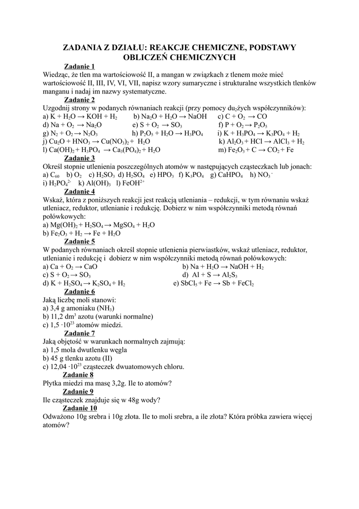 ZADANIA Z DZIAŁU: REAKCJE CHEMICZNE, PODSTAWY OBLICZEŃ CHEMICZNYCH Zadanie 1 Wiedząc, że tlen ma wartościowość II, a mangan w związkach z tlenem może mieć wartościowość II, III, IV, VI, VII, napisz wzory sumaryczne i strukturalne wszystkich tlenków manganu i nadaj im nazwy systematyczne. Zadanie 2 Uzgodnij strony w podanych równaniach reakcji (przy pomocy du2żych współczynników): a) K + H2O → KOH + H2 b) Na2O + H2O → NaOH c) C + O2 → CO d) Na + O2 → Na2O e) S + O2 → SO3 f) P + O2 → P2O5 g) N2 + O2 → N2O3 h) P2O5 + H2O → H3PO4 i) K + H3PO4 → K3PO4 + H2 j) Cu2O + HNO3 → Cu(NO3)2 + H2O k) Al2O3 + HCl → AlCl3 + H2 l) Ca(OH)2 + H3PO4 → Ca3(PO4)2 + H2O m) Fe2O3 + C → CO2 + Fe Zadanie 3 Określ stopnie utlenienia poszczególnych atomów w następujących cząsteczkach lub jonach: a) C60 b) O2 c) H2SO3 d) H2SO4 e) HPO3 f) K3PO4 g) CaHPO4 h) NO3 i) H2PO42- k) Al(OH)3 l) FeOH2+ Zadanie 4 Wskaż, która z poniższych reakcji jest reakcją utleniania – redukcji, w tym równaniu wskaż utleniacz, reduktor, utlenianie i redukcję. Dobierz w nim współczynniki metodą równań połówkowych: a) Mg(OH)2 + H2SO4 → MgSO4 + H2O b) Fe2O3 + H2 → Fe + H2O Zadanie 5 W podanych równaniach określ stopnie utlenienia pierwiastków, wskaż utleniacz, reduktor, utlenianie i redukcję i dobierz w nim współczynniki metodą równań połówkowych: a) Ca + O2 → CaO b) Na + H2O → NaOH + H2 c) S + O2 → SO3 d) Al + S → Al2S3 d) K + H2SO4 → K2SO4 + H2 e) SbCl5 + Fe → Sb + FeCl2 Zadanie 6 Jaką liczbę moli stanowi: a) 3,4 g amoniaku (NH3) b) 11,2 dm3 azotu (warunki normalne) c) 1,5 ·1023 atomów miedzi. Zadanie 7 Jaką objętość w warunkach normalnych zajmują: a) 1,5 mola dwutlenku węgla b) 45 g tlenku azotu (II) c) 12,04 ·1023 cząsteczek dwuatomowych chloru. Zadanie 8 Płytka miedzi ma masę 3,2g. Ile to atomów? Zadanie 9 Ile cząsteczek znajduje się w 48g wody? Zadanie 10 Odważono 10g srebra i 10g złota. Ile to moli srebra, a ile złota? Która próbka zawiera więcej atomów?