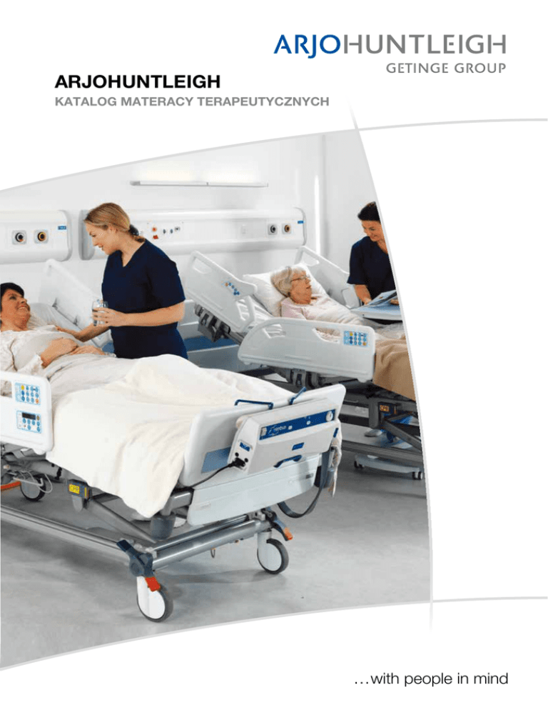 Arjohuntleigh KATALOG MATERACY TERAPEUTYCZNYCH … with people in mind efektywne MATERACE terapeutyczne to lepsze rezultaty W OPIECE NAD PACJENTAMI Od ponad 60 lat ArjoHuntleigh tworzy doskonałe rozwiązania służące opiece nad pacjentami o ograniczonej sprawności ruchowej oraz stanach z nią związanych. Powierzchnie terapeutyczne z naszej szerokiej oferty wspomagają leczenie, zwiększając bezpieczeństwo i komfort pacjentów oraz zmniejszając niepotrzebne koszty. Zintegrowane i niezintegrowane powierzchnie terapeutyczne ArjoHuntleigh obejmują szeroki asortyment reaktywnego i aktywnego rozkładania sił nacisku, którego celem jest prewencja powstawania ran odleżynowych oraz pomoc w ich leczeniu. Nasze rozwiązania zwiększają standard opieki nad pacjentami na całym świecie. Niezależnie od stopnia zróżnicowania potrzeb pacjentów, ArjoHuntleigh dostarcza optymalne rozwiązania. Cechy materacy ZASILANE ELEKTRYCZNIE Nimbus Zaawansowany materiał pokrowca: Pomaga utrzymać integralność skóry, zapewniając niski współczynnik tarcia, tworząc jednocześnie efektywną barierę dla płynów i bakterii. Podstawowa redystrybucja sił nacisku: Zapewnia rozłożenie sił nacisku dzięki piance o różnej gęstości i składzie. Zaawansowana redystrybucja sił nacisku: Zapewnia lepsze rozłożenie sił nacisku w przypadku pacjentów przewlekle chorych (dzięki zastosowaniu powietrza lub żelu). Odciążenie stóp: Zmniejsza nacisk w obrębie pięt dzięki pochyleniu komór w sekcji pięt lub obniżeniu ciśnienia powietrza w odpowiednich komorach. Obracanie: Ciągłe obracanie pacjenta na boki w celu odciążenia i zmniejszenia sił nacisku między powierzchniami, obracanie i pozostawienie pacjenta w pozycji bocznej w celu ułatwienia czynności higenicznych. Zmienne ciśnienie: Zapewnia redystrybucję sił nacisku poprzez cykliczne zmiany ciśnienia w komorach z możliwością regualcji parametrów takich jak częstotliwość, czas trwania i amplituda. Pulsowanie: Zapewnia rozłożenie sił nacisku poprzez naśladowanie naturalnych ruchów ciała ludzkiego poprawiających przepływ krwi. MicroClimate Management (zarządzanie mikroklimatem): Zapewnia przepływ powietrza pomagając w utrzymaniu odpowiedniej ciepłoty i wilgotności skóry. Technologia komór strefowych: Konfiguracja komór zapewniająca komfort oraz optymalne rozłożenie nacisku, w zależności od powierzchni kontaktu z pacjentem i/lub terapii. Różne tryby pracy: Możliwość wyboru pomiędzy stałym niskim ciśnieniem, trybem statycznym lub trybem Auto Firm, tworzącym tymczasową sztywną powierzchnię umożliwiającą wykonanie zabiegów pielęgnacyjnych. Automatyczna regulacja nacisku: Technologia Self-Set i Auto-Profiling automatycznie reguluje ciśnienie w komorach w odpowiedzi na pozycję ciała pacjenta. Technologia Wound Valve: Opróżnianie z powietrza wybranych komór pod pacjentem w celu pełnego i stałego odciążenia szczególnie wrażliwych obszarów ciała. First Step All In One Therakair Visio AutoLogic Alpha Response FAKT: Według NPUAP u 15% wszystkich pacjentów na oddziałach intensywnej terapii pojawią się rany odleżynowe Źródło: Amlung S, et al. The 1999 National Pressure Ulcer Prevalence Survey: A Benchmarking Approach. Advances in Skin & Wound Care. 2001; 14(6): 297-301. Dzięki odpowiedniej powierzchni terapeutycznej można temu zapobiec NIEZASILANE Alpha Active Alpha Trancell Deluxe First Step Select Skin IQ RIK Evolve AtmosAir Simulflex ConformX Pentaflex W urządzeniach i produktach dostarczanych przez ArjoHuntleigh można używać wyłącznie części zaprojektowanych przez ArjoHuntleigh, zgodnie z ich przeznaczeniem. Stosujemy zasadę ciągłego doskonalenia, dlatego zastrzegamy sobie prawo do modyfikacji projektów i danych technicznych produktu bez uprzedzenia. www.ArjoHuntleigh.com ArjoHuntleigh AB Hans Michelsensgatan 10 211 20 Malmö Sweden Tel: +46 10-494 7760 Email: [email protected] ® i ™ są znakami towarowymi należącymi do grupy firm ArjoHuntleigh. © ArjoHuntleigh, 2011. ArjoHuntleigh Polska Sp. z o.o. ul. Osmańska 14 02-823 Warszawa Polska Tel. + 48 61 664 54 11 Fax + 48 61 662 15 90 E-mail: [email protected] 01.TS.66.1.PL.1.AHG • JULY 2015 GRUPA GETINGE jest wiodącym światowym dostawcą produktów i systemów poprawiających jakość i efektywność kosztową w służbie zdrowia i w branży life sciences. Prowadzimy działalność pod trzema markami: ArjoHuntleigh, GETINGE i MAQUET. ArjoHuntleigh oferuje rozwiązania w zakresie opieki nad osobami o ograniczonej sprawności ruchowej i stanach z tym związanych oraz leczenia ran. GETINGE dostarcza rozwiązania służące do kontroli zakażeń w ochronie zdrowia oraz do zapobiegania zanieczyszczeniom w branży life sciences. MAQUET specjalizuje się w rozwiązaniach, terapiach i produktach dla chirurgii i intensywnej opieki.