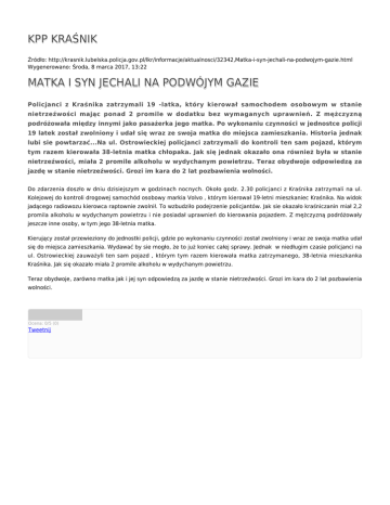 KPP KRAŚNIK Źródło: http://krasnik.lubelska.policja.gov.pl/lkr/informacje/aktualnosci/32342,Matka-i-syn-jechali-na-podwojym-gazie.html Wygenerowano: Środa, 8 marca 2017, 13:22 MATKA I SYN JECHALI NA PODWÓJYM GAZIE Policjanci z Kraśnika zatrzymali 19 -latka, który kierował samochodem osobowym w stanie nietrzeźwości mając ponad 2 promile w dodatku bez wymaganych uprawnień. Z mężczyzną podróżowała między innymi jako pasażerka jego matka. Po wykonaniu czynności w jednostce policji 19 latek został zwolniony i udał się wraz ze swoja matka do miejsca zamieszkania. Historia jednak lubi sie powtarzać...Na ul. Ostrowieckiej policjanci zatrzymali do kontroli ten sam pojazd, którym tym razem kierowała 38-letnia matka chłopaka. Jak się jednak okazało ona również była w stanie nietrzeźwości, miała 2 promile alkoholu w wydychanym powietrzu. Teraz obydwoje odpowiedzą za jazdę w stanie nietrzeźwości. Grozi im kara do 2 lat pozbawienia wolności. Do zdarzenia doszło w dniu dzisiejszym w godzinach nocnych. Około godz. 2.30 policjanci z Kraśnika zatrzymali na ul. Kolejowej do kontroli drogowej samochód osobowy markia Volvo , którym kierował 19-letni mieszkaniec Kraśnika. Na widok jadącego radiowozu kierowca raptownie zwolnił. To wzbudziło podejrzenie policjantów. Jak sie okazało kraśniczanin miał 2,2 promila alkoholu w wydychanym powietrzu i nie posiadał uprawnień do kierowania pojazdem. Z mężczyzną podróżowały jeszcze inne osoby, w tym jego 38-letnia matka. Kierujący został przewieziony do jednostki policji, gdzie po wykonaniu czynności został zwolniony i wraz ze swoja matka udał się do miejsca zamieszkania. Wydawać by sie mogło, że to już koniec całej sprawy. Jednak w niedługim czasie policjanci na ul. Ostrowieckiej zauważyli ten sam pojazd , którym tym razem kierowała matka zatrzymanego, 38-letnia mieszkanka Kraśnika. Jak się okazało miała 2 promile alkoholu w wydychanym powietrzu. Teraz obydwoje, zarówno matka jak i jej syn odpowiedzą za jazdę w stanie nietrzeźwości. Grozi im kara do 2 lat pozbawienia wolności. Ocena: 0/5 (0) Tweetnij
