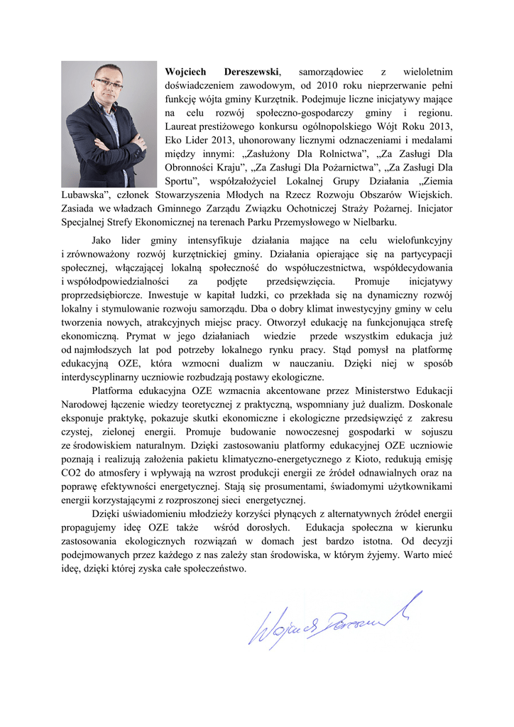 Wojciech Dereszewski, samorządowiec z wieloletnim doświadczeniem zawodowym, od 2010 roku nieprzerwanie pełni funkcję wójta gminy Kurzętnik. Podejmuje liczne inicjatywy mające na celu rozwój społeczno-gospodarczy gminy i regionu. Laureat prestiżowego konkursu ogólnopolskiego Wójt Roku 2013, Eko Lider 2013, uhonorowany licznymi odznaczeniami i medalami między innymi: „Zasłużony Dla Rolnictwa”, „Za Zasługi Dla Obronności Kraju”, „Za Zasługi Dla Pożarnictwa”, „Za Zasługi Dla Sportu”, współzałożyciel Lokalnej Grupy Działania „Ziemia Lubawska”, członek Stowarzyszenia Młodych na Rzecz Rozwoju Obszarów Wiejskich. Zasiada we władzach Gminnego Zarządu Związku Ochotniczej Straży Pożarnej. Inicjator Specjalnej Strefy Ekonomicznej na terenach Parku Przemysłowego w Nielbarku. Jako lider gminy intensyfikuje działania mające na celu wielofunkcyjny i zrównoważony rozwój kurzętnickiej gminy. Działania opierające się na partycypacji społecznej, włączającej lokalną społeczność do współuczestnictwa, współdecydowania i współodpowiedzialności za podjęte przedsięwzięcia. Promuje inicjatywy proprzedsiębiorcze. Inwestuje w kapitał ludzki, co przekłada się na dynamiczny rozwój lokalny i stymulowanie rozwoju samorządu. Dba o dobry klimat inwestycyjny gminy w celu tworzenia nowych, atrakcyjnych miejsc pracy. Otworzył edukację na funkcjonująca strefę ekonomiczną. Prymat w jego działaniach wiedzie przede wszystkim edukacja już od najmłodszych lat pod potrzeby lokalnego rynku pracy. Stąd pomysł na platformę edukacyjną OZE, która wzmocni dualizm w nauczaniu. Dzięki niej w sposób interdyscyplinarny uczniowie rozbudzają postawy ekologiczne. Platforma edukacyjna OZE wzmacnia akcentowane przez Ministerstwo Edukacji Narodowej łączenie wiedzy teoretycznej z praktyczną, wspomniany już dualizm. Doskonale eksponuje praktykę, pokazuje skutki ekonomiczne i ekologiczne przedsięwzięć z zakresu czystej, zielonej energii. Promuje budowanie nowoczesnej gospodarki w sojuszu ze środowiskiem naturalnym. Dzięki zastosowaniu platformy edukacyjnej OZE uczniowie poznają i realizują założenia pakietu klimatyczno-energetycznego z Kioto, redukują emisję CO2 do atmosfery i wpływają na wzrost produkcji energii ze źródeł odnawialnych oraz na poprawę efektywności energetycznej. Stają się prosumentami, świadomymi użytkownikami energii korzystającymi z rozproszonej sieci energetycznej. Dzięki uświadomieniu młodzieży korzyści płynących z alternatywnych źródeł energii propagujemy ideę OZE także wśród dorosłych. Edukacja społeczna w kierunku zastosowania ekologicznych rozwiązań w domach jest bardzo istotna. Od decyzji podejmowanych przez każdego z nas zależy stan środowiska, w którym żyjemy. Warto mieć ideę, dzięki której zyska całe społeczeństwo.