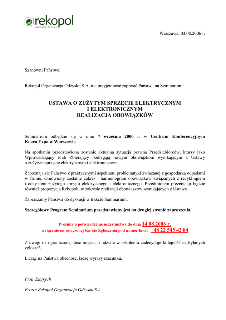 Warszawa, 03.08.2006 r. Szanowni Państwo, Rekopol Organizacja Odzysku S.A. ma przyjemność zaprosić Państwa na Seminarium: USTAWA O ZUśYTYM SPRZĘCIE ELEKTRYCZNYM I ELEKTRONICZNYM REALIZACJA OBOWIĄZKÓW Seminarium odbędzie się w dniu 7 września 2006 r. w Centrum Konferencyjnym Koara Expo w Warszawie. Na spotkaniu przedstawiona zostanie aktualna sytuacja prawna Przedsiębiorców, którzy jako Wprowadzający i/lub Zbierający podlegają nowym obowiązkom wynikającym z Ustawy o zuŜytym sprzęcie elektrycznym i elektronicznym. Zapoznają się Państwo z praktycznymi aspektami problematyki związanej z gospodarką odpadami w firmie. Omówiony zostanie zakres i harmonogram obowiązków związanych z recyklingiem i odzyskem zuŜytego sprzętu elektrycznego i elektronicznego. Przedmiotem prezentacji będzie równieŜ propozycja Rekopolu w zakresie realizacji obowiązków wynikających z Ustawy. Zapraszamy Państwa do dyskusji w trakcie Seminarium. Szczegółowy Program Seminarium przedstawiony jest na drugiej stronie zaproszenia. Prosimy o potwierdzenie uczestnictwa do dnia 14.08.2006 r. wyłącznie na załączonej Karcie Zgłoszenia pod numer faksu +48 22 545 42 84 Z uwagi na ograniczoną ilość miejsc, o udziale w szkoleniu zadecyduje kolejność nadsyłanych zgłoszeń. Licząc na Państwa obecność, łączę wyrazy szacunku, Piotr Szajrych Prezes Rekopol Organizacja Odzysku S.A. -----------------------------------------------------------------------------------------------------------------Informacje dodatkowe: Osoba do kontaktu: Marta Górska, tel. (22) 545 42 80 w.120 E-mail: [email protected] Organizator Seminarium: Rekopol Organizacja Odzysku S.A. ul. Domaniewska 47, 02-672 Warszawa tel.: (22) 545 42 80, Fax: (22) 545 42 84, E-mail: [email protected] Miejsce Seminarium: Centrum Konferencyjne Koara Expo, ul. Poligonowa30, Warszawa (mapa dojazdu w załączeniu). -------------------------------------------------------------------------------------------------------------------- Program Seminarium 7 września 2006 Warszawa 1 Planowane rozpoczęcie godz.10.00 Powitanie Gości 2 3 Czas 10.00-10.05 Piotr Szajrych Prezes Zarządu Rekopol Organizacja Odzysku S.A. Ustawa o zuŜytym sprzęcie elektrycznym i elektronicznym – formalno - prawne aspekty realizacji obowiązków 10.05 – 10.50 Prowadzący: Tomasz Rudyk, Cezary Sowiński PricewaterhouseCoopers Rejestr ZuŜytego Sprzętu Elektrycznego i Elektronicznego 4 Prowadzący: Małgorzata Tomczak Główny Inspektorat Ochrony Środowiska 5 Dyskusja, pytania 6 Lunch Krajowy System zbiórki, recyklingu i odzysku zuŜytego sprzętu elektrycznego i elektronicznego 7 8 10.50 – 11.35 11.35-12.00 12.00-13.00 13.00-13.30 Prowadzący: dr inŜ. Ireneusz Baic Kierownik projektu „Krajowego Systemu Zbiórki i Utylizacji Odpadów Sprzętu Elektrycznego i Elektronicznego” IMBiGS Centrum Gospodarki Odpadami Rekopol Organizacja Odzysku – budowa systemu zbiórki, recyklingu oraz odzysku zuŜytego sprzętu elektrycznego i elektronicznego 13.30 – 14.30 Prowadzący: Rekopol Organizacja Odzysku S.A. 9 Dyskusja, pytania 14.30 – 15.00