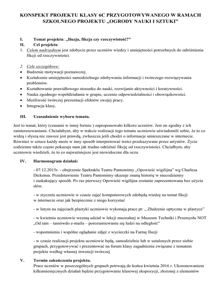 KONSPEKT PROJEKTU KLASY 6C PRZYGOTOWYWANEGO W RAMACH SZKOLNEGO PROJEKTU „OGRODY NAUKI I SZTUKI” I. Temat projektu: „Iluzja, fikcja czy rzeczywistość?” II. Cel projektu: 1. Celem nadrzędnym jest zdobycie przez uczniów wiedzy i umiejętności potrzebnych do odróżnienia fikcji od rzeczywistości. 2. Cele szczegółowe: Budzenie motywacji poznawczej. Kształcenie umiejętności samodzielnego zdobywania informacji i twórczego rozwiązywania problemów. Kształtowanie prawidłowego stosunku do nauki, rozwijanie aktywności i kreatywności. Nauka zgodnego współdziałania w grupie, uczenie odpowiedzialności i obowiązkowości. Możliwość twórczej prezentacji efektów swojej pracy. Integracja klasy. III. Uzasadnienie wyboru tematu. Jest to temat, który (czasami w innej formie ) zaproponowało kilkoro uczniów. Jest on zgodny z ich zainteresowaniami. Chciałabym, aby w trakcie realizacji tego tematu uczniowie uświadomili sobie, że to co widzą i słyszą nie zawsze jest prawdą, zwłaszcza jeśli chodzi o informacje umieszczane w internecie. Również w sztuce każdy może w inny sposób interpretować treści przekazywane przez artystów. Życie codzienne także często pokazuje nam jak trudno odróżnić fikcję od rzeczywistości. Chciałbym, aby uczniowie wiedzieli, że to co najważniejsze jest niewidoczne dla oczu IV. Harmonogram działań: - 07.12.2015r. - obejrzenie Spektaklu Teatru Pantomimy „Opowieść wigilijna” wg Charlesa Dickensa. Przedstawienie Teatru Pantomimy ukazuje znaną historię w niecodzienny i zaskakujący sposób. Po raz pierwszy Opowieść wigilijna zostanie zaprezentowana bez użycia słów. - w styczniu uczniowie w czasie zajęć komputerowych zdobędą wiedzę na temat fikcji w internecie oraz jak bezpiecznie z niego korzystać - w lutym na zajęciach plastyki uczniowie wykonają prace pt: „ Złudzenie optyczne w plastyce” - w kwietniu uczniowie wezmą udział w lekcji muzealnej w Muzeum Techniki i Przemysłu NOT „Od tam – tamówdo e-maila – porozumiewaniu się ludzi na odległość” - wspomnienia i wspólne oglądanie zdjęć z wycieczki na Farmę Iluzji - w czasie realizacji projektu uczniowie będą, samodzielnie lub w ustalonych przez siebie grupach, przygotowywać i prezentować na forum klasy zagadnienia związane z tematem projektu według własnej inwencji twórczej V. Termin zakończenia projektu. Prace uczniów w poszczególnych grupach potrwają do końca kwietnia 2016 r. Ukoronowaniem kilkumiesięcznych działań będzie przygotowanie klasowej ekspozycji, złożonej z elementów przygotowanych przez poszczególne grupy na szkolną galęprojektów oraz dzień później, kiedy to odbędzie się piknik rodzinny. VI. Planowane efekty działań: Wiedza i umiejętności zdobyte przez uczniów. Modele, makiety, plansze, multimedia (prezentacje, film), które w przyszłości będzie można wykorzystać na innych lekcjach Najważniejszy efekt podjętych działań w ramach tego projektu na daną chwilę nie będzie mierzalny, ale w dalszym życiu uczniów bardzo ważny VII. Sposób oceny projektu. Ocenie podlegać będą zarówno konkretne, materialne efekty pracy, jak i umiejętność zgodnej i efektywnej pracy w grupie. Zaangażowanie uczniów w realizację podjętych zadań znajdzie odzwierciedlenie w ocenie z zachowania na koniec roku szkolnego, ewentualnie w ocenie z plastyki i informatyki (po uprzednim uzgodnieniu z nauczycielami uczącymi klasę 6c tych przedmiotów). Bardzo ważną nagrodą będzie też zainteresowanie i pozytywne komentarze wszystkich osób odwiedzających ekspozycję przygotowaną przez uczniów w ramach projektu. wychowawca klasy Dorota Lenarczyk