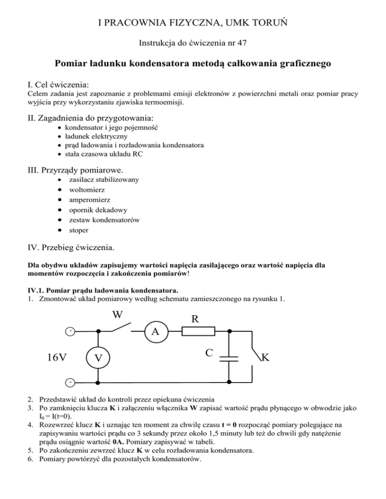 I PRACOWNIA FIZYCZNA, UMK TORUŃ Instrukcja do ćwiczenia nr 47 Pomiar ładunku kondensatora metodą całkowania graficznego I. Cel ćwiczenia: Celem zadania jest zapoznanie z problemami emisji elektronów z powierzchni metali oraz pomiar pracy wyjścia przy wykorzystaniu zjawiska termoemisji. II. Zagadnienia do przygotowania: kondensator i jego pojemność ładunek elektryczny prąd ładowania i rozładowania kondensatora stała czasowa układu RC III. Przyrządy pomiarowe. zasilacz stabilizowany woltomierz amperomierz opornik dekadowy zestaw kondensatorów stoper IV. Przebieg ćwiczenia. Dla obydwu układów zapisujemy wartości napięcia zasilającego oraz wartość napięcia dla momentów rozpoczęcia i zakończenia pomiarów! IV.1. Pomiar prądu ładowania kondensatora. 1. Zmontować układ pomiarowy według schematu zamieszczonego na rysunku 1. W A + 16V R V C K 2. Przedstawić układ do kontroli przez opiekuna ćwiczenia 3. Po zamknięciu klucza K i załączeniu włącznika W zapisać wartość prądu płynącego w obwodzie jako I0 = I(t=0). 4. Rozewrzeć klucz K i uznając ten moment za chwilę czasu t = 0 rozpocząć pomiary polegające na zapisywaniu wartości prądu co 3 sekundy przez około 1,5 minuty lub też do chwili gdy natężenie prądu osiągnie wartość 0A. Pomiary zapisywać w tabeli. 5. Po zakończeniu zewrzeć klucz K w celu rozładowania kondensatora. 6. Pomiary powtórzyć dla pozostałych kondensatorów. CZAS[s] 0 3 6 9 12 15 18 .... 90 Seria 1 Seria 2 Seria 3 Seria 4 Seria 5 Wartość średnia IV.2. Pomiar prądu rozładowania kondesatora 1. Zmontować układ pomiarowy według schematu zamieszczonego na rysunku 2 W R + 16V C V A 2. Przedstawić układ do kontroli przez opiekuna ćwiczenia 3. Zamknąć włącznik W i zapisać wartość prądu płynącego w obwodzie jako I0 = I(t=0). 4. Rozewrzeć klucz W i uznając ten moment za chwilę czasu t = 0 rozpocząć pomiary polegające na zapisywaniu wartości prądu co 3 sekundy przez około 1,5 minuty lub też do chwili gdy natężenie prądu osiągnie wartość 0A. Pomiary zapisywać w tabeli. 5. Po zakończeniu zewrzeć klucz K w celu rozładowania kondensatora. 6. Pomiary powtórzyć dla pozostałych kondensatorów. CZAS[s] 0 3 6 9 12 15 18 .... 90 Seria 1 Seria 2 Seria 3 Seria 4 Seria 5 Wartość średnia V. Opracowanie wyników. 1. Sporządzić wykresy średniego prądu ładowania i rozładowania funkcji czasu iśr(t) = f(t) oraz ln(iśr(t)) = f(t) 2. Na podstawie wykresów obliczyć ładunek zgromadzony na kondensatorze metodą całkowania graficznego 3. Metodą regresji liniowej wyznaczyć współczynnik kierunkowy i na jego podstawie obliczyć pojemność kondensatora a = 1 / RC 4. Dla obu metod określić błędy pomiarowe (przy pomiarze czasu nie uwzględniając czasu reakcji VII. Literatura: J. Orear, Fizyka, WNT, Warszawa 1998 H. Szydłowski, Pracownia fizyczna, PWN, Warszawa, 1999 A. Zawadzki, H. Hofmokl, Laboratorium Fizyczne, PWN, Warszawa, 1968