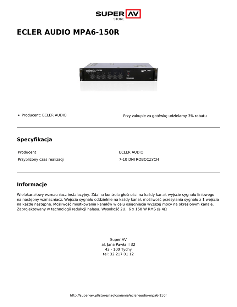 ECLER AUDIO MPA6-150R Producent: ECLER AUDIO Przy zakupie za gotówkę udzielamy 3% rabatu Specyfikacja Producent ECLER AUDIO Przybliżony czas realizacji 7-10 DNI ROBOCZYCH Informacje Wielokanałowy wzmacniacz instalacyjny. Zdalna kontrola głośności na każdy kanał, wyjście sygnału liniowego na następny wzmacniacz. Wejścia sygnału oddzielnie na każdy kanał, możliwość przesyłania sygnału z 1 wejścia na każde następne. Możliwość mostkowania kanałów w celu osiągnięcia wyższej mocy na określonym kanale. Zaprojektowany w technologii redukcji hałasu. Wysokość 2U. 6 x 150 W RMS @ 4Ω Super AV al. Jana Pawła II 32 43 - 100 Tychy tel: 32 217 01 12 http://super-av.pl/store/naglosnienie/ecler-audio-mpa6-150r
