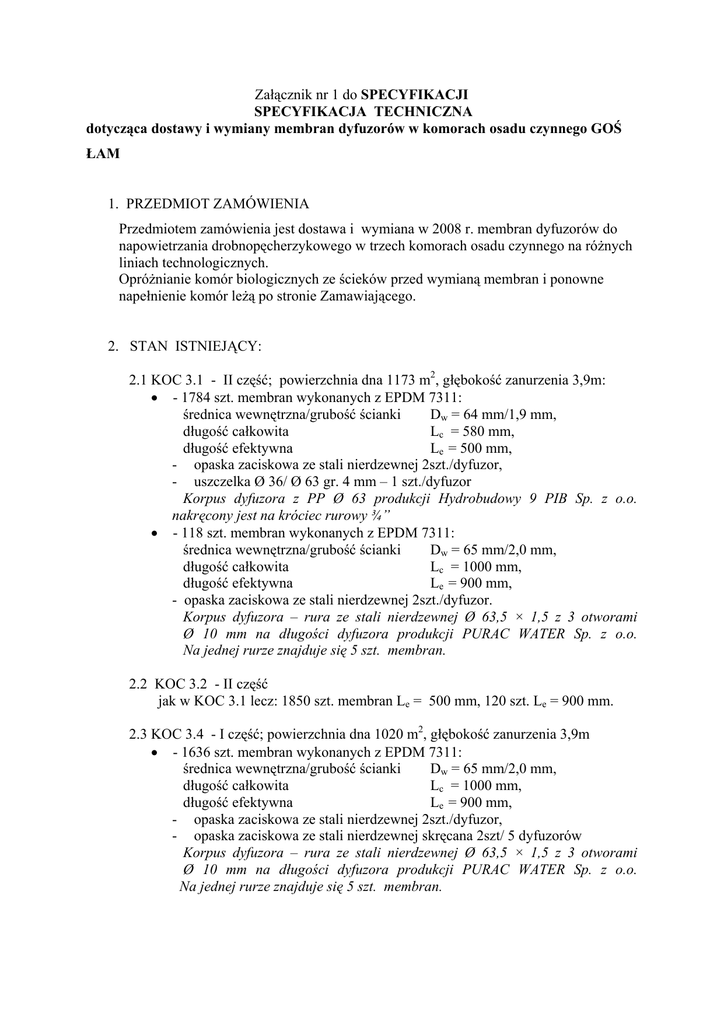 Załącznik nr 1 do SPECYFIKACJI SPECYFIKACJA TECHNICZNA dotycząca dostawy i wymiany membran dyfuzorów w komorach osadu czynnego GOŚ ŁAM 1. PRZEDMIOT ZAMÓWIENIA Przedmiotem zamówienia jest dostawa i wymiana w 2008 r. membran dyfuzorów do napowietrzania drobnopęcherzykowego w trzech komorach osadu czynnego na różnych liniach technologicznych. Opróżnianie komór biologicznych ze ścieków przed wymianą membran i ponowne napełnienie komór leżą po stronie Zamawiającego. 2. STAN ISTNIEJĄCY: 2.1 KOC 3.1 - II część; powierzchnia dna 1173 m2, głębokość zanurzenia 3,9m: • - 1784 szt. membran wykonanych z EPDM 7311: średnica wewnętrzna/grubość ścianki Dw = 64 mm/1,9 mm, długość całkowita Lc = 580 mm, długość efektywna Le = 500 mm, - opaska zaciskowa ze stali nierdzewnej 2szt./dyfuzor, - uszczelka Ø 36/ Ø 63 gr. 4 mm – 1 szt./dyfuzor Korpus dyfuzora z PP Ø 63 produkcji Hydrobudowy 9 PIB Sp. z o.o. nakręcony jest na króciec rurowy ¾” • - 118 szt. membran wykonanych z EPDM 7311: średnica wewnętrzna/grubość ścianki Dw = 65 mm/2,0 mm, długość całkowita Lc = 1000 mm, długość efektywna Le = 900 mm, - opaska zaciskowa ze stali nierdzewnej 2szt./dyfuzor. Korpus dyfuzora – rura ze stali nierdzewnej Ø 63,5 × 1,5 z 3 otworami Ø 10 mm na długości dyfuzora produkcji PURAC WATER Sp. z o.o. Na jednej rurze znajduje się 5 szt. membran. 2.2 KOC 3.2 - II część jak w KOC 3.1 lecz: 1850 szt. membran Le = 500 mm, 120 szt. Le = 900 mm. 2.3 KOC 3.4 - I część; powierzchnia dna 1020 m2, głębokość zanurzenia 3,9m • - 1636 szt. membran wykonanych z EPDM 7311: średnica wewnętrzna/grubość ścianki Dw = 65 mm/2,0 mm, długość całkowita Lc = 1000 mm, długość efektywna Le = 900 mm, - opaska zaciskowa ze stali nierdzewnej 2szt./dyfuzor, - opaska zaciskowa ze stali nierdzewnej skręcana 2szt/ 5 dyfuzorów Korpus dyfuzora – rura ze stali nierdzewnej Ø 63,5 × 1,5 z 3 otworami Ø 10 mm na długości dyfuzora produkcji PURAC WATER Sp. z o.o. Na jednej rurze znajduje się 5 szt. membran. 3. PARAMETRY ŚCIEKÓW Średnie wartości wskaźników jakości ścieków dopływających do komór osadu czynnego w 2007 r. wyniosły: - odczyn 7,74 pH, - zawiesina ogólna 164,14 mg/dm3, - substancje rozpuszczone 947,57 mg/dm3, - sucha pozostałość 1095,75 mg/dm3, - BZT-5 194,88 mg/dm3, - ChZT 444,63 mg/dm3, - azot ogólny 49,71 mg/dm3, - azot amonowy 39,62 mg/dm3, - fosfor ogólny 8,51 mg/dm3, - siarczany 78,23 mg/dm3, - chlorki 215,69 mg/dm3, - ekstrakt eterowy 31,44 mg/dm3, - przewodnictwo 1540,80 µS/cm, - zasadowość 411,92 mg/dm3, - detergenty anionowe 2,92 mg/dm3. Udział ścieków przemysłowych z dominującą składową z przemysłu tekstylnego (farbiarstwo) w ściekach pogody suchej wynosi około 15.9 %. 4. WYMAGANIA TECHNICZNE - dobór membran w zakresie mieszanki gumowej i jej pozostałych parametrów gwarantujący ich przydatność do podanego składu ścieków i wymiarów korpusów dyfuzorów określa Wykonawca (pojęcie mieszanki gumowej obejmuje także kauczuk silikonowy), - wymagany zakres wydajności dyfuzora 2 do 12 Nm3/ m×h, - strata ciśnienia na nowej membranie przy 9 Nm3/m×h, - nie większa niż 60 mbar, - maksymalna kurczliwość membrany – 3%, - jednostkowy stopień wprowadzenia tlenu (dla wody) przy 9 Nm3/m×h min. 18 gO2/Nm3 × mzanurzenia ,