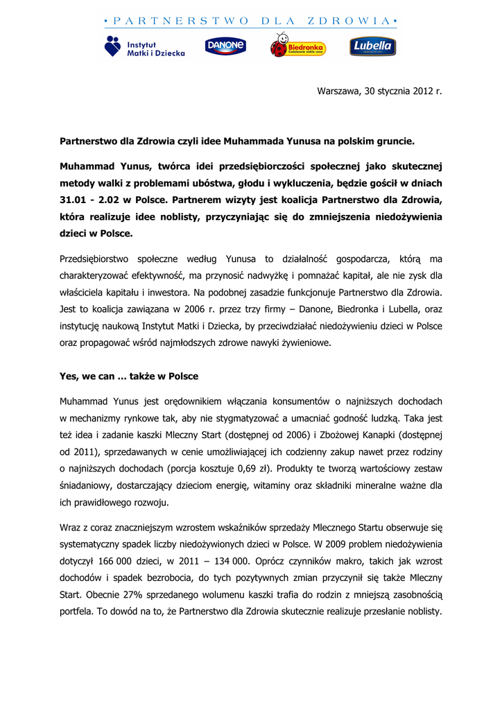 Warszawa, 30 stycznia 2012 r. Partnerstwo dla Zdrowia czyli idee Muhammada Yunusa na polskim gruncie. Muhammad Yunus, twórca idei przedsiębiorczości społecznej jako skutecznej metody walki z problemami ubóstwa, głodu i wykluczenia, będzie gościł w dniach 31.01 - 2.02 w Polsce. Partnerem wizyty jest koalicja Partnerstwo dla Zdrowia, która realizuje idee noblisty, przyczyniając się do zmniejszenia niedoŜywienia dzieci w Polsce. Przedsiębiorstwo społeczne według Yunusa to działalność gospodarcza, którą ma charakteryzować efektywność, ma przynosić nadwyŜkę i pomnaŜać kapitał, ale nie zysk dla właściciela kapitału i inwestora. Na podobnej zasadzie funkcjonuje Partnerstwo dla Zdrowia. Jest to koalicja zawiązana w 2006 r. przez trzy firmy – Danone, Biedronka i Lubella, oraz instytucję naukową Instytut Matki i Dziecka, by przeciwdziałać niedoŜywieniu dzieci w Polsce oraz propagować wśród najmłodszych zdrowe nawyki Ŝywieniowe. Yes, we can … takŜe w Polsce Muhammad Yunus jest orędownikiem włączania konsumentów o najniŜszych dochodach w mechanizmy rynkowe tak, aby nie stygmatyzować a umacniać godność ludzką. Taka jest teŜ idea i zadanie kaszki Mleczny Start (dostępnej od 2006) i ZboŜowej Kanapki (dostępnej od 2011), sprzedawanych w cenie umoŜliwiającej ich codzienny zakup nawet przez rodziny o najniŜszych dochodach (porcja kosztuje 0,69 zł). Produkty te tworzą wartościowy zestaw śniadaniowy, dostarczający dzieciom energię, witaminy oraz składniki mineralne waŜne dla ich prawidłowego rozwoju. Wraz z coraz znaczniejszym wzrostem wskaźników sprzedaŜy Mlecznego Startu obserwuje się systematyczny spadek liczby niedoŜywionych dzieci w Polsce. W 2009 problem niedoŜywienia dotyczył 166 000 dzieci, w 2011 – 134 000. Oprócz czynników makro, takich jak wzrost dochodów i spadek bezrobocia, do tych pozytywnych zmian przyczynił się takŜe Mleczny Start. Obecnie 27% sprzedanego wolumenu kaszki trafia do rodzin z mniejszą zasobnością portfela. To dowód na to, Ŝe Partnerstwo dla Zdrowia skutecznie realizuje przesłanie noblisty. Pomagać, edukować, reinwestować Prof. Jerzy Hausner w przedmowie do polskiego wydania ksiąŜki M.Yunusa „Przedsiębiorstwo społeczne, kapitalizm dla ludzi” (wyd. Concorda 2011) podsumowuje: „Muhammad Yunus kaŜdorazowo dąŜy do realizacji określonych celów za pomocą działań gospodarczych. W centrum jego myślenia znajduje się zawsze przedsiębiorstwo społeczne. Przy czym „społecznym” nie czyni go tylko cel, któremu przedsiębiorstwo ma słuŜyć, ale teŜ przestrzeganie zasady „bez strat i bez dywidendy”. Jest to działalność gospodarcza, którą ma charakteryzować efektywność, ma przynosić nadwyŜkę i pomnaŜać kapitał, ale nie zysk dla właściciela kapitału i inwestora.” Środki ze sprzedaŜy produktów z misją społeczną są reinwestowane w dalszy rozwój koalicji. Dzięki temu moŜliwe było wprowadzenie w 2011 roku nowości - ZboŜowej Kanapki. W dniu 8 listopada 2011 r. zainicjowano teŜ program edukacyjny „Śniadanie Daje Moc”, mający docelowo dotrzeć do wszystkich szkół podstawowych w kraju i na trwałe zmieniać nawyki Ŝywieniowe dzieci. Dlaczego przeciwdziałanie niedoŜywieniu jest waŜne? Prawie ćwierć miliona (220 tys.) dzieci szkół podstawowych nie odŜywia się sposób niezbędny dla ich prawidłowego rozwoju (np. wychodzą z domu bez śniadania, przychodzą do szkoły bez drugiego śniadania, nie jedzą codziennie obiadu) a 130 tys. uczniów szkół podstawowych w Polsce cierpi z powodu niedoŜywienia 1 . MoŜe ono powodować dotkliwe konsekwencje społeczne. Skutki niedoŜywianie dziecka w wieku wczesnoszkolnym to spadek odporności i kondycji, kłopoty z nauką i koncentracją. Idą za tym często wykluczenie z grupy rówieśniczej, niskie poczucie własnej wartości, a w konsekwencji - zmniejszenie szans na rynku pracy w dorosłym Ŝyciu. Dlatego Partnerstwo dla Zdrowia zdecydowało się na działania obejmujące dwa filary – produkty z misją społeczną dedykowane dzieciom z rodzin o trudnej sytuacji materialnej oraz edukację. Polski sukces innowacyjnych rozwiązań Partnerstwa dla Zdrowia w dziedzinie produktów z misją społeczną i edukacji, moŜe być inspiracją dla innych przedsiębiorstw i instytucji. Zaszczytna rola Partnerstwa dla Zdrowia jako partnera wizyty Muhammada Yunusa w Polsce to okazja, by podzielić się wiedzą i doświadczeniem z wszystkimi, którzy chcą sięgać po ambitne i nowatorskie rozwiązania dla dobra społecznego. Muhammad Yunus wygłosi wykłady w Warszawie i Krakowie, a takŜe spotka się ze studentami, liderami opinii i specjalistami w dziedzinie biznesu społecznie odpowiedzialnego oraz z politykami i przedstawicielami biznesu. Podczas jutrzejszego, otwartego dla szerokiego grona słuchaczy, spotkania w Bibliotece Uniwersytetu Warszawskiego (godz. 18:00, sala 97) ilustracją poruszanych przez Muhammada Yunusa zagadnień będzie otwarta przez Partnerstwo dla Zdrowia wystawa produktów z misją społeczną. Nie zabraknie na niej takŜe polskich przykładów – kaszki manny oraz ZboŜowej Kanapki Mleczny Start. Kontakt prasowy: Aleksandra Lisowska Biuro prasowe Partnerstwa dla Zdrowia Garden of Words tel. (022) 829 85 72, wew. 21 e-mail: [email protected] www.mlecznystart.pl