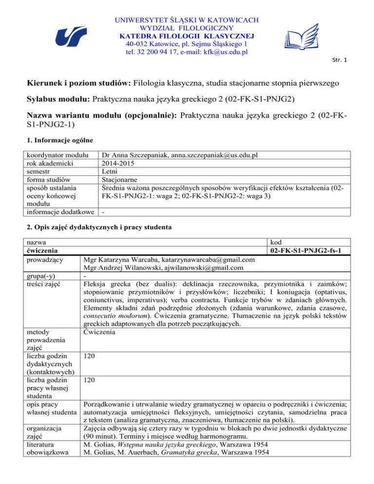 UNIWERSYTET ŚLĄSKI W KATOWICACH WYDZIAŁ FILOLOGICZNY KATEDRA FILOLOGII KLASYCZNEJ 40-032 Katowice, pl. Sejmu Śląskiego 1 tel. 32 200 94 17, e-mail: [email protected] Str. 1 Kierunek i poziom studiów: Filologia klasyczna, studia stacjonarne stopnia pierwszego Sylabus modułu: Praktyczna nauka języka greckiego 2 (02-FK-S1-PNJG2) Nazwa wariantu modułu (opcjonalnie): Praktyczna nauka języka greckiego 2 (02-FKS1-PNJG2-1) 1. Informacje ogólne koordynator modułu rok akademicki semestr forma studiów sposób ustalania oceny końcowej modułu informacje dodatkowe Dr Anna Szczepaniak, [email protected] 2014-2015 Letni Stacjonarne Średnia ważona poszczególnych sposobów weryfikacji efektów kształcenia (02FK-S1-PNJG2-1: waga 2; 02-FK-S1-PNJG2-2: waga 3) - 2. Opis zajęć dydaktycznych i pracy studenta nazwa ćwiczenia prowadzący grupa(-y) treści zajęć metody prowadzenia zajęć liczba godzin dydaktycznych (kontaktowych) liczba godzin pracy własnej studenta opis pracy własnej studenta organizacja zajęć literatura obowiązkowa kod 02-FK-S1-PNJG2-fs-1 Mgr Katarzyna Warcaba, [email protected] Mgr Andrzej Wilanowski, [email protected] Fleksja grecka (bez dualis): deklinacja rzeczownika, przymiotnika i zaimków; stopniowanie przymiotników i przysłówków; liczebniki; I koniugacja (optativus, coniunctivus, imperativus); verba contracta. Funkcje trybów w zdaniach głównych. Elementy składni zdań podrzędnie złożonych (zdania warunkowe, zdania czasowe, consecutio modorum). Ćwiczenia gramatyczne. Tłumaczenie na język polski tekstów greckich adaptowanych dla potrzeb początkujących. Ćwiczenia 120 120 Porządkowanie i utrwalanie wiedzy gramatycznej w oparciu o podręczniki i ćwiczenia; automatyzacja umiejętności fleksyjnych, umiejętności czytania, samodzielna praca z tekstem (analiza gramatyczna, znaczeniowa, tłumaczenie na polski). Zajęcia odbywają się cztery razy w tygodniu w blokach po dwie jednostki dydaktyczne (90 minut). Terminy i miejsce według harmonogramu. M. Golias, Wstępna nauka języka greckiego, Warszawa 1954 M. Golias, M. Auerbach, Gramatyka grecka, Warszawa 1954 UNIWERSYTET ŚLĄSKI W KATOWICACH WYDZIAŁ FILOLOGICZNY KATEDRA FILOLOGII KLASYCZNEJ 40-032 Katowice, pl. Sejmu Śląskiego 1 tel. 32 200 94 17, e-mail: [email protected] Str. 2 literatura uzupełniająca adres strony www zajęć informacje dodatkowe H. W. Smyth, Greek Grammar, rev. by G. M. Messing, Cambridge, MA 1956 - 3. Opis sposobów weryfikacji efektów kształcenia modułu nazwa kod Śródsemestralne testy ustne i pisemne 02-FK-S1-PNJG2-w-1 kod(-y) zajęć 02-FK-S1-PNJG2-fs-1 osoba(-y) Mgr Katarzyna Warcaba, [email protected] przeprowadzająca Mgr Andrzej Wilanowski, [email protected] (-e) weryfikację grupa(-y) wymagania Opanowanie materiału wskazanego w treściach zajęć. merytoryczne kryteria oceny Ćwiczenia kończą się zaliczeniem z oceną. Ocena końcowa jest średnią ważoną ocen umiejętności czytania, znajomości fleksji, składni, rozumienia i przekładu tekstu (waga 3) oraz pamięciowego opanowania wybranych tekstów na pamięć (waga 1). przebieg procesu Śródsemestralne testy ustne i pisemne, w tym sprawdziany umiejętności czytania weryfikacji oraz pamięciowego opanowania wybranych tekstów greckich na pamięć. informacje dodatkowe